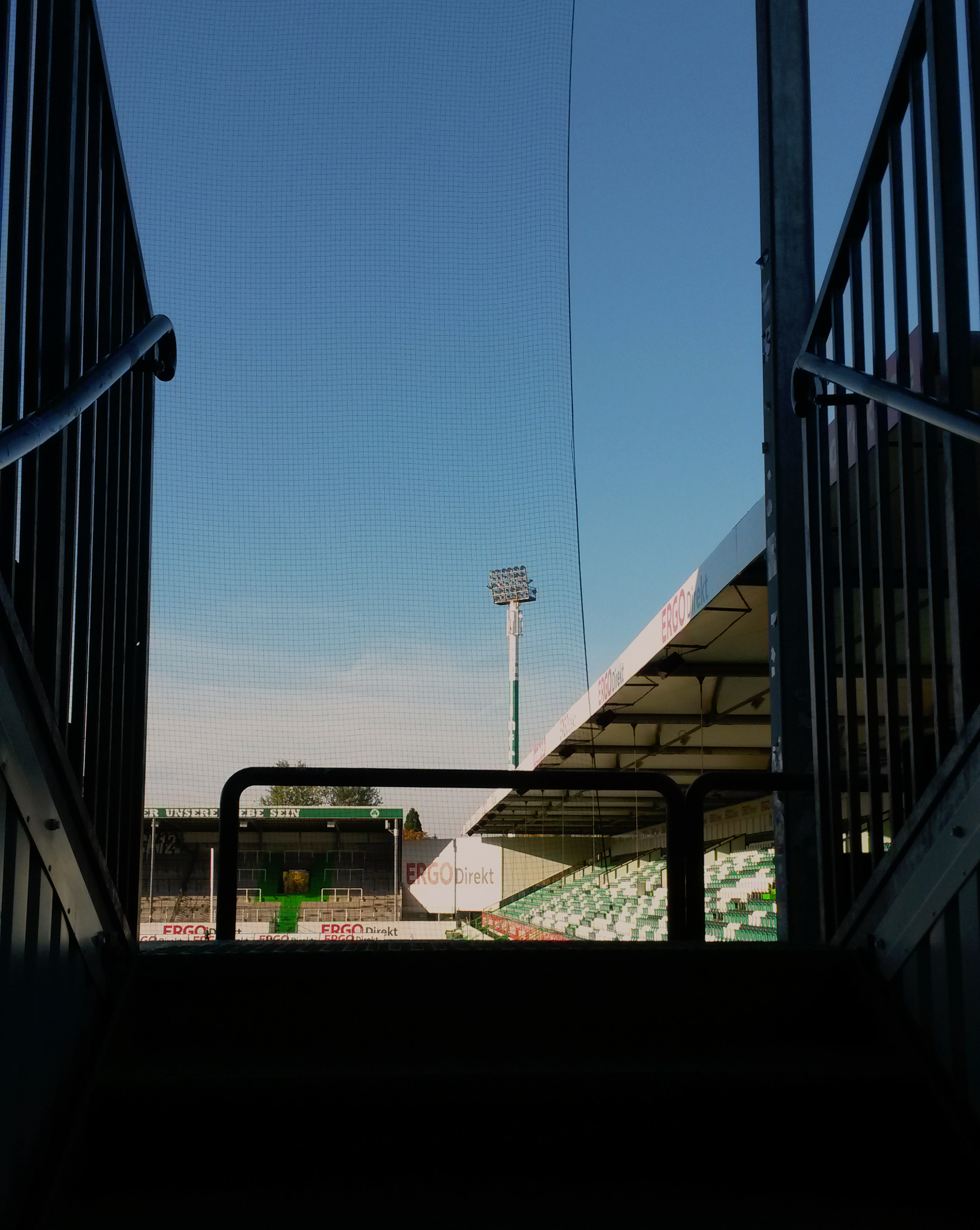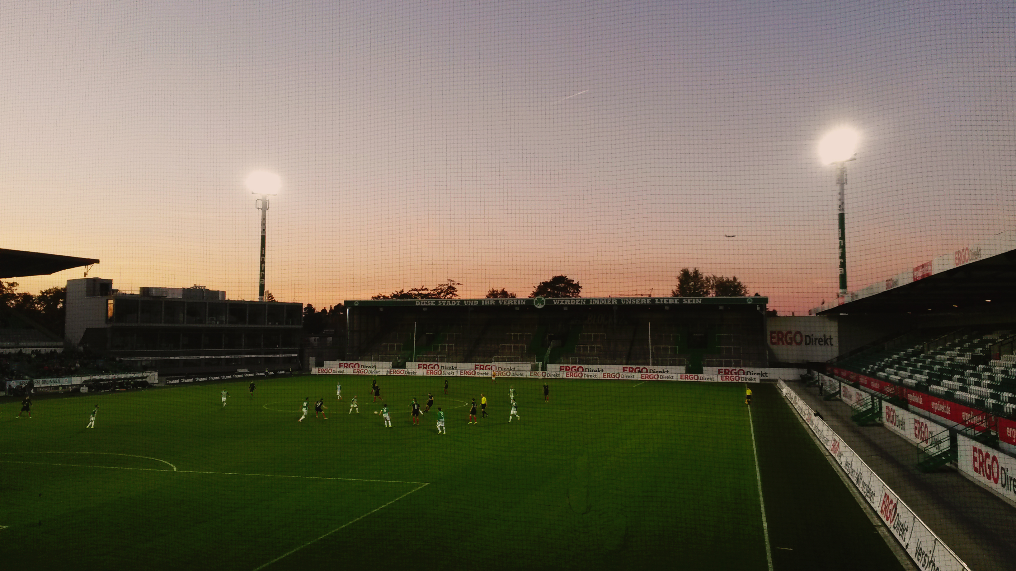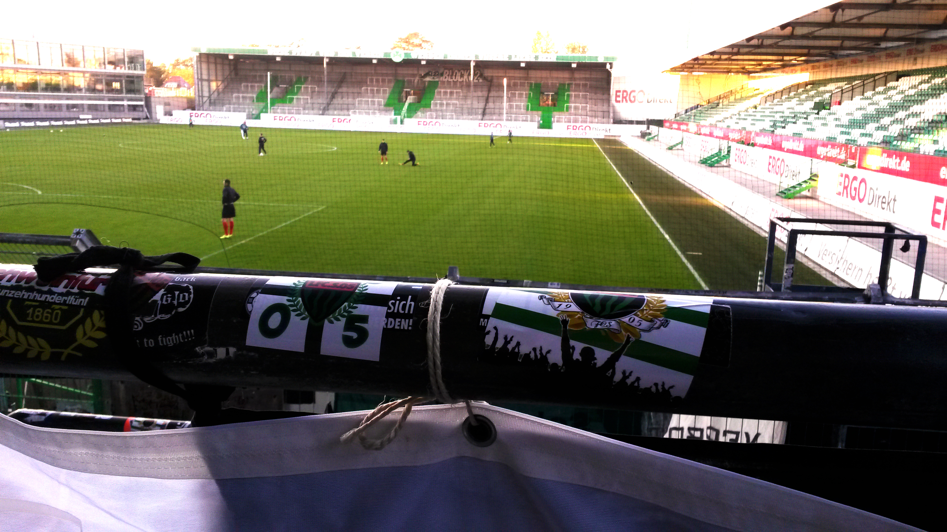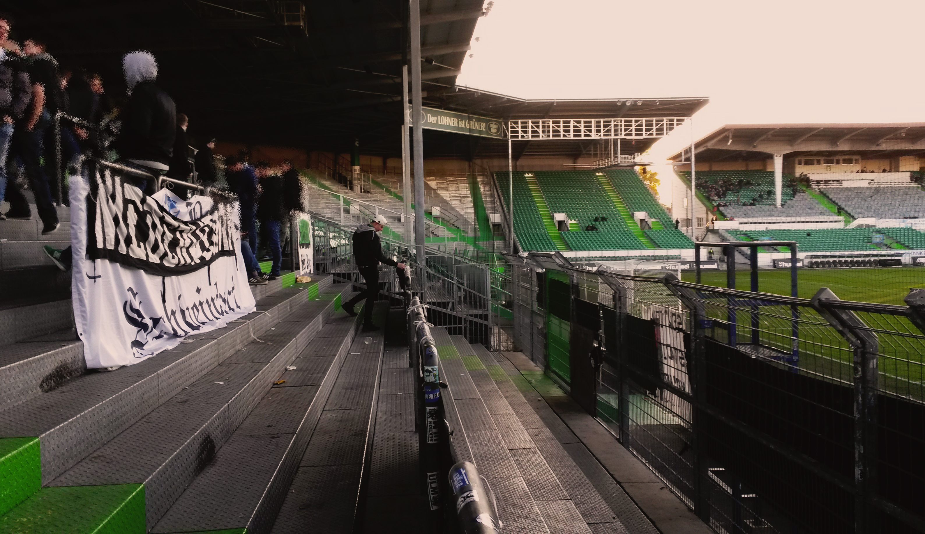 „Alle Blumen blühn, nur das Fürther Kleeblatt nicht.“ Da die Schweinfurter Blätter in diesen Herbst wohl auch eher welken und von den Bäumen (Regionalliga) zu fallen drohen, ging es an diesem Samstag zum Abstiegsgipfel der Regionalliga Bayern nach Mittelfranken: Platz 16 gegen Platz 18 versprach dabei Fussballkost vom Feinsten. Um 12:45 Uhr startete der Fan-Bus in Schweinfurt am Willy-Sachs-Stadion in Richtung Fürth. Nachdem auf einem Rastplatz nahe Bamberg noch kurz den im PKW mitreisenden Zivilbeamten „Servus“ gesagt wurde, eskortierte die Polizei unseren Bus von der Autobahn bis zum Fürther Stadion. So fühlt man sich doch gleich sicherer in diesen unruhigen Tagen. Am Stadion überraschte dann das doch recht massive Polizeiaufgebot, das eher nach zweiter denn nach vierter Liga aussah. Zum Stadion selbst: Die 18.000 Zuschauer fassende Arena ist von außen betrachtet ein Schandfleck in Containeroptik. Auch die Tribünenkonstruktion aus Stahlrohren (?) erinnert eher an Baugerüst als an eine Fussballspielstätte. Im Innenraum sorgen zumindest die grün-weißen Töne und die vielen Stehplätze für einen gewissen Charme. Mehr gibt es an dieser Stelle eigentlich nicht zu sagen.