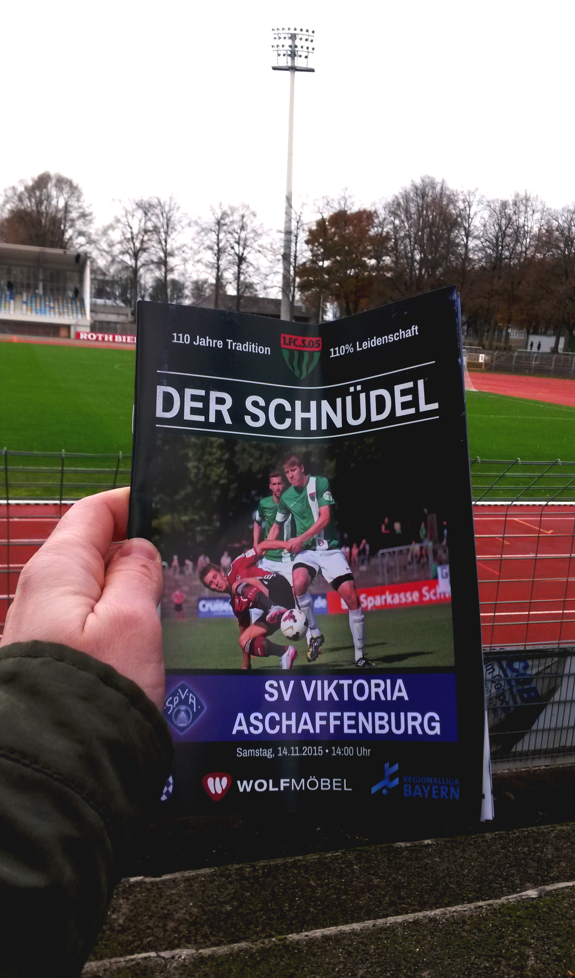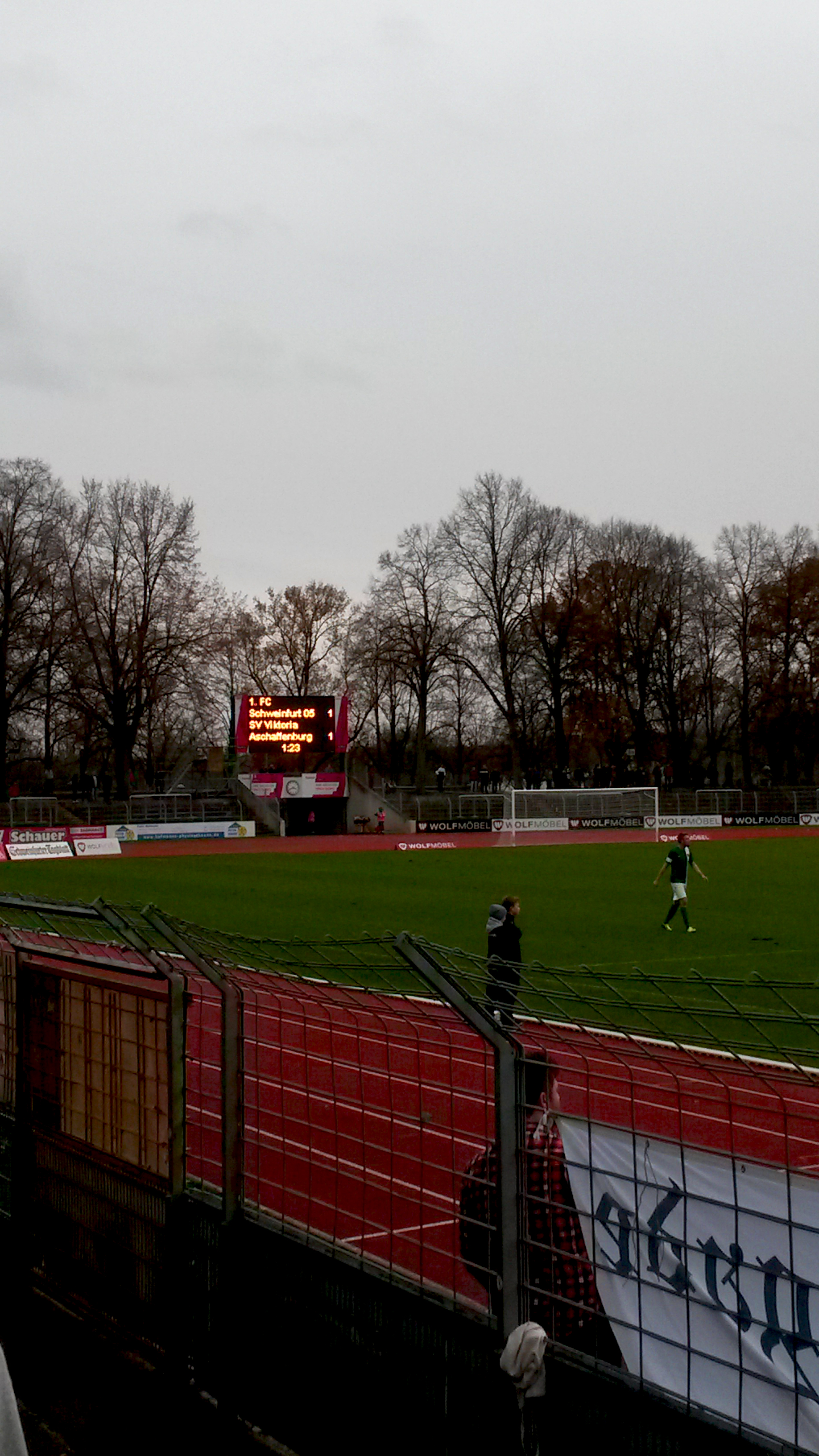 Bevor die Partie im Willy-Sachs-Stadion gegen 14 Uhr angepfiffen wurde, gab es noch eine Gedenkminute für die Opfer der Anschläge von Paris. Nachdenkliche und ergreifende Stille im weiten Rund, wenn der Sport plötzlich in den Hintergrund tritt. Dann der Pfiff. Aschaffenburg versuchte von Beginn an das Heft des Handelns in die Hand zu nehmen und zeigte dabei die reifere Spielanlage. Spielerisch sah das bei der blau-weißen Viktoria ordentlich aus; besonders „Alt-Profi“ Youssef Mokhtari wusste mit Übersicht und vielen lautstarken Kommandos aufzufallen. Auch heute fiel die Spieleröffnung der Schnüdel meist wieder durch diverse haarsträubende Abspielfehler auf, die der Gegner glücklicherweise nicht zu nutzen wusste. Schweinfurt hielt defensiv nach Kräften dagegen und so waren klare Chancen, bis auf einen Freistoß von Mokhtari, Mangelware. Den ersten richtigen Hochkaräter der Partie hatten schließlich die Hausherren kurz vor der Halbzeit, als Marino Müller alleine vor dem Kasten der Aschaffenburger auftauchte, den Ball jedoch nicht am Keeper vorbeibekommen sollte. Auch in der zweiten Halbzeit passierte vor beiden Toren nicht allzu viel Spektakuläres. Der Schweinfurter Joe Bechmann sah in der 77. Minute, in einem von vielen Fouls, Unterbrechungen und tollen schauspielerischen Einlagen geprägtem Spiel die Ampelkarte. Schweinfurt also die letzten gut 15 Minuten in Unterzahl. Zwei Minuten später ging die Viktoria durch Bari mit 1:0 in Führung, die Tom Jäckel mit einem sehenswerten Kopfballtreffer quasi im direkten Gegenzug zum insgesamt verdienten 1:1-Endstand ausgleichen konnte. Die Stimmung war in beiden Fanblöcken gut und so wurden die Mannschaften auf dem Platz über die kompletten 90 Minuten, bisweilen lautstark, unterstützt und angefeuert. Während Aschaffenburg mit dem einen Zähler im Willy-Sachs-Stadion die Kugellagerstädter letztlich auf Distanz halten kann, stagnieren die Schnüdel kurz vor der Winterpause auf einem direkten Abstiegsplatz. Besserung scheint dabei nach vier Punkten aus den letzten beiden Spielen zumindest ergebnistechnisch in Sicht. Während auch die direkten Konkurrenten aus Rain am Lech und Augsburg jeweils nur einen Punkt in Unterhaching bzw. in Nürnberg holen konnten, punktete Schalding-Heining bei den Junglöwen eher überraschend dreifach. Die Kellerteams bleiben also auch nach diesem 19. Spieltag tabellarisch eng beisammen.