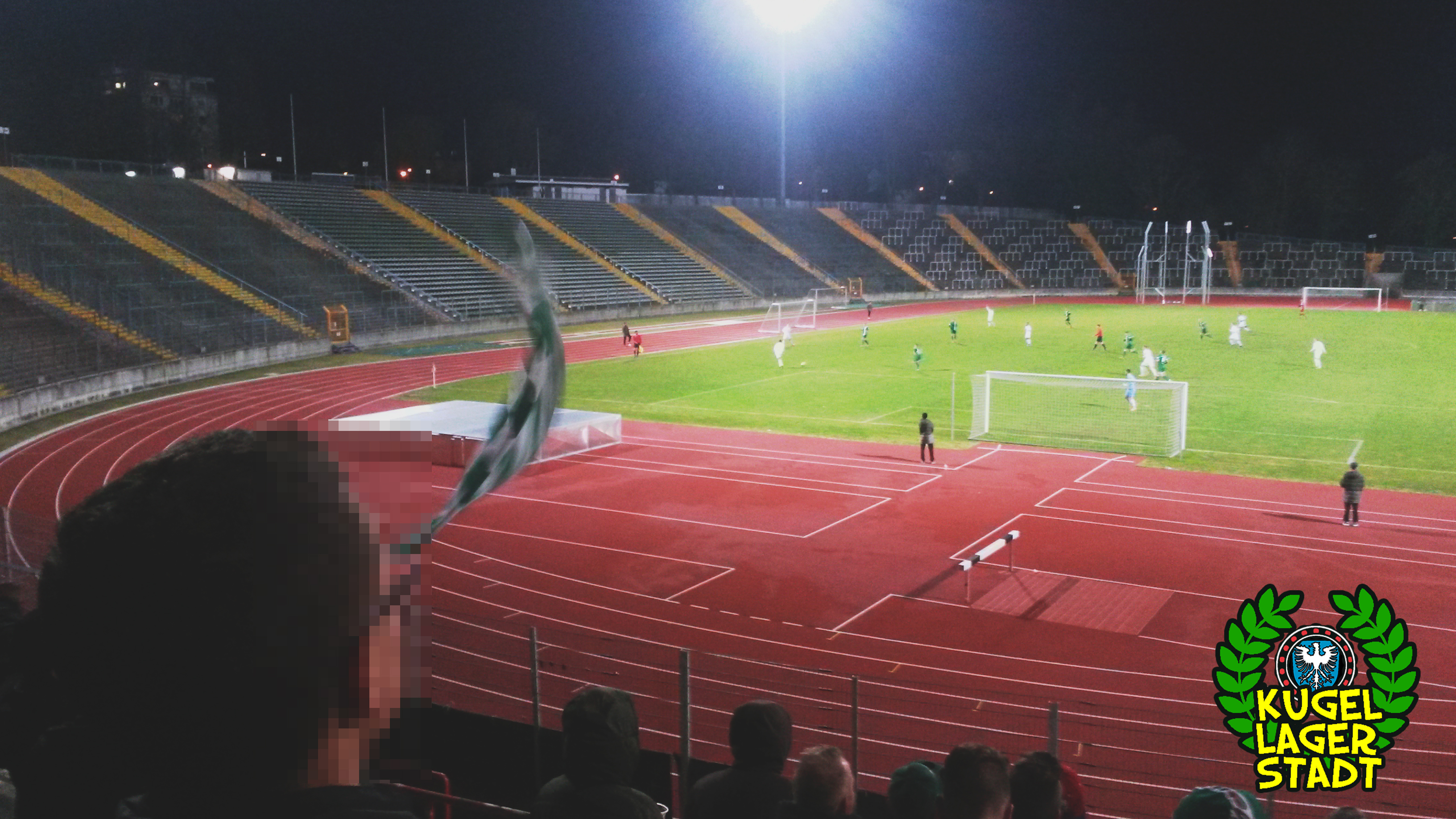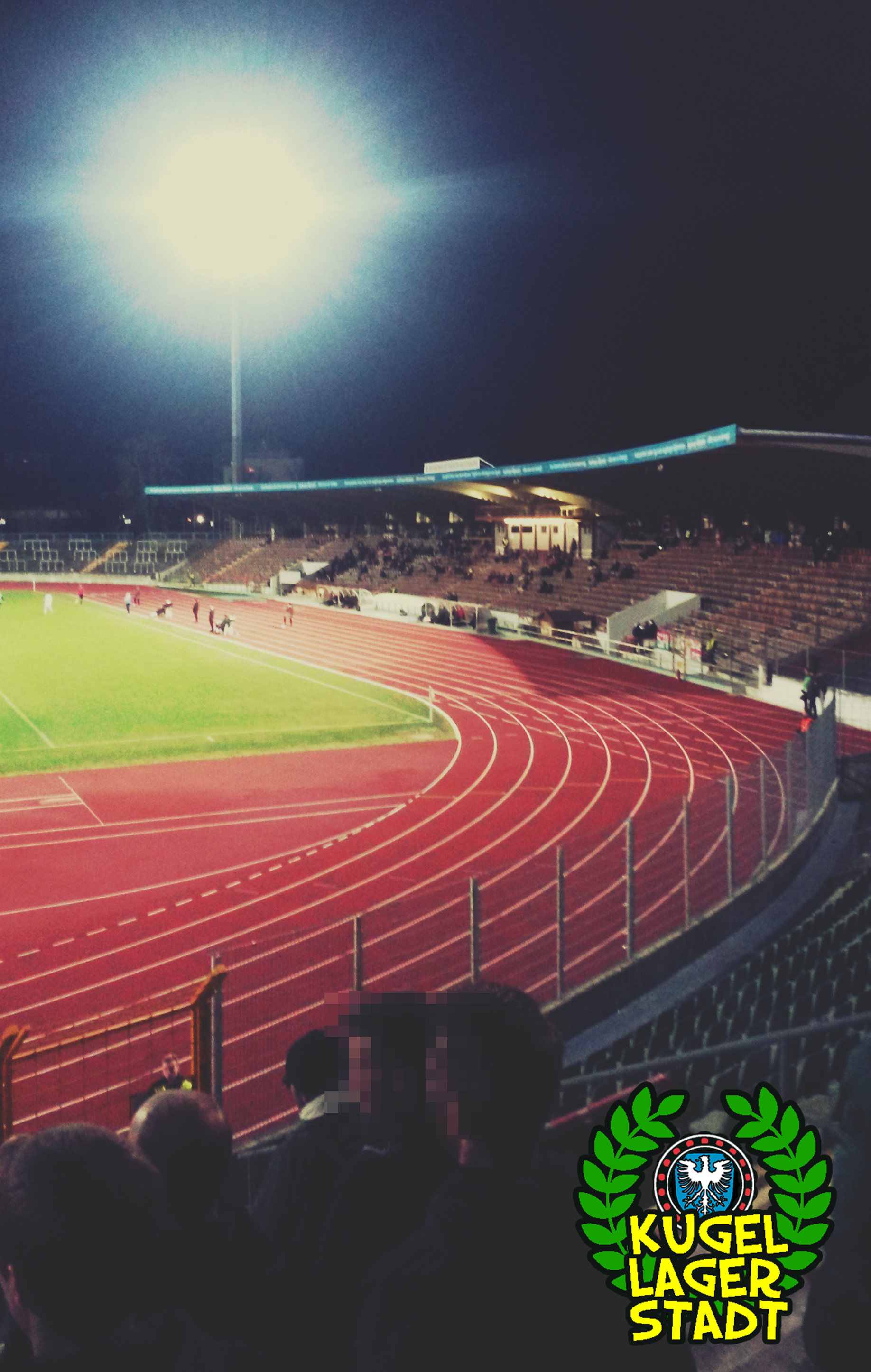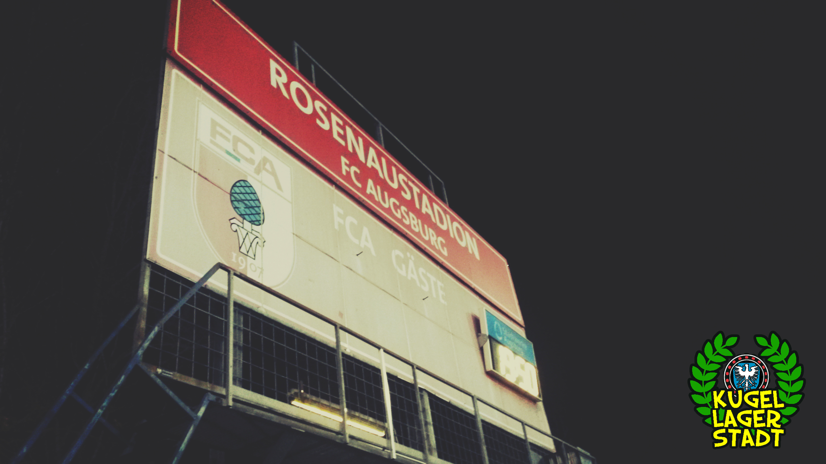 Nicht kurz vor 12, sondern kurz vor 19 Uhr, erreichten wir mit dem PKW das Augsburger Rosenaustadion. Die ermäßigte Gästeblockkarte für 5 Euro sorgte für ein Lächeln im Geldbeutel, das Brötchen mit Schweinebraten hingegen eher für Glücksgefühle in der Magengegend. Noch am Bierstand berichtete die Kickerapp per Push-Nachricht, dass die Partie angepfiffen wurde. Ca. 5 Sekunden später ertönte passend dazu auch der Pfiff des Schiedsrichters. Das Rosenaustadion, mit der gefühlt weitläufigsten Tartanbahn der Welt, erinnerte beim Betreten stark an das Münchener Olympiastadion. Der Gästeblock, direkt unter der leicht maroden Anzeigetafel gelegen, war mit ca. 60 Schnüdeln gefüllt, die die knapp 300 Kilometer nach Schwaben auf sich nahmen. Auf der Sitzplatztribüne waren vereinzelt Augsburger Zuschauer auszumachen, die jedoch vermutlich alleine von den anwesenden USK-Beamten zahlenmäßig übertroffen wurden.