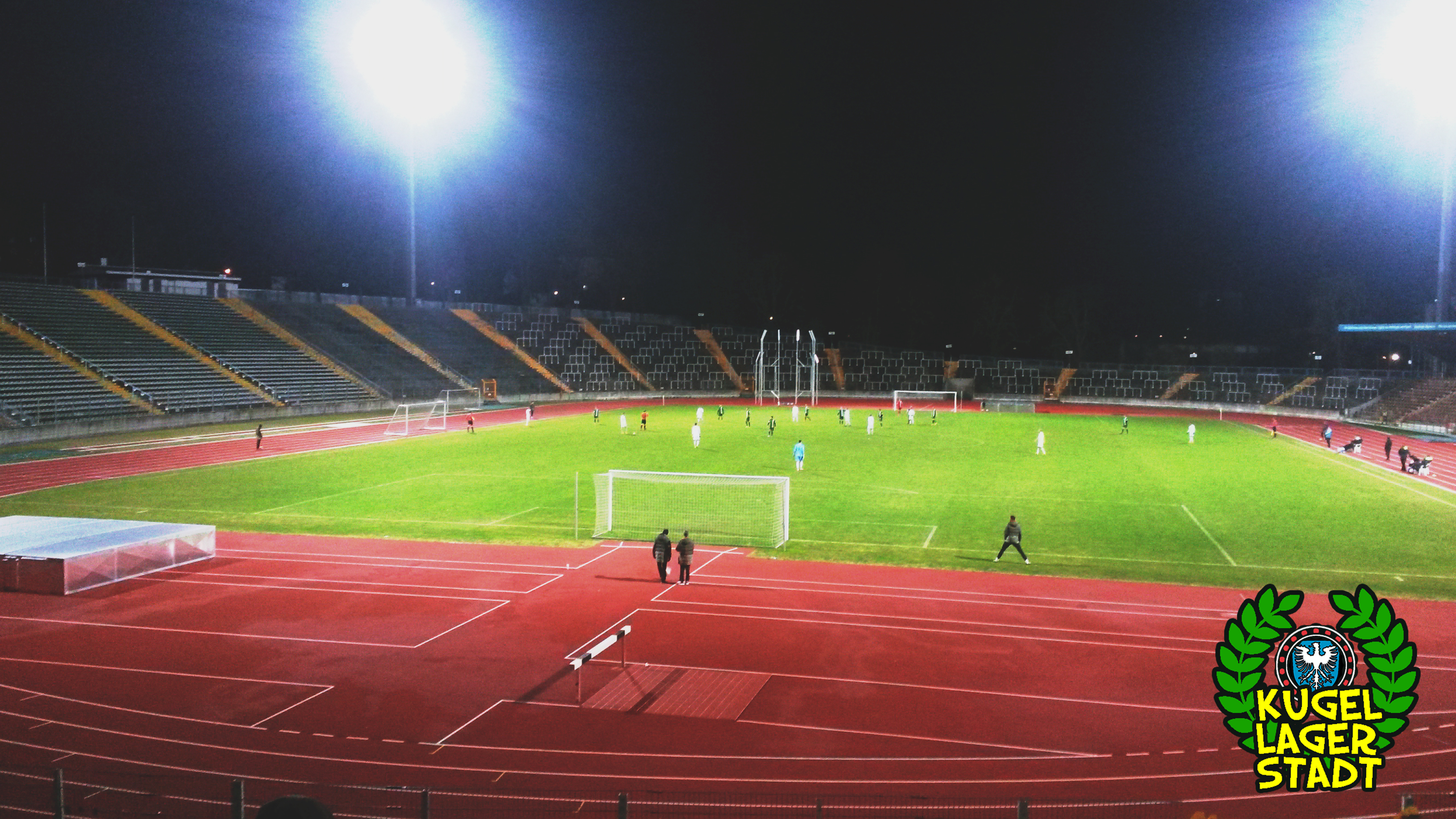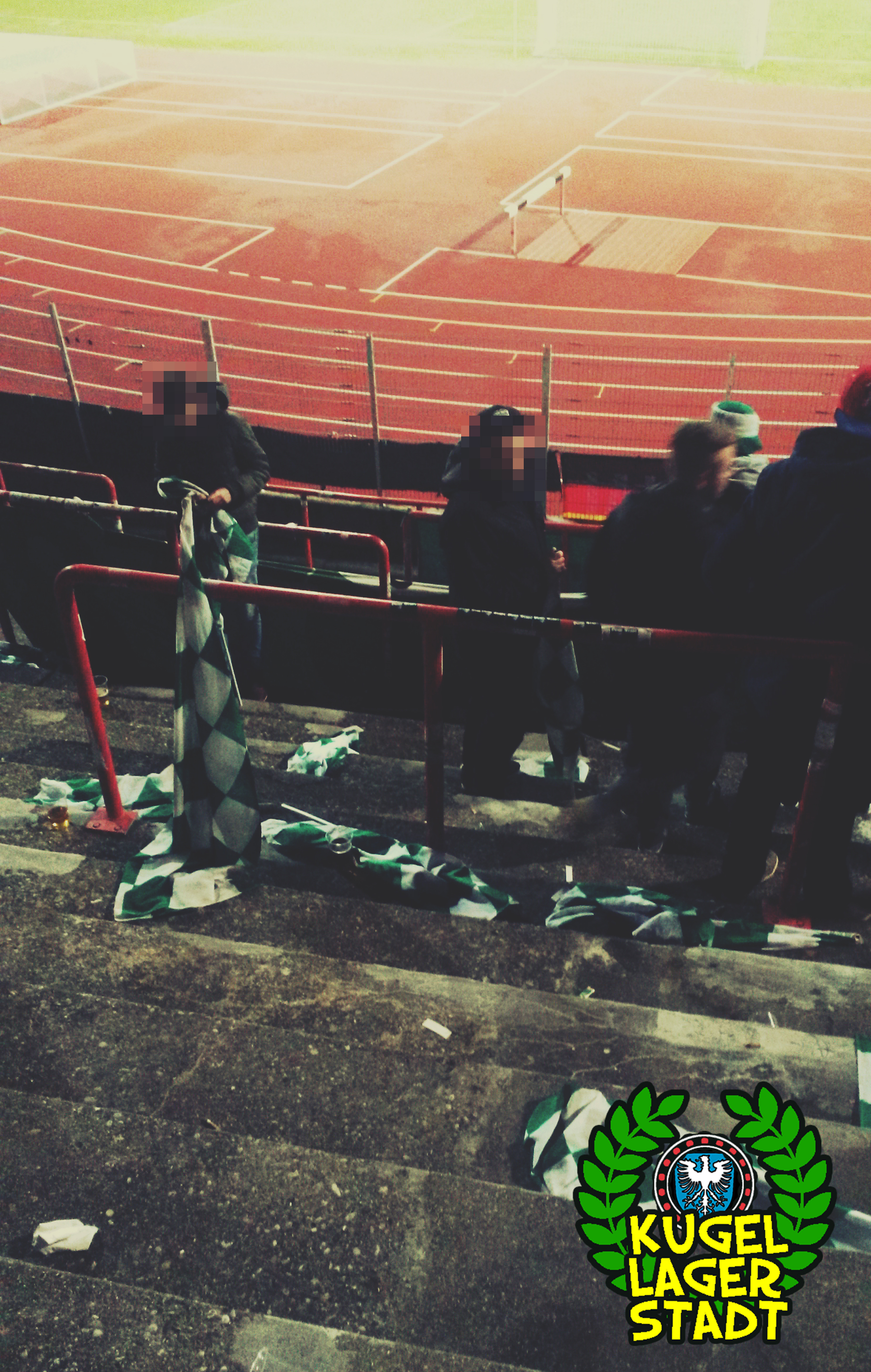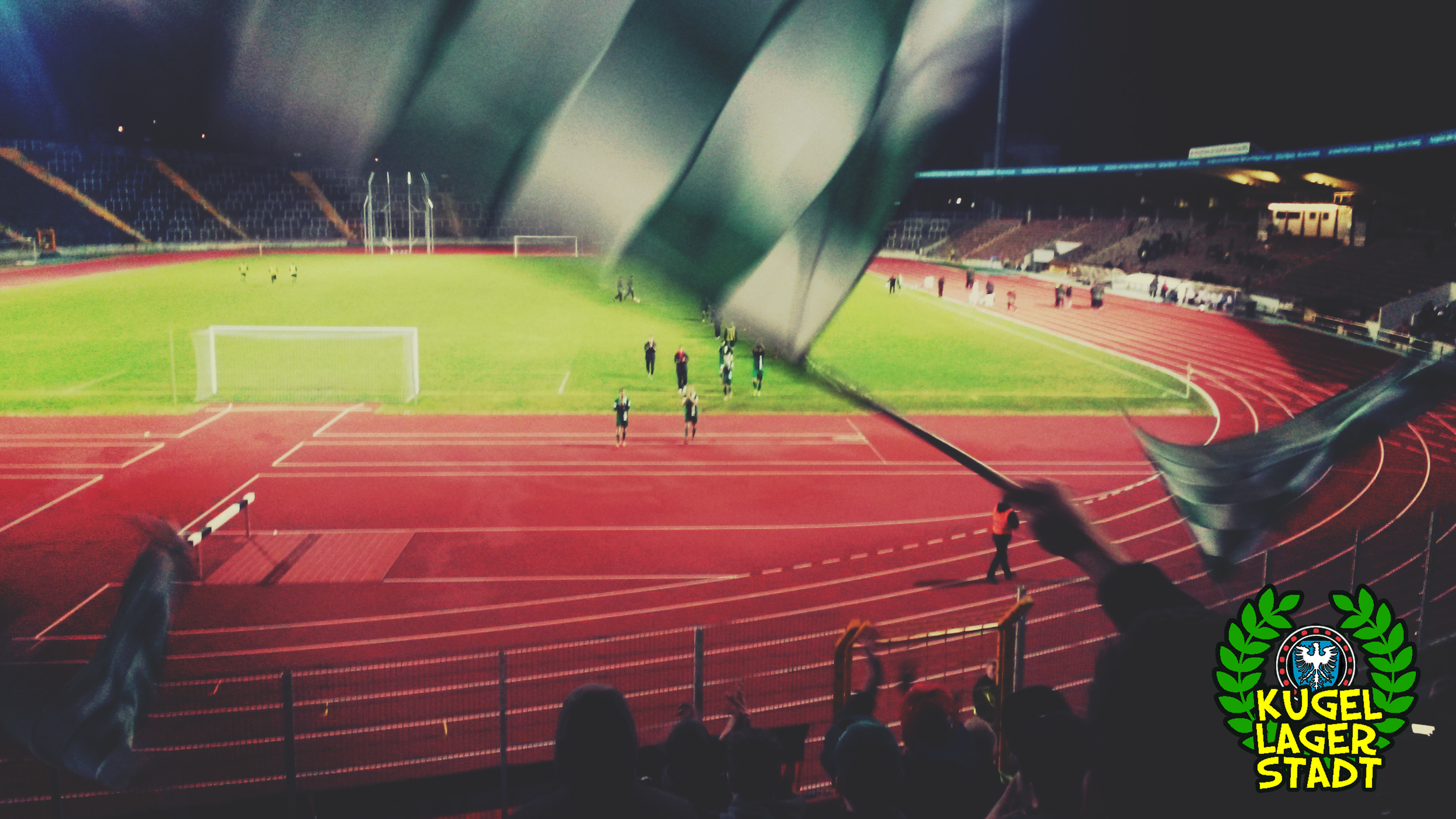 Nicht kurz vor 12, sondern kurz vor 19 Uhr, erreichten wir mit dem PKW das Augsburger Rosenaustadion. Die ermäßigte Gästeblockkarte für 5 Euro sorgte für ein Lächeln im Geldbeutel, das Brötchen mit Schweinebraten hingegen eher für Glücksgefühle in der Magengegend. Noch am Bierstand berichtete die Kickerapp per Push-Nachricht, dass die Partie angepfiffen wurde. Ca. 5 Sekunden später ertönte passend dazu auch der Pfiff des Schiedsrichters. Das Rosenaustadion, mit der gefühlt weitläufigsten Tartanbahn der Welt, erinnerte beim Betreten stark an das Münchener Olympiastadion. Der Gästeblock, direkt unter der leicht maroden Anzeigetafel gelegen, war mit ca. 60 Schnüdeln gefüllt, die die knapp 300 Kilometer nach Schwaben auf sich nahmen. Auf der Sitzplatztribüne waren vereinzelt Augsburger Zuschauer auszumachen, die jedoch vermutlich alleine von den anwesenden USK-Beamten zahlenmäßig übertroffen wurden.