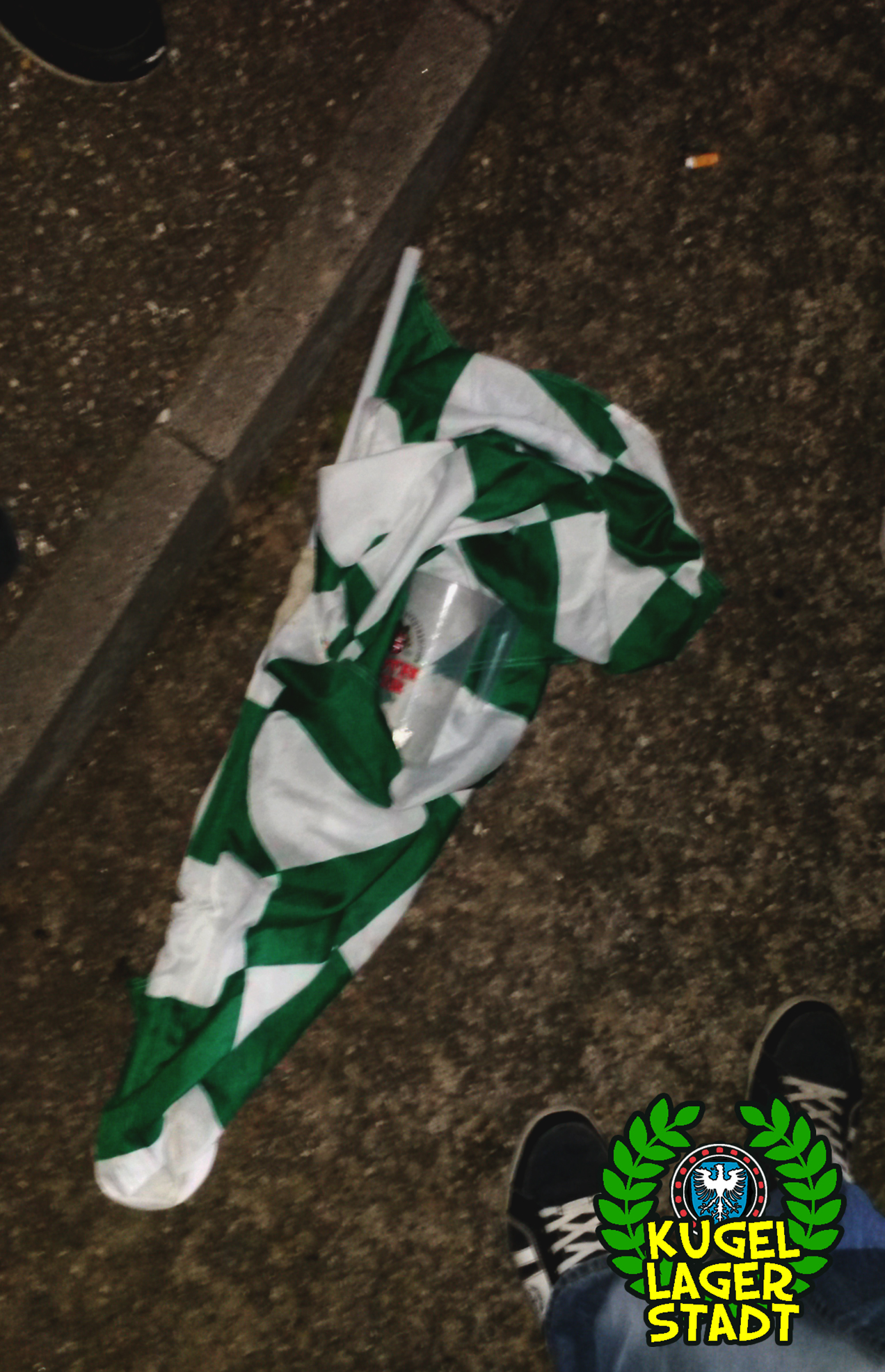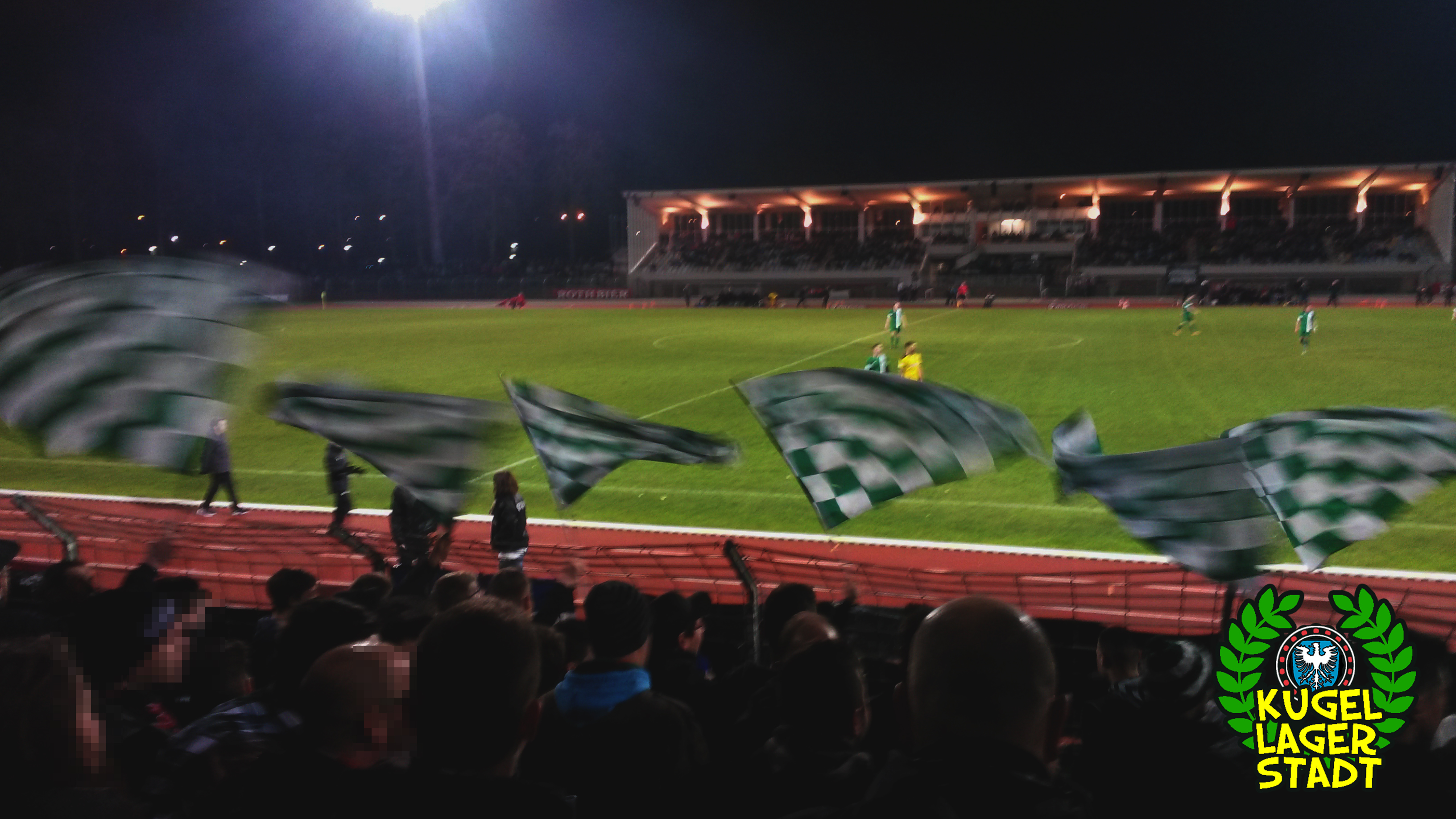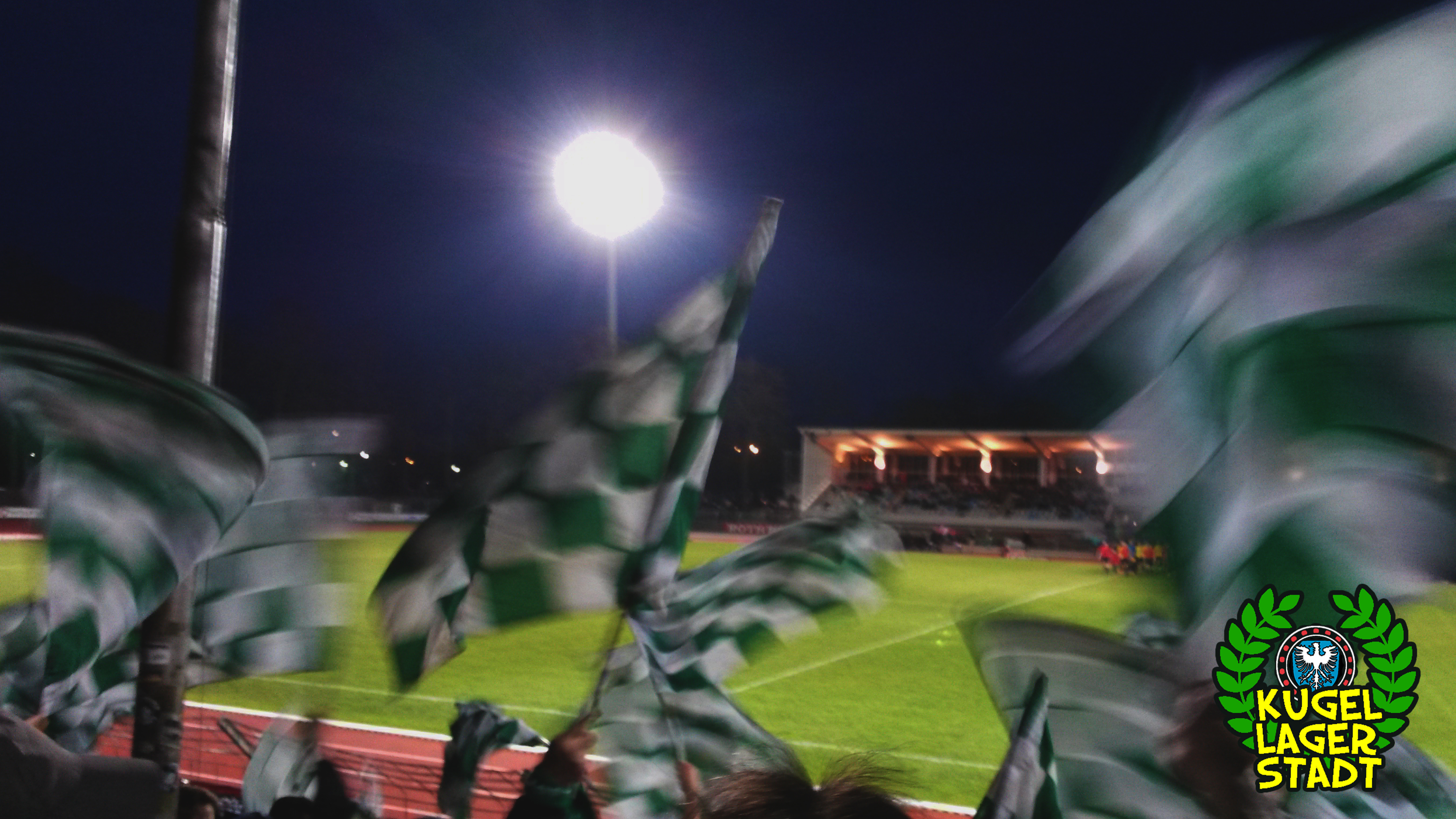 Bis auf einen Schuß von Tom Jäckel kam von unserer Seite aus so gut wie nichts brauchbares in Richtung Bayreuther Tor. Im Kontrast dazu die Stimmung auf der Gegengerade: Von Beginn an wurde die Mannschaft lautstark mit Gesängen und dazu wehenden grün-weißen Fahnen unterstützt. Auch der Gästeanhang wurde im Schweinfurter Liedgut nicht vergessen und mit einer Stadt namens Hof in Verbindung gebracht. Der Block war, im Gegensatz zu den vergangenen Spielen, sehr gut gefüllt und die Mitmachquote hoch. Kurzum: HEJA FCS! Unser Torschütze zum 1:0, Andi Bauer, nach der Partie: „Ein Extralob an unsere Fans, die wahnsinnige Stimmung, die die machen, motiviert uns zusätzlich.“ Auch auf Seiten der mitgereisten Anhänger aus der Wagnerstadt waren einige Fahnen zu sehen, die zuvor vermutlich bei einem befreundeten BVB-Fanclub ausgeliehen wurden. Ist ja sowieso bundesligafreies Wochenende. Gesangstechnisch war aus dem Gästeblock nicht sehr viel zu hören; außer gelegentlichen „Oberfranken, Oberfranken“-Rufen kam auf der Gegengerade kaum etwas an. Dass die gelben Zähne aus der „Altstadt“ kommen, wussten wir ja bereits.