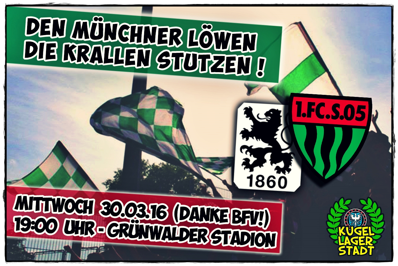 In der von Samstag auf den heutigen Mittwoch vorverlegten Partie (besonderer Dank an den BFV!) im Münchner Grünwalder Stadion, treffen zwei Serien aufeinander: Auf der einen Seite stehen die neun ungeschlagenen Spiele unsers FC 05 – auf der anderen Seite die sieben ungeschlagenen Partien der Löwen-Reserve. Schweinfurt ist damit zu diesem Zeitpunkt, neben Greuther Fürth II, als einzige Mannschaft in der Rückrunde ungeschlagen. Schnüdel-Trainer Gerd Klaus vor der Partie: „Es wäre schön, wenn wir diese Serie halten und auf zehn Spiele ausbauen könnten“. Weiter ungeschlagen, das wollen auch die Junglöwen bleiben. Während der Motor in der Hinrunde noch kräftig stotterte und auch die ersten beiden Spiele der Rückrunde verloren wurden, konnte man vier der letzten sieben Partien für sich entscheiden, darunter auch der 2:0-Derbysieg gegen die Roten. Die Mannschaft scheint mittlerweile gefestigt, konnte dem Tabellenführer Regensburg am letzten Spieltag auswärts einen Punkt abknöpfen. FC 05-Trainer Gerd Klaus: „Es war beeindruckend, wie stark die Sechziger da aufgespielt haben. Sie haben den Gegner kaum zur Entfaltung kommen lassen. Das ist schon eine andere Hausnummer. Wir reisen zu einer Mannschaft, die in den letzten Wochen beeindruckenden Fußball gespielt hat und die auch gegen Spitzen-Mannschaften auf Augenhöhe mitgehalten hat. Aber wir sind richtig heiß auf dieses Spiel und wollen unsere Serie ausbauen.“ Im Hinspiel setzten sich unsere Kugellagerstädter mit einem Tor von Marino Müller in der Nachspielzeit mit 1:0 durch, was damals vor 1.400 Zuschauern den zweiten Saisonsieg bedeutete.