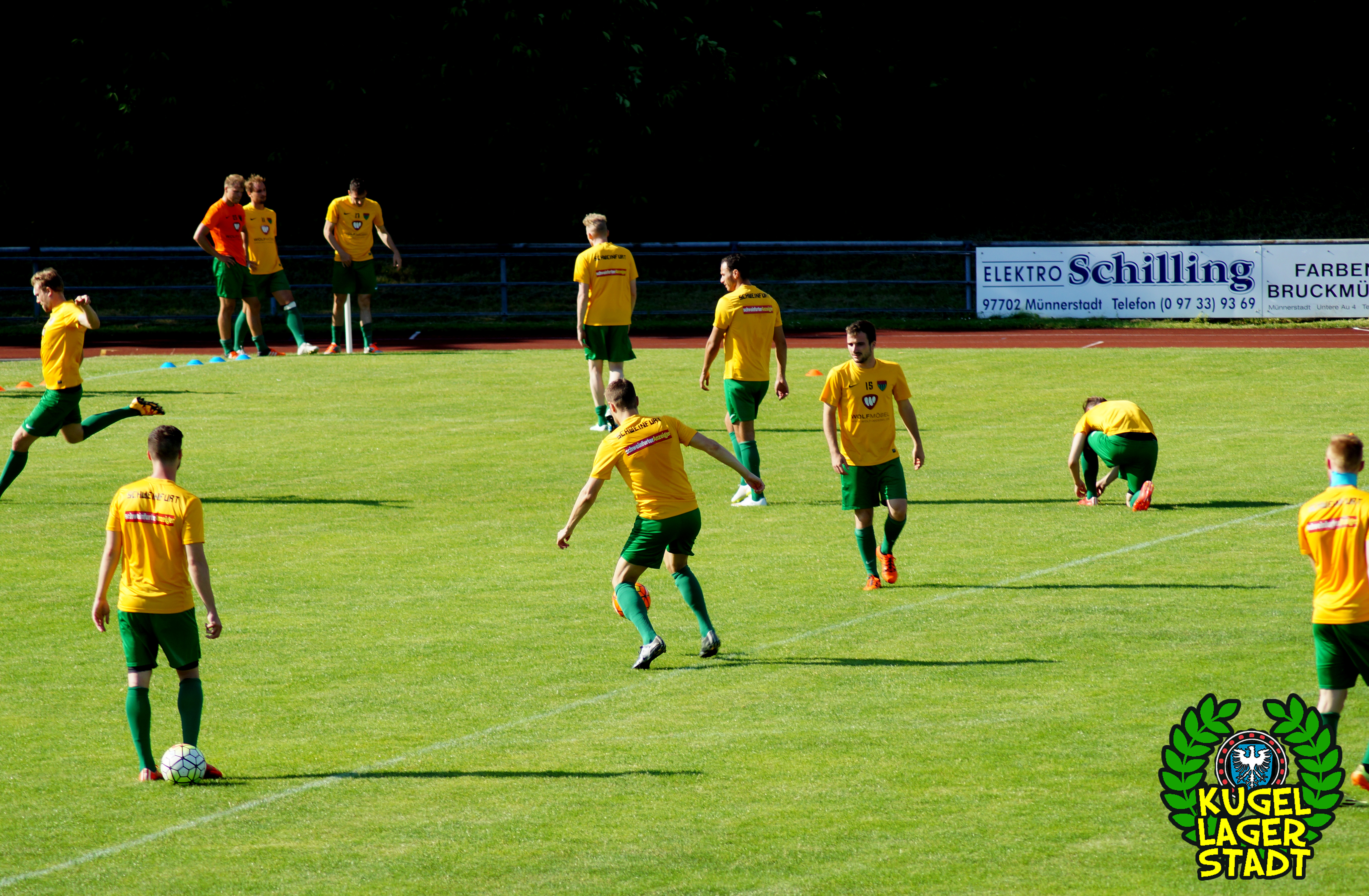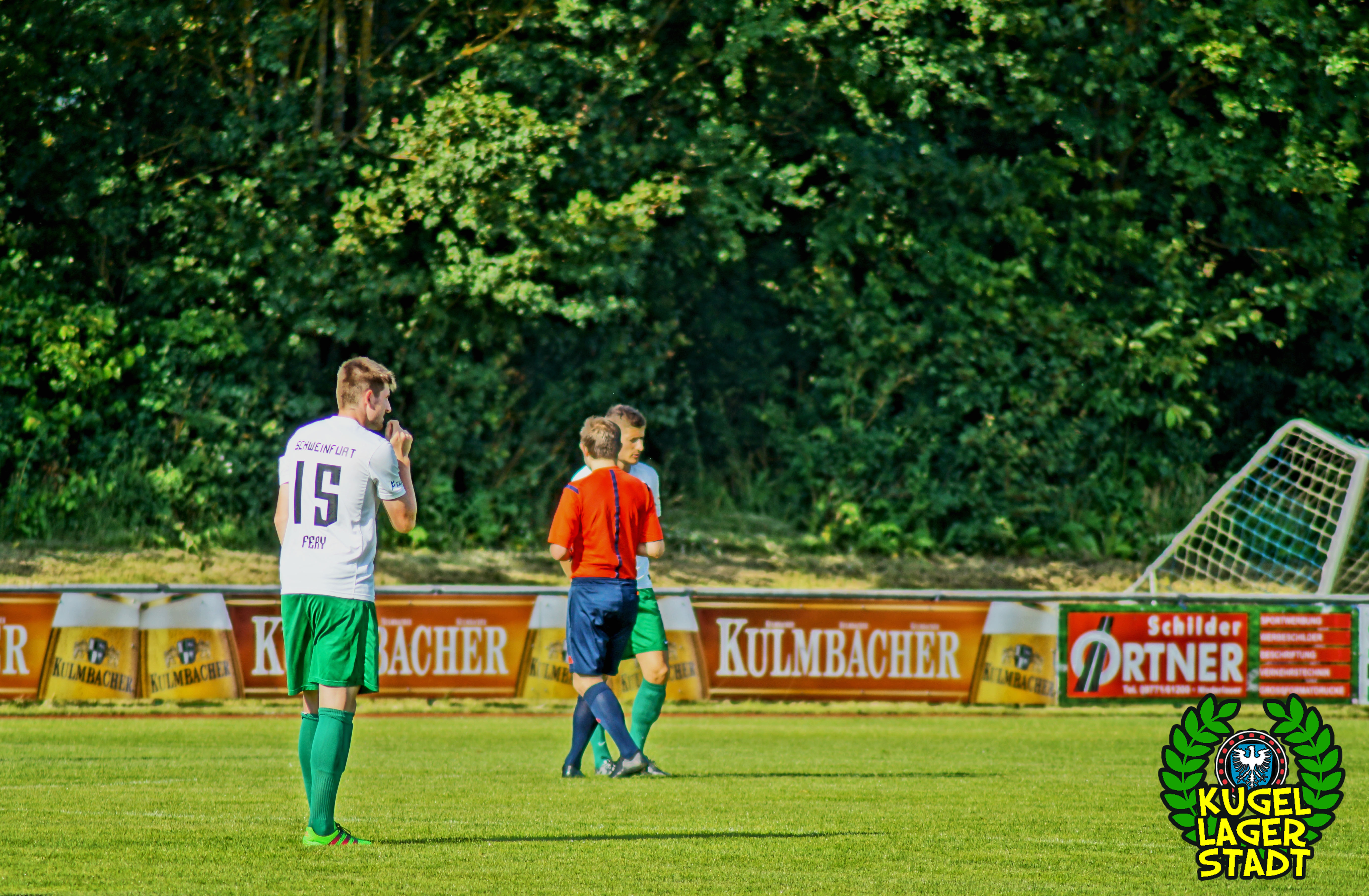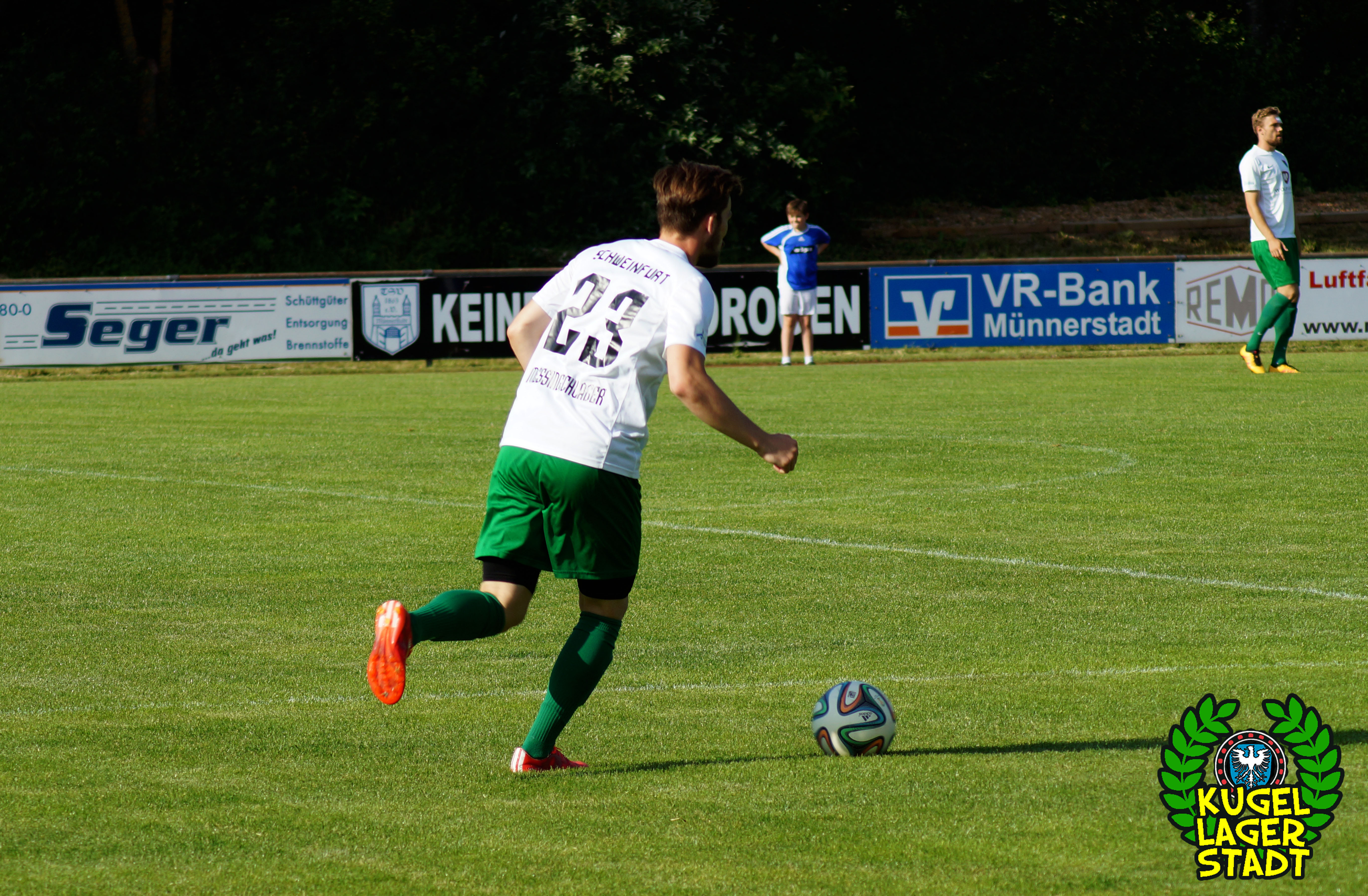 Der zweite Testspielgegner hieß am Samstagabend TSV Großbardorf. Im Rahmen des 90-jährigen Jubiläums der Fussballabteilung des TSV Münnerstadt traf man am dortigen Sportzentrum auf die Grabfeld-Gallier, die am letzten Spieltag der Bayernliga Nord im Kampf um die Aufstiegsränge das Nachsehen hatten und vermutlich auch in der neuen Saison wieder ganz vorne angreifen wollen. Freier Eintritt in Mürscht, sehr löblich! Vier Polizeibusse, ein Streifenwagen, ein Polizeihund sowie die beiden Schweinfurter SKB’s sorgten in Münnerstadt dafür, dass auch die unterfränkischen Beamten und Beamtinen an diesem Samstag etwas sinnvolles mit ihrer Zeit anstellen konnten. Eben dem Anlass angemessen. Oder auch nicht. Zu Spielbeginn hatten sich ca. 20 Schnüdel im eigens hergerichteten Gästeblock, bei Bratwurst und Bier, eingefunden. Die Partie ingesamt recht ausgeglichen, mit kleineren Chancen auf beiden Seiten. Und im Gegensatz zur gestrigen Achtelfinalpartie zwischen Kroatien und Portugal gab es während der regulären Spielzeit gar einen Treffer zu bejubeln: In der 39. Spielminute köpft unser Abwehrchef Joe Bechmann zum 1:0 ein, was gleichzeitig auch dem Endstand entsprechen sollte. Aufziehende dunkle Wolken wirbelten ordentlich Regen über den Sportplatz, die Menge sprintete unter das Dach an den Umkleiden, Spielabbruch. Von den Beamten keine Spur mehr. Nach einer großzügigen Pause ging die Partie noch einmal über gut 30 Minuten, ohne jedoch die ganz großen Highlights anzubieten.