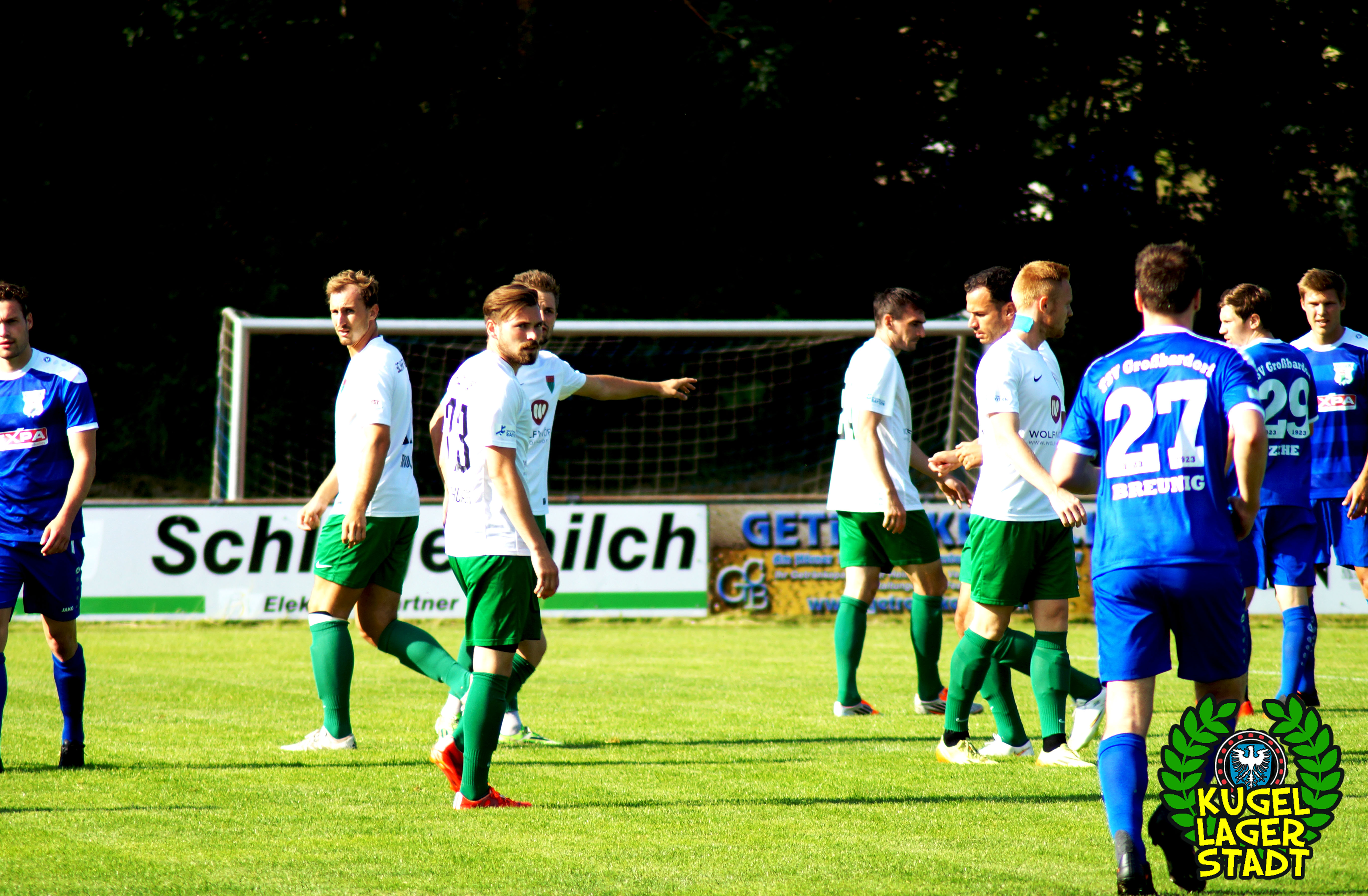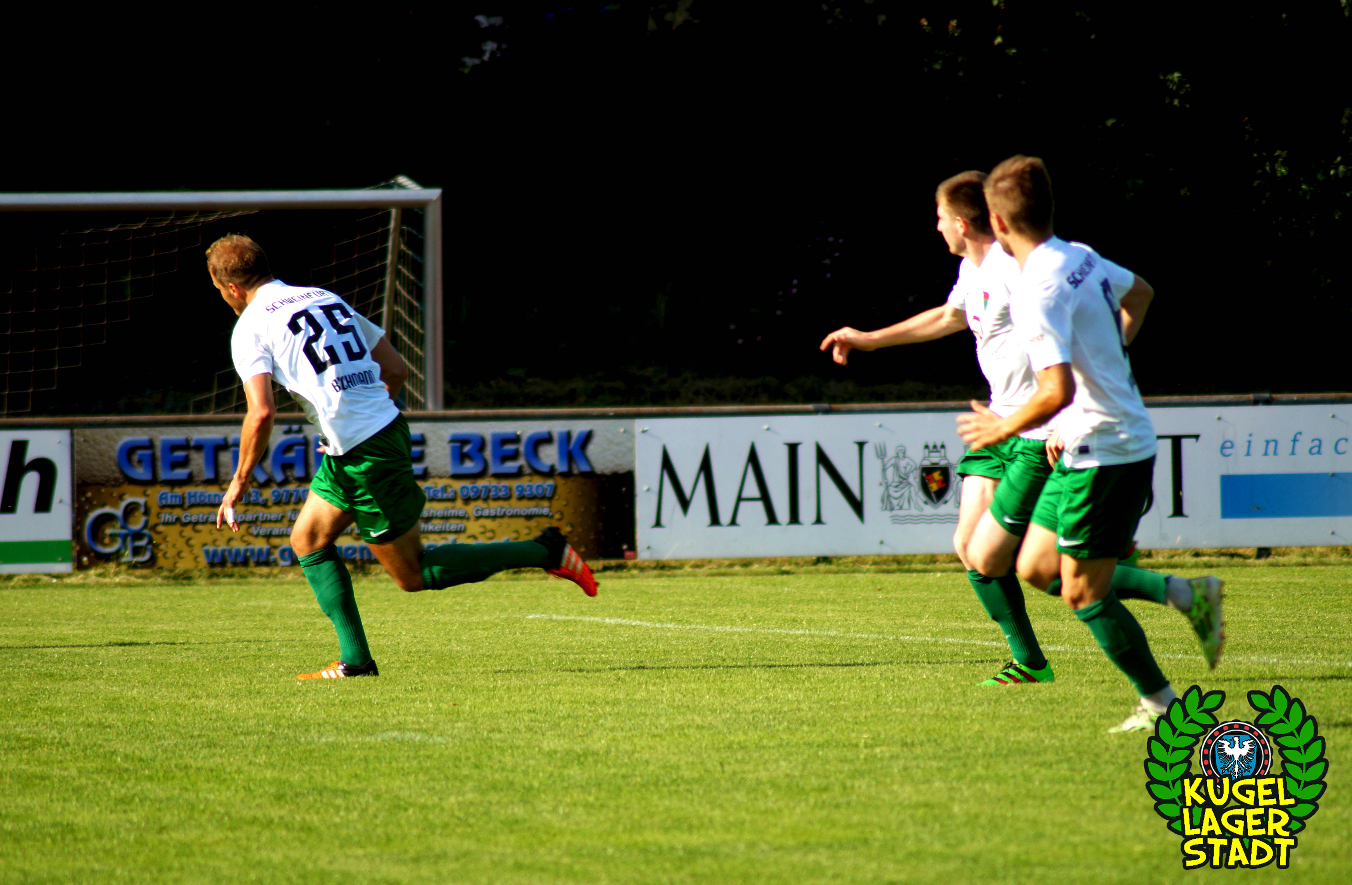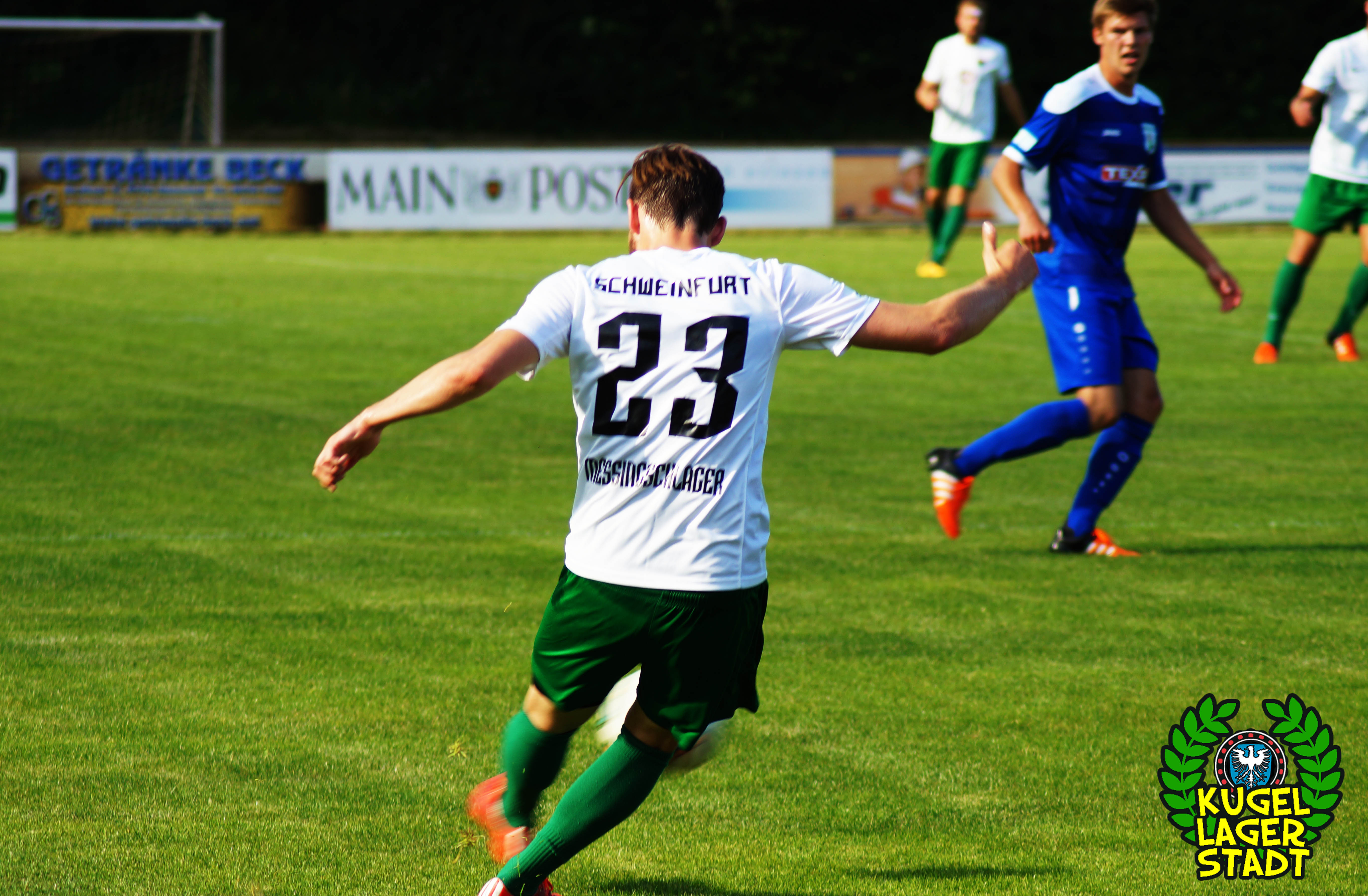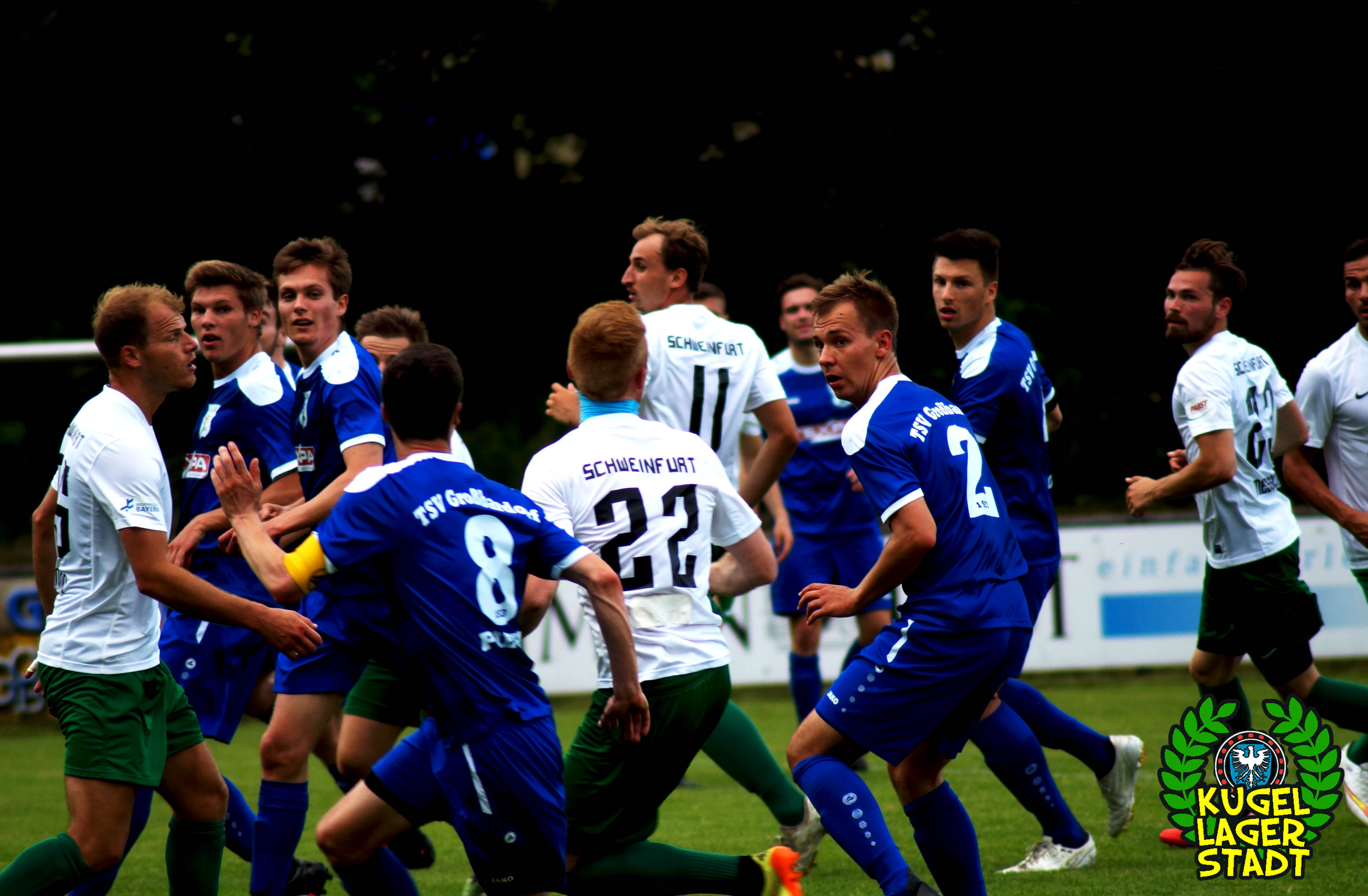 Der zweite Testspielgegner hieß am Samstagabend TSV Großbardorf. Im Rahmen des 90-jährigen Jubiläums der Fussballabteilung des TSV Münnerstadt traf man am dortigen Sportzentrum auf die Grabfeld-Gallier, die am letzten Spieltag der Bayernliga Nord im Kampf um die Aufstiegsränge das Nachsehen hatten und vermutlich auch in der neuen Saison wieder ganz vorne angreifen wollen. Freier Eintritt in Mürscht, sehr löblich! Vier Polizeibusse, ein Streifenwagen, ein Polizeihund sowie die beiden Schweinfurter SKB’s sorgten in Münnerstadt dafür, dass auch die unterfränkischen Beamten und Beamtinen an diesem Samstag etwas sinnvolles mit ihrer Zeit anstellen konnten. Eben dem Anlass angemessen. Oder auch nicht. Zu Spielbeginn hatten sich ca. 20 Schnüdel im eigens hergerichteten Gästeblock, bei Bratwurst und Bier, eingefunden. Die Partie ingesamt recht ausgeglichen, mit kleineren Chancen auf beiden Seiten. Und im Gegensatz zur gestrigen Achtelfinalpartie zwischen Kroatien und Portugal gab es während der regulären Spielzeit gar einen Treffer zu bejubeln: In der 39. Spielminute köpft unser Abwehrchef Joe Bechmann zum 1:0 ein, was gleichzeitig auch dem Endstand entsprechen sollte. Aufziehende dunkle Wolken wirbelten ordentlich Regen über den Sportplatz, die Menge sprintete unter das Dach an den Umkleiden, Spielabbruch. Von den Beamten keine Spur mehr. Nach einer großzügigen Pause ging die Partie noch einmal über gut 30 Minuten, ohne jedoch die ganz großen Highlights anzubieten.