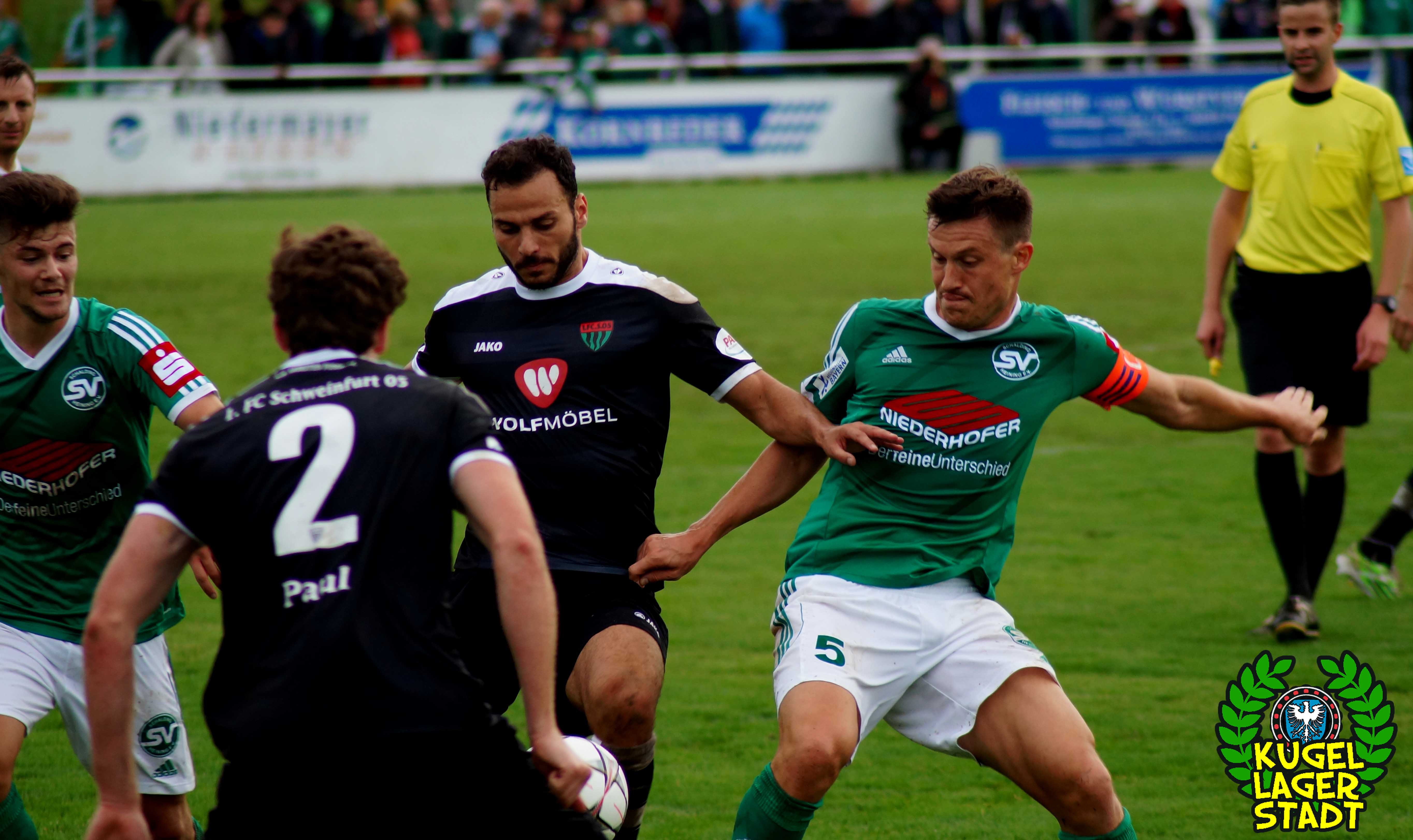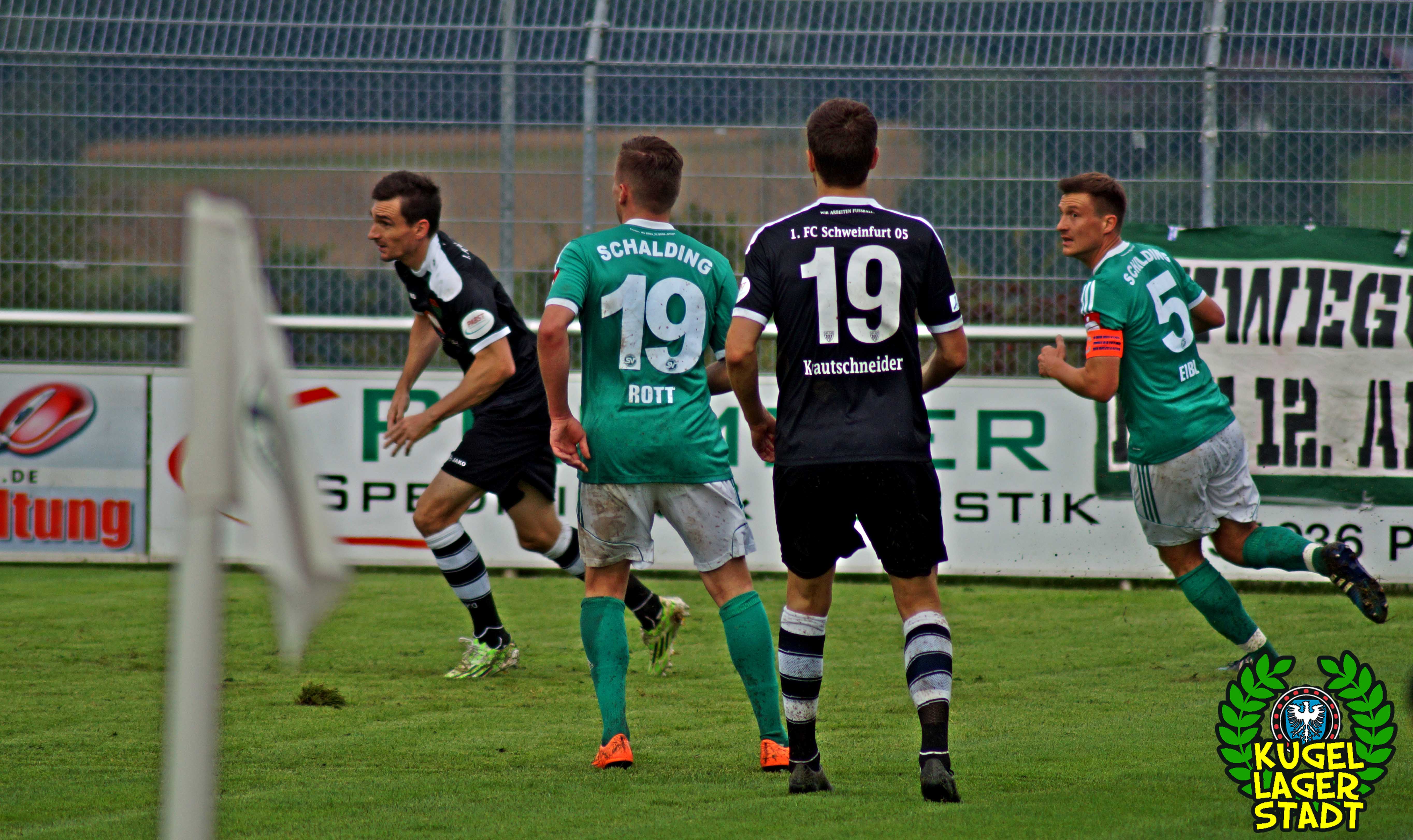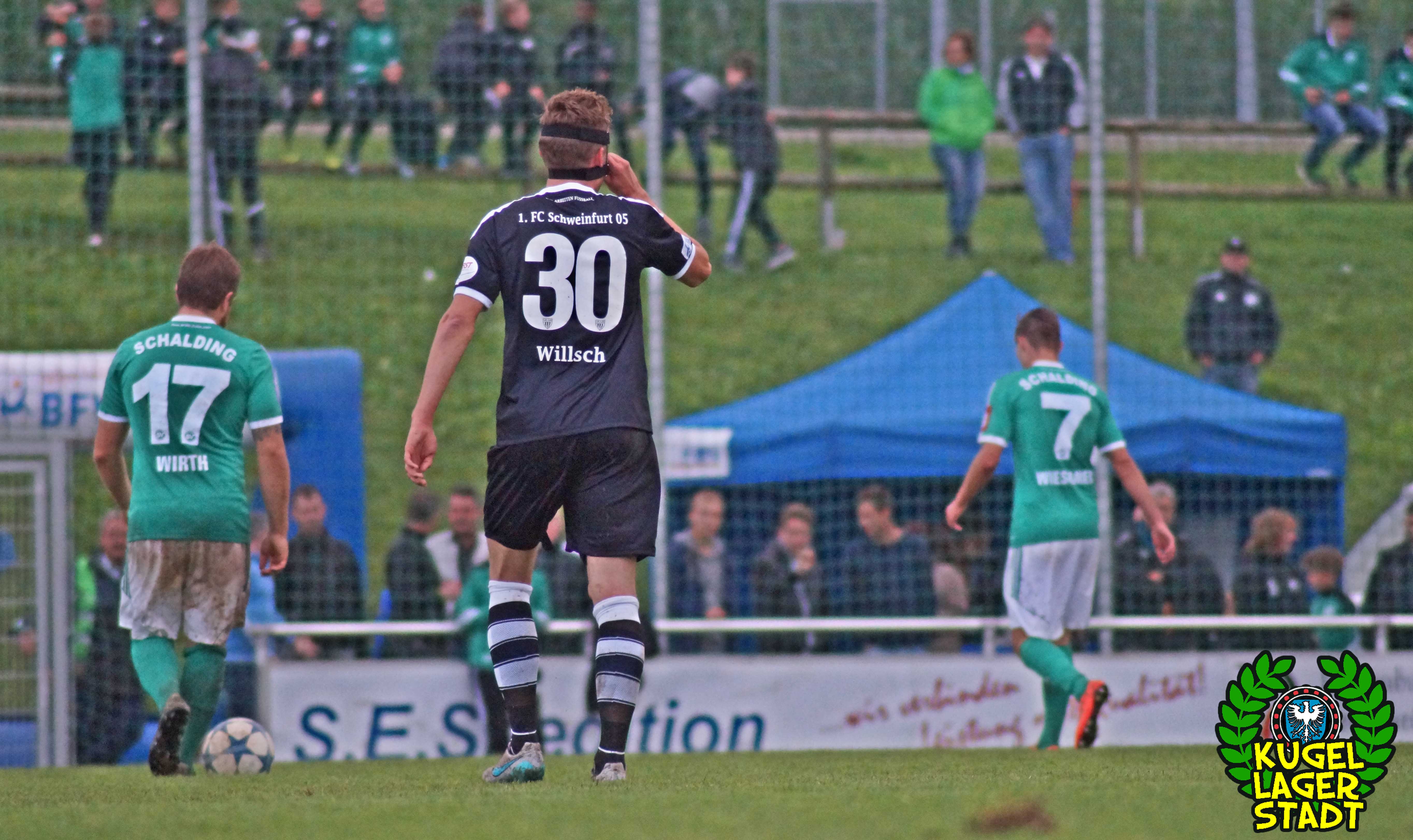 Mit Wiederanpfiff übernahmen unsere 05er, wie auch in Durchgang Eins, früh die Kontrolle über das Geschehen auf dem Rasen. Nach 50 gespielten Minuten versucht es Marco Haller per Distanzschuss, der jedoch über den Kasten fliegt. In der 59. Spielminute dann der verdiente Ausgleich durch Adam Jabiri: Nach Flanke über die linke Seite setzt der Neuzugang das Spielgerät zum 1:1 per Kopf in die Maschen. HEJA FCS! Nach zahlreichen weiteren guten Möglichkeiten, vor allem durch Steffen Krautschneider, der den zweiten Aluminiumtreffer des Abends beisteuerte, war zu erkennen, dass der Kasten der Schaldinger heute vernagelt war. Das Geschehen auf dem schlammigen Untergrund erinnerte immer mehr an die Halbfinal-Partie unserer Nationalmannschaft gegen Frankreich: Man hatte das Gefühl, das Spiel könne gut und gerne noch zwei, drei Stunden weiterlaufen, ein Tor zum Sieg wird unseren Schnüdel trotz drückender Überlegenheit heute nicht mehr gelingen. Am Ende stand auf der Anzeigetafel ein 1:1, welches sich vor allem für unsere Kugellagerstädter wie verlorene zwei Punkte anfühlen dürfte. Trainer Gerd Klaus nach der Partie: „Wir haben auf dem schwer zu bespielenden Boden ein gutes Spiel gesehen mit einem gerechten Ergebnis. Schalding hat wie immer gut gefightet. Wir haben die Situation, die zum Gegentor geführt hat, glaube ich 50.000 Mal angesprochen, aber es klappt beim SVS immer wieder. Das ist schon sensationell. Am Ende hatten wir bei den Pfostentreffern etwas Pech, aber Schaldings Keeper hat auch überragend gehalten“. Auch der Coach der Passauer, Anton Autengruber, erkannte die gezeigte Leistung unsere 05er an: „Es war ein Kampfspiel, Schweinfurt hat ein klasse Spiel gezeigt. Wir haben heute einen Punkt gewonnen“.