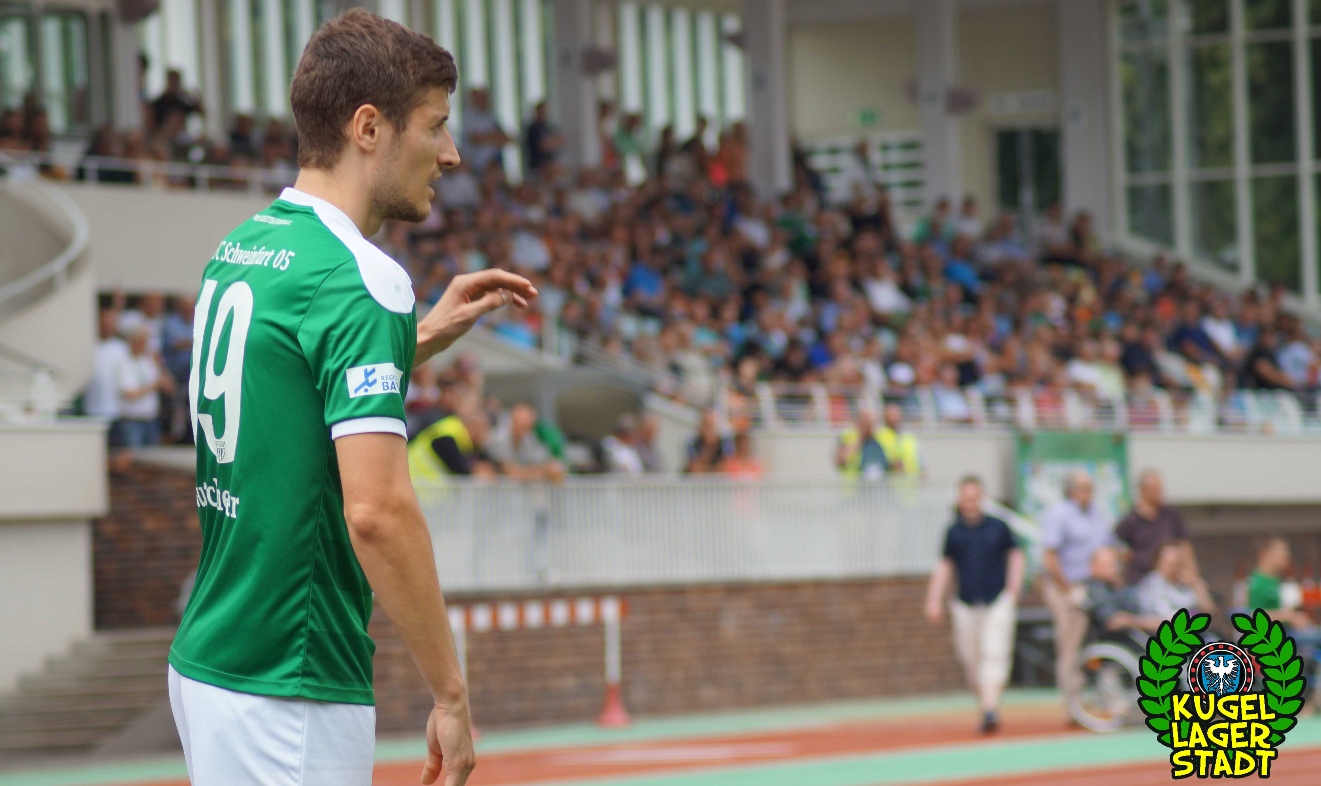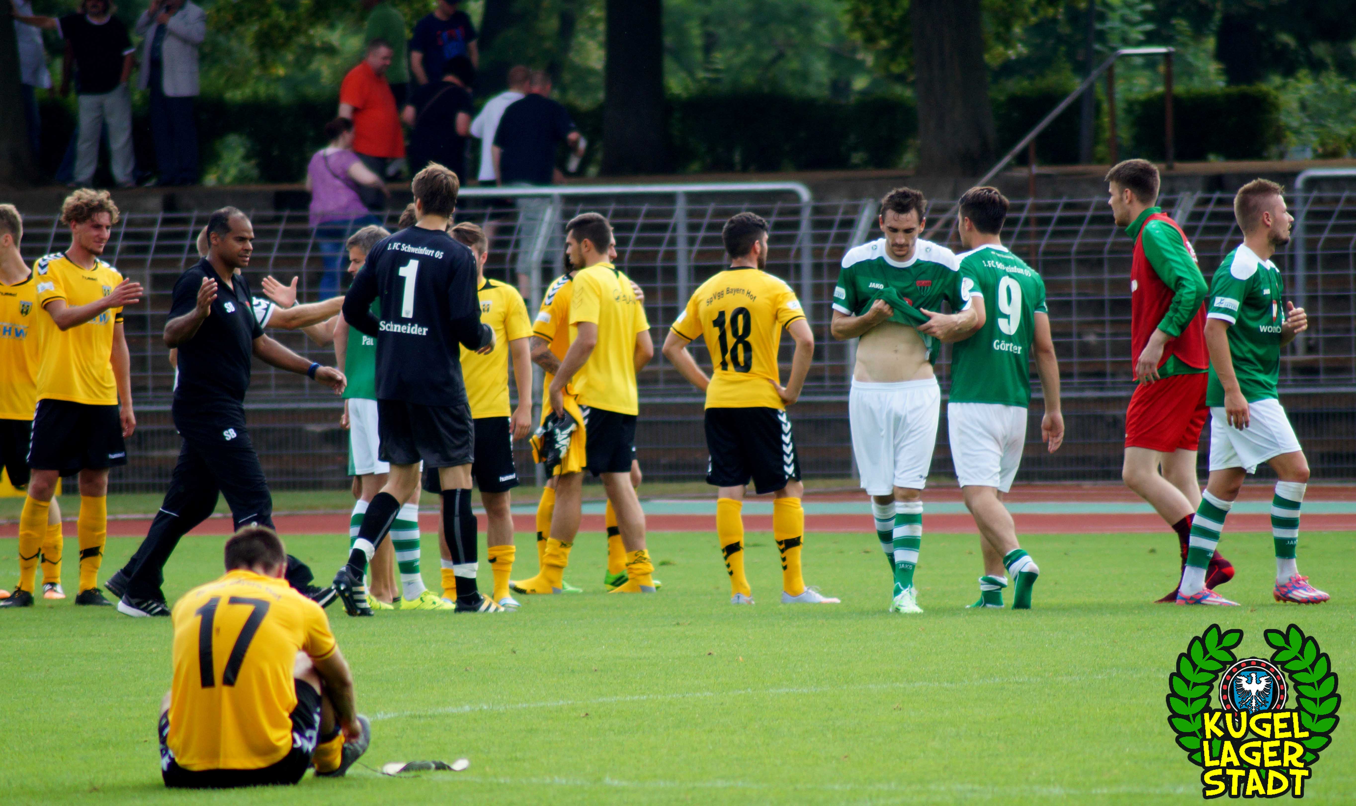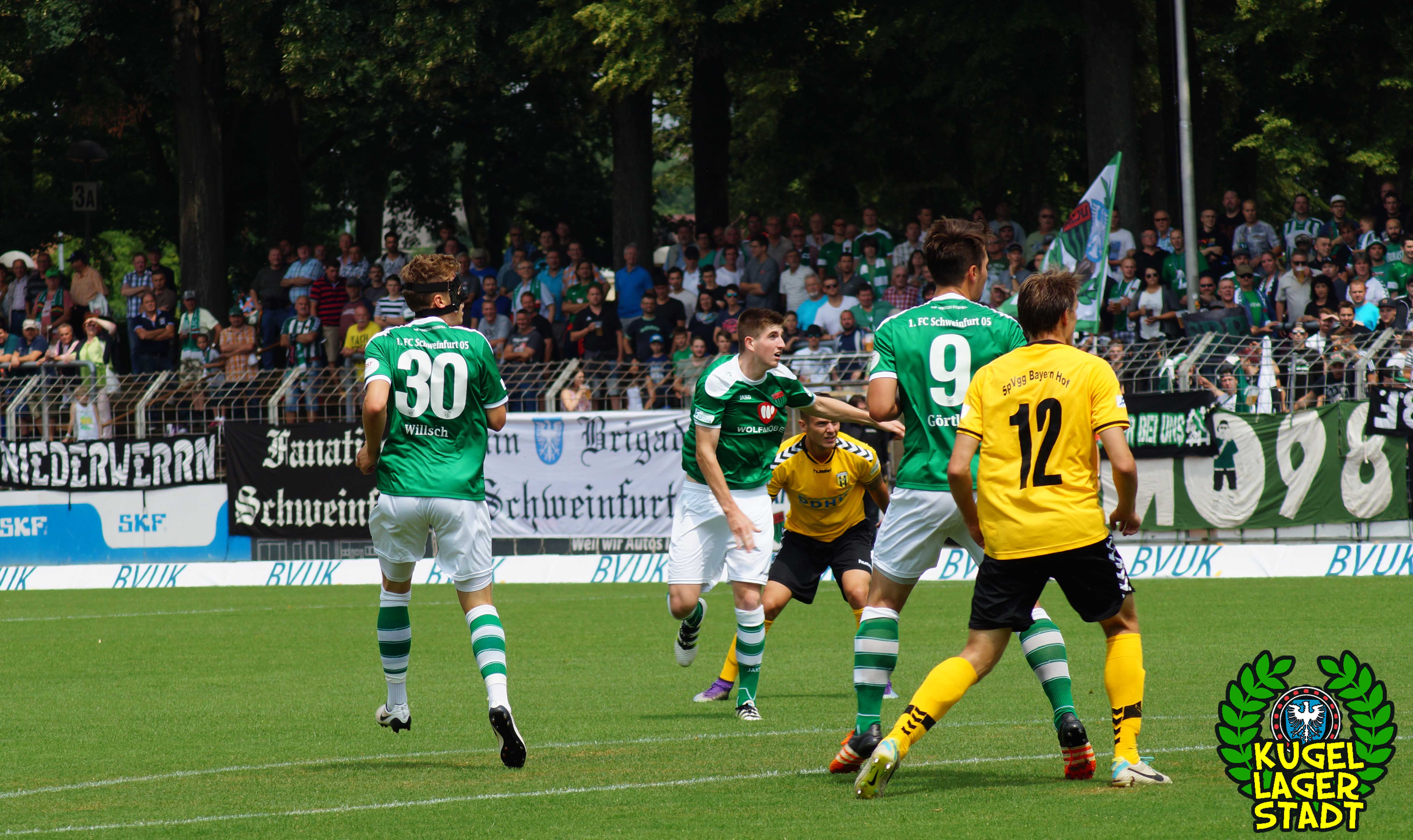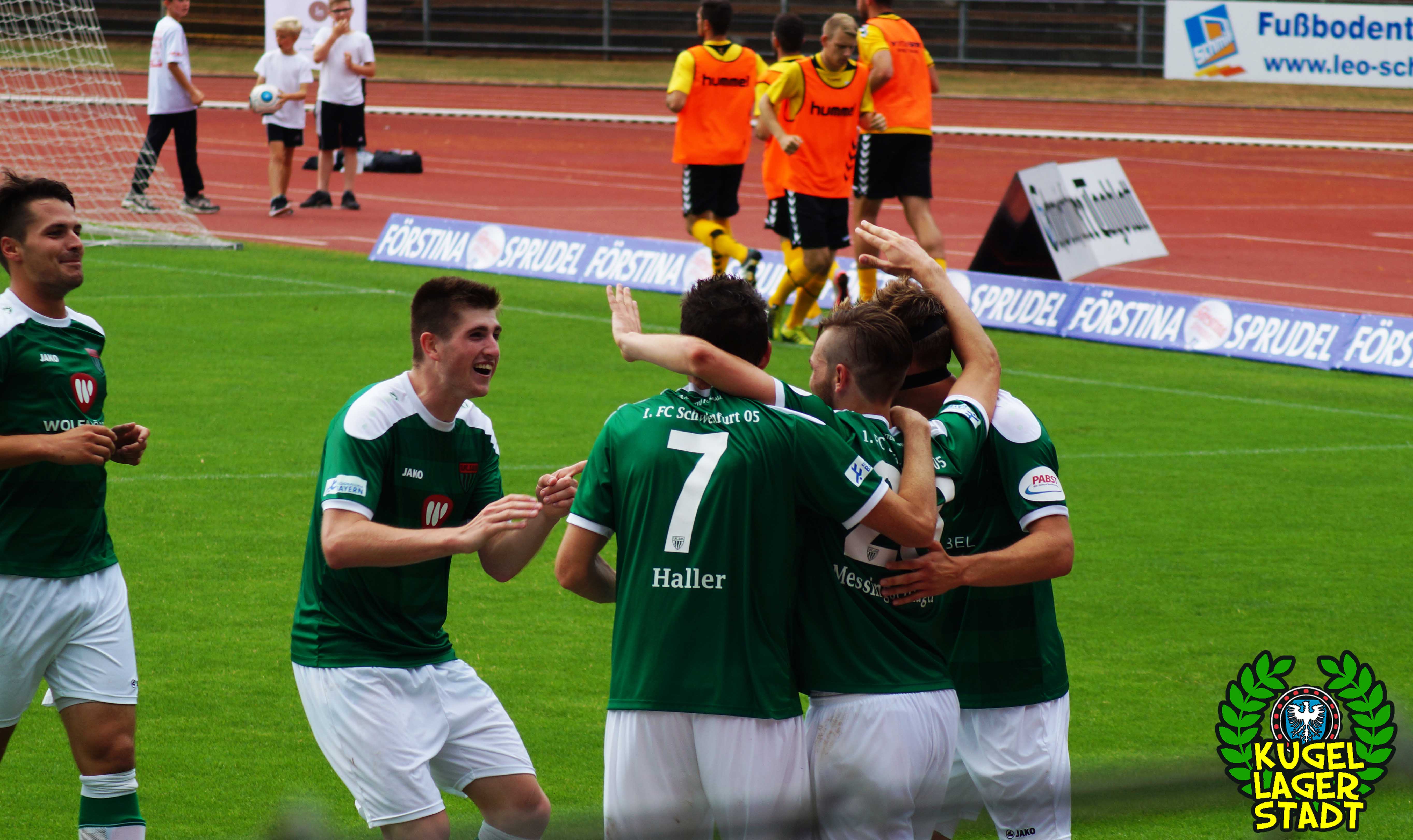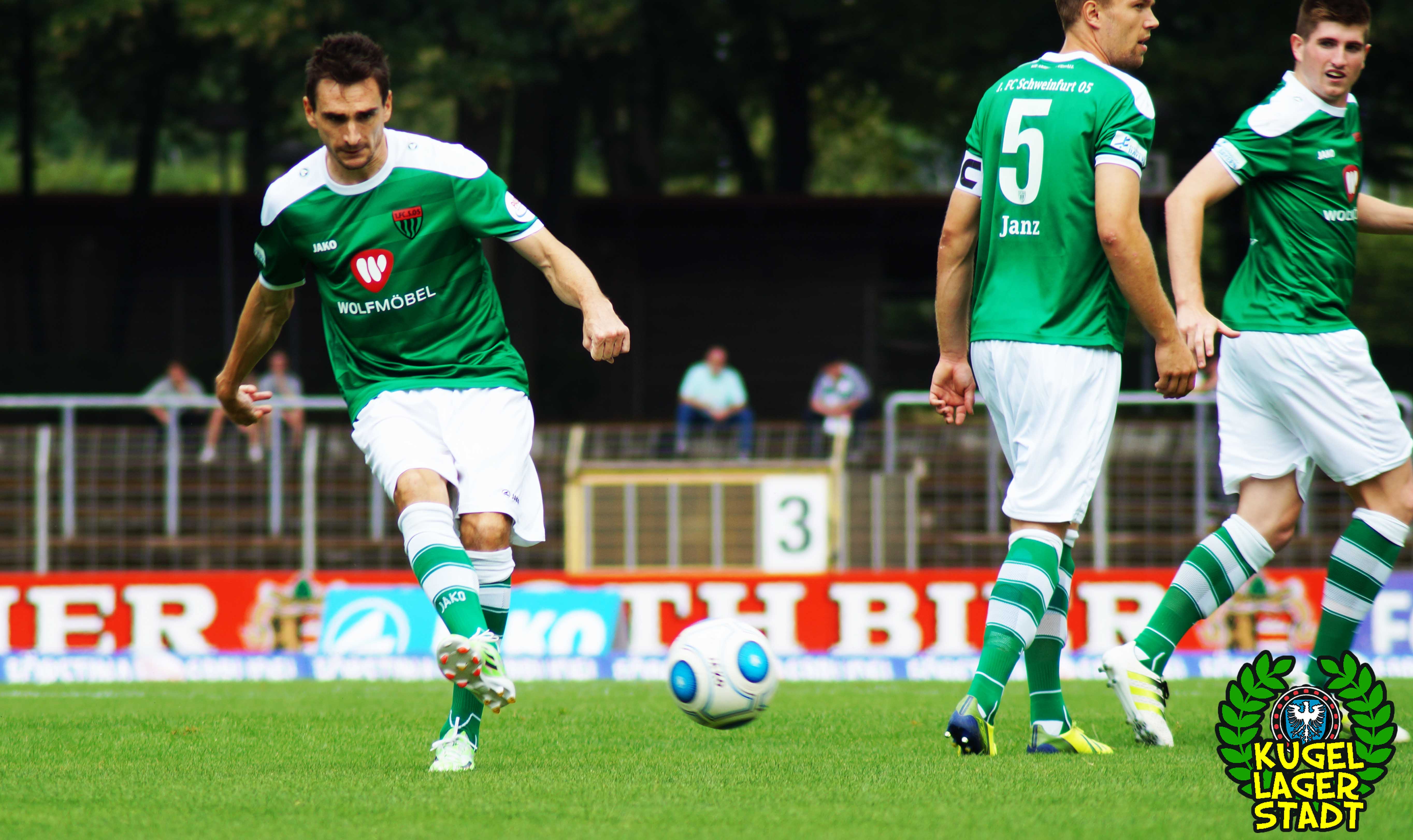 Zum sportlichen Geschehen: Das Spiel endete so, wie die spezielle Geschichte zwischen Schweinfurt und Hof am letzten Spieltag der Saison 2013/2014 – unter Mitwirkung des SV Heimstetten – begann: Mit einem 4:3 für die Kugellagerstadt. In der ersten Halbzeit drückend überlegen, gingen unsere Jungs durch Neuzugang Marius Willsch in der 20. Spielminute in Führung. Nur fünf Minuten später der glückliche Ausgleich der Oberfranken. Kurz vor der Pause traf mit Nicolas Görtler der nächste Neuzugang zum 2:1-Pausenstand. Zu Beginn der zweiten Halbzeit ein ähnliches Bild: Unser FC05, teils furios in der Offensive, stellte durch Phillip Messingschlager schnell auf 3:1. Unser gefährlichster Akteur aus der Vorsaison, Steffen Krautschneider, ließ in der 55. Minute den Treffer zum 4:1 folgen. Nach den Auswechslungen des extrem stark aufgelegten Marius Willsch, der zu seinem Tor auch noch zwei Vorlagen beisteuerte, und Adam Jabiri, war im Schnüdelspiel ein Bruch zu erkennen. Nach einem Elfmetertreffer zum 4:2 in der 67. Minute bekamen die Hofer Bayern Auftrieb und verlagerten das Spielgeschehen zunehmend in die Schweinfurter Hälfte. So traf Schraps gute fünf Minuten vor Schluss noch zum 4:3, nachdem zuvor beste Schweinfurter Chancen auf das fünfte und gar sechste Tor vergeben wurden. Am ersten grün-weißen Heimsieg in dieser noch jungen Saison konnten die Hofer jedoch nicht mehr rütteln. AUS! DREI PUNKTE IM ERSTEN HEIMSPIEL! „Mit einem 4:4 hätte ich mich für einen geklauten Punkt entschuldigen müssen„, gab der Bayern-Trainer Miloslav Janovsky nach Abpfiff gegenüber in-und-um-sw zu. „Wenn´s fünf Minuten länger geht, geben wir den Sieg noch ab. Wir sind spielerisch schon sehr gut, gerade die spät gekommenen Zugänge sind aber noch nicht im notwendigen körperlichen Zustand“, weiß Schnüdel-Coach Gerd Klaus. Das einzig entäuschende an diesem sonst rundum gelungenen ersten Heimspiel der Saison, waren die nur 1707 Zuschauer. Da ist definitiv noch ordentlich Luft nach oben!