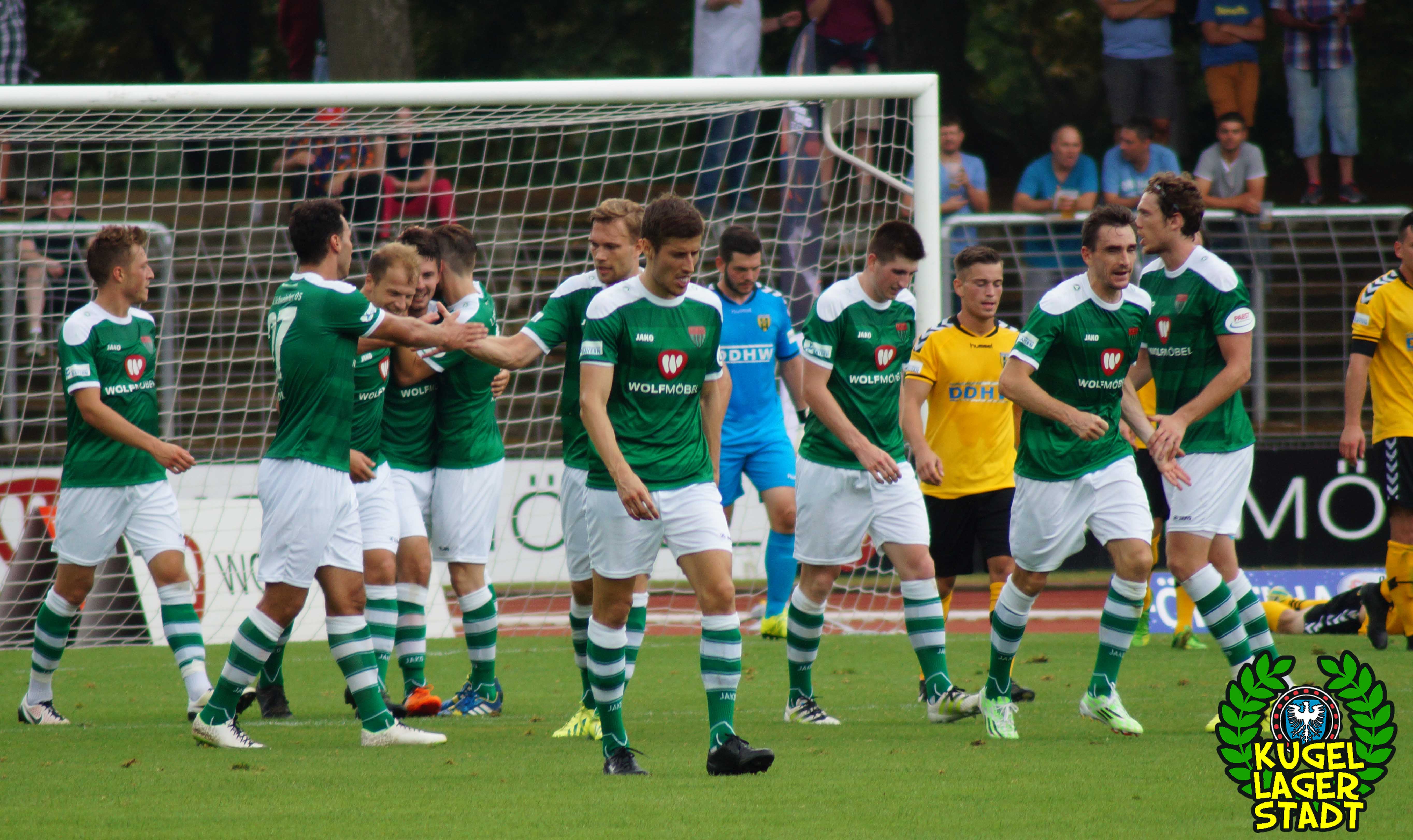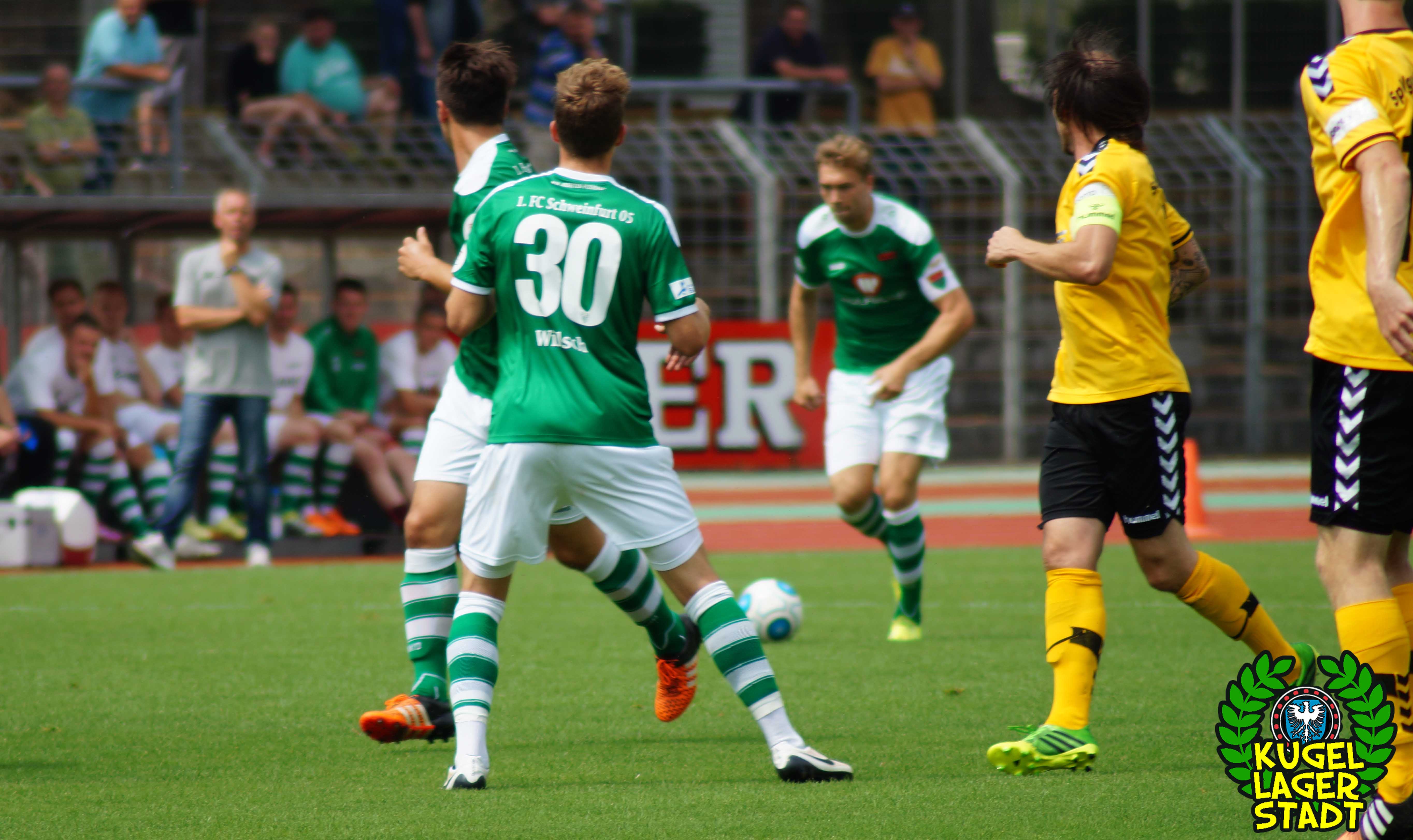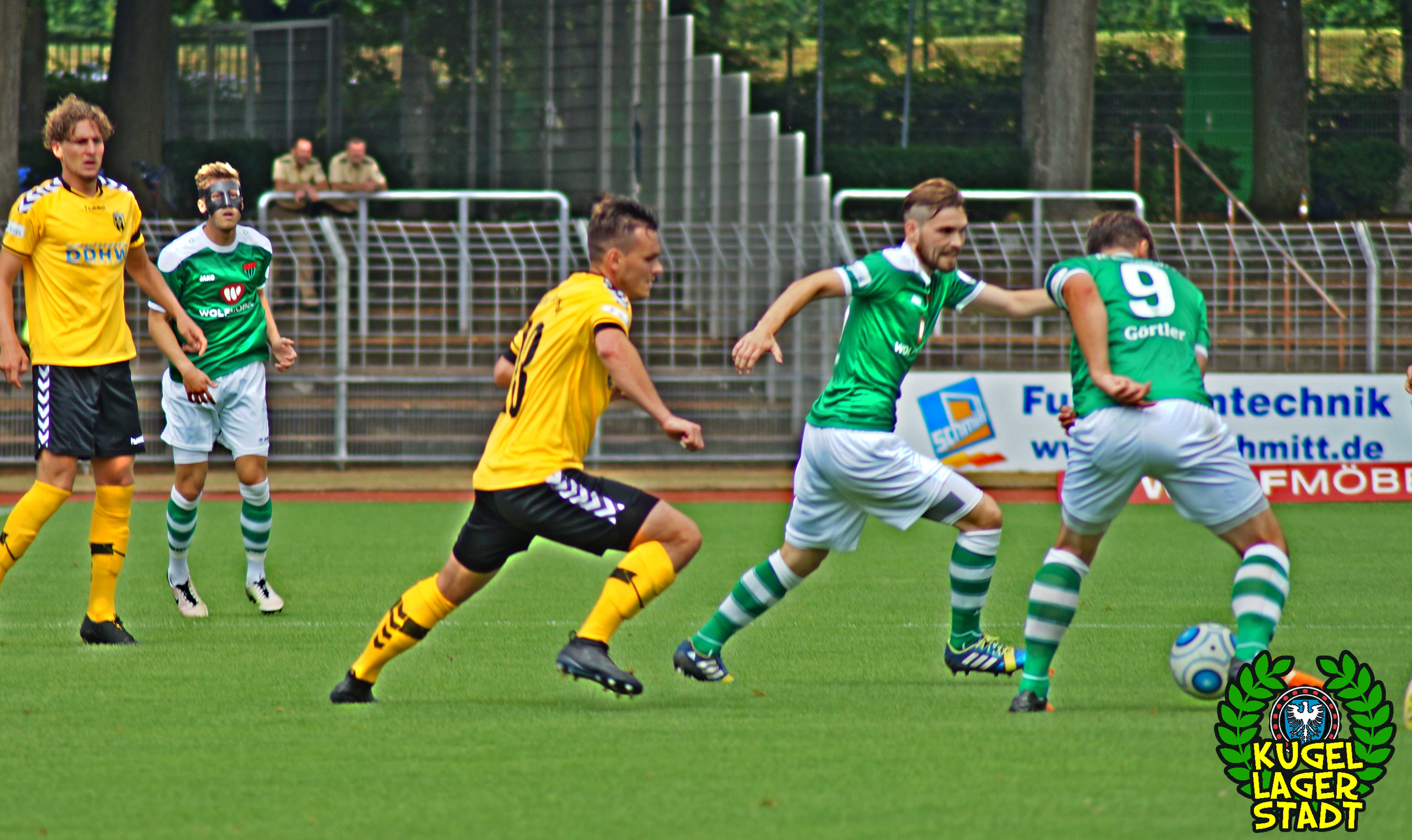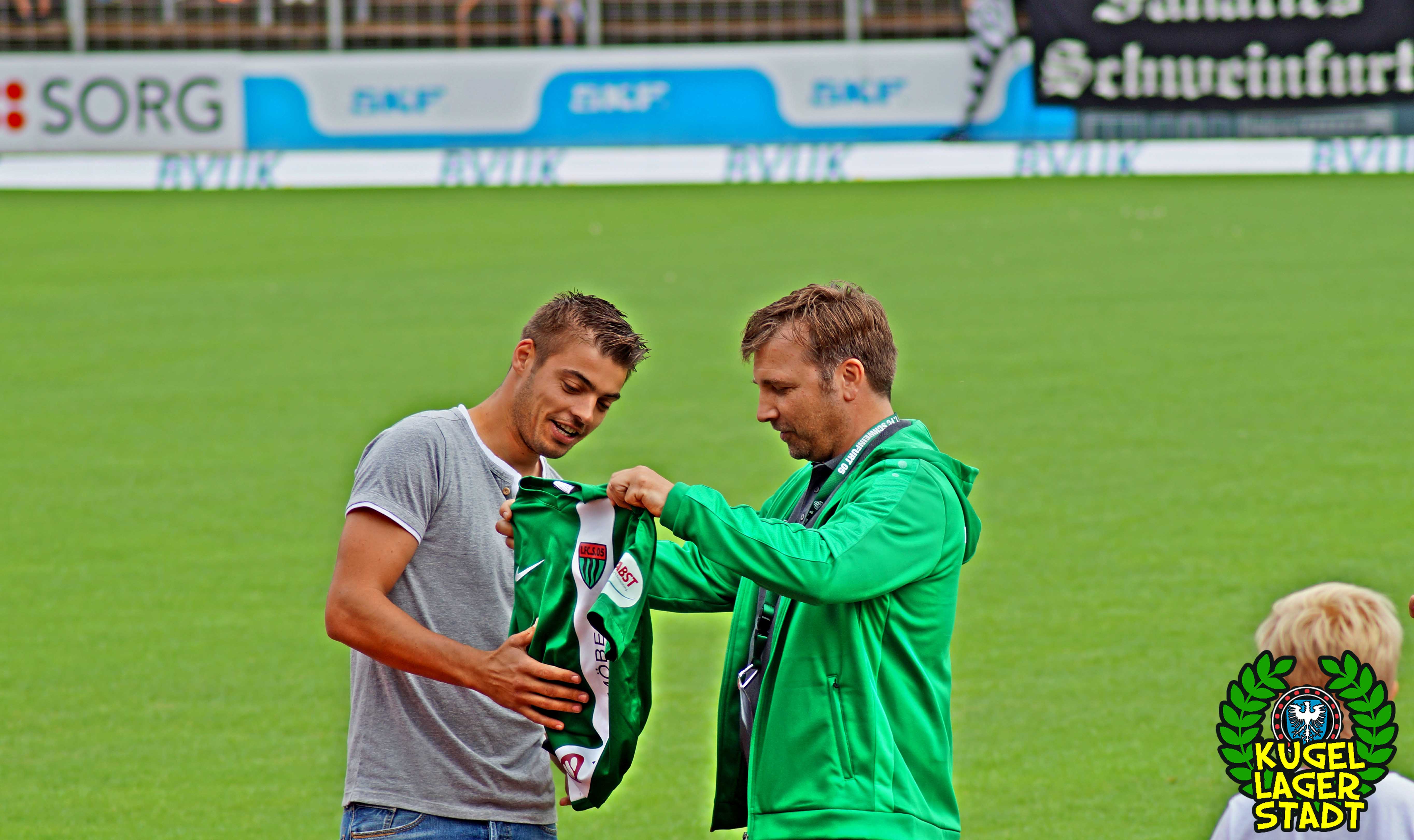 Zum sportlichen Geschehen: Das Spiel endete so, wie die spezielle Geschichte zwischen Schweinfurt und Hof am letzten Spieltag der Saison 2013/2014 – unter Mitwirkung des SV Heimstetten – begann: Mit einem 4:3 für die Kugellagerstadt. In der ersten Halbzeit drückend überlegen, gingen unsere Jungs durch Neuzugang Marius Willsch in der 20. Spielminute in Führung. Nur fünf Minuten später der glückliche Ausgleich der Oberfranken. Kurz vor der Pause traf mit Nicolas Görtler der nächste Neuzugang zum 2:1-Pausenstand. Zu Beginn der zweiten Halbzeit ein ähnliches Bild: Unser FC05, teils furios in der Offensive, stellte durch Phillip Messingschlager schnell auf 3:1. Unser gefährlichster Akteur aus der Vorsaison, Steffen Krautschneider, ließ in der 55. Minute den Treffer zum 4:1 folgen. Nach den Auswechslungen des extrem stark aufgelegten Marius Willsch, der zu seinem Tor auch noch zwei Vorlagen beisteuerte, und Adam Jabiri, war im Schnüdelspiel ein Bruch zu erkennen. Nach einem Elfmetertreffer zum 4:2 in der 67. Minute bekamen die Hofer Bayern Auftrieb und verlagerten das Spielgeschehen zunehmend in die Schweinfurter Hälfte. So traf Schraps gute fünf Minuten vor Schluss noch zum 4:3, nachdem zuvor beste Schweinfurter Chancen auf das fünfte und gar sechste Tor vergeben wurden. Am ersten grün-weißen Heimsieg in dieser noch jungen Saison konnten die Hofer jedoch nicht mehr rütteln. AUS! DREI PUNKTE IM ERSTEN HEIMSPIEL! „Mit einem 4:4 hätte ich mich für einen geklauten Punkt entschuldigen müssen„, gab der Bayern-Trainer Miloslav Janovsky nach Abpfiff gegenüber in-und-um-sw zu. „Wenn´s fünf Minuten länger geht, geben wir den Sieg noch ab. Wir sind spielerisch schon sehr gut, gerade die spät gekommenen Zugänge sind aber noch nicht im notwendigen körperlichen Zustand“, weiß Schnüdel-Coach Gerd Klaus. Das einzig entäuschende an diesem sonst rundum gelungenen ersten Heimspiel der Saison, waren die nur 1707 Zuschauer. Da ist definitiv noch ordentlich Luft nach oben!
