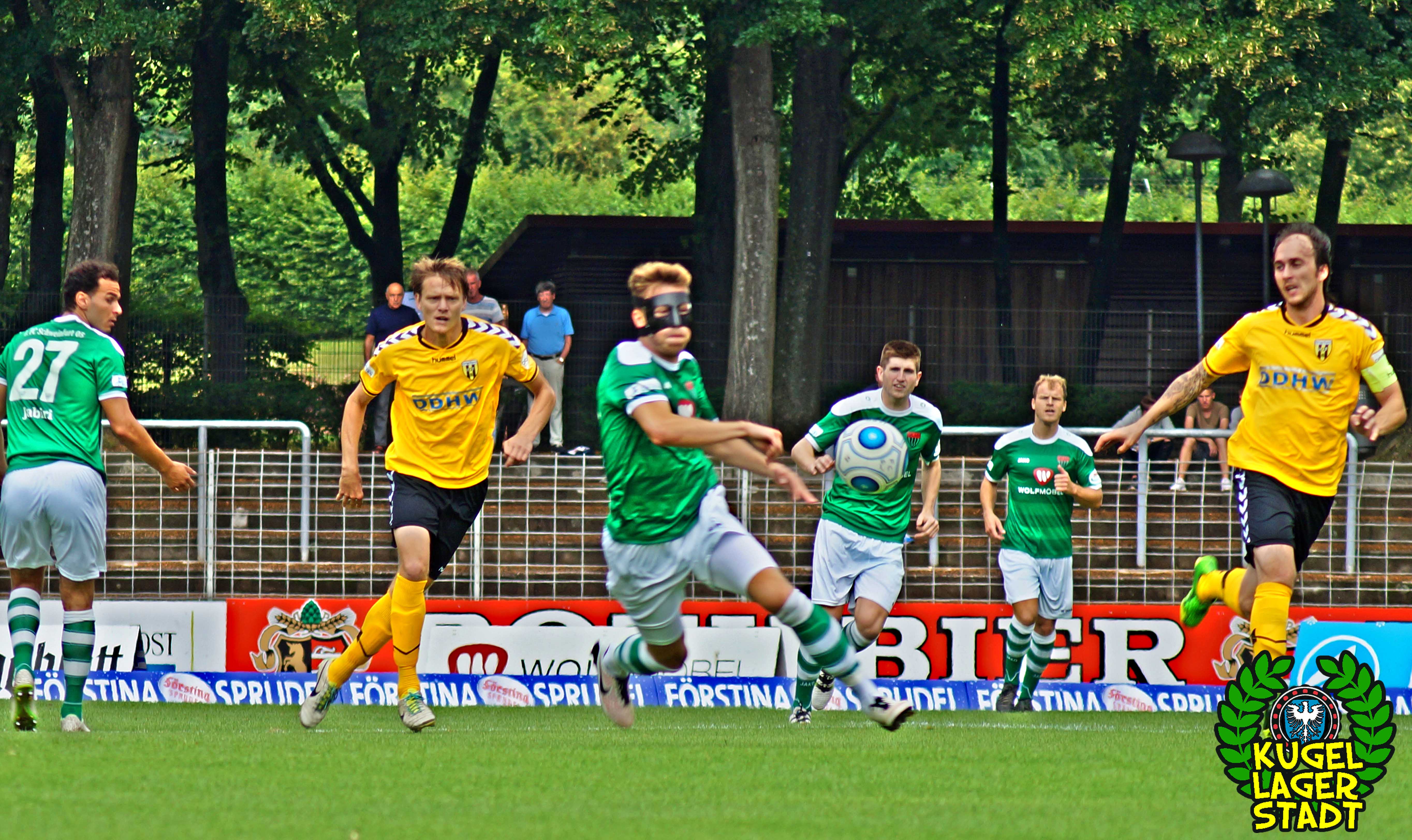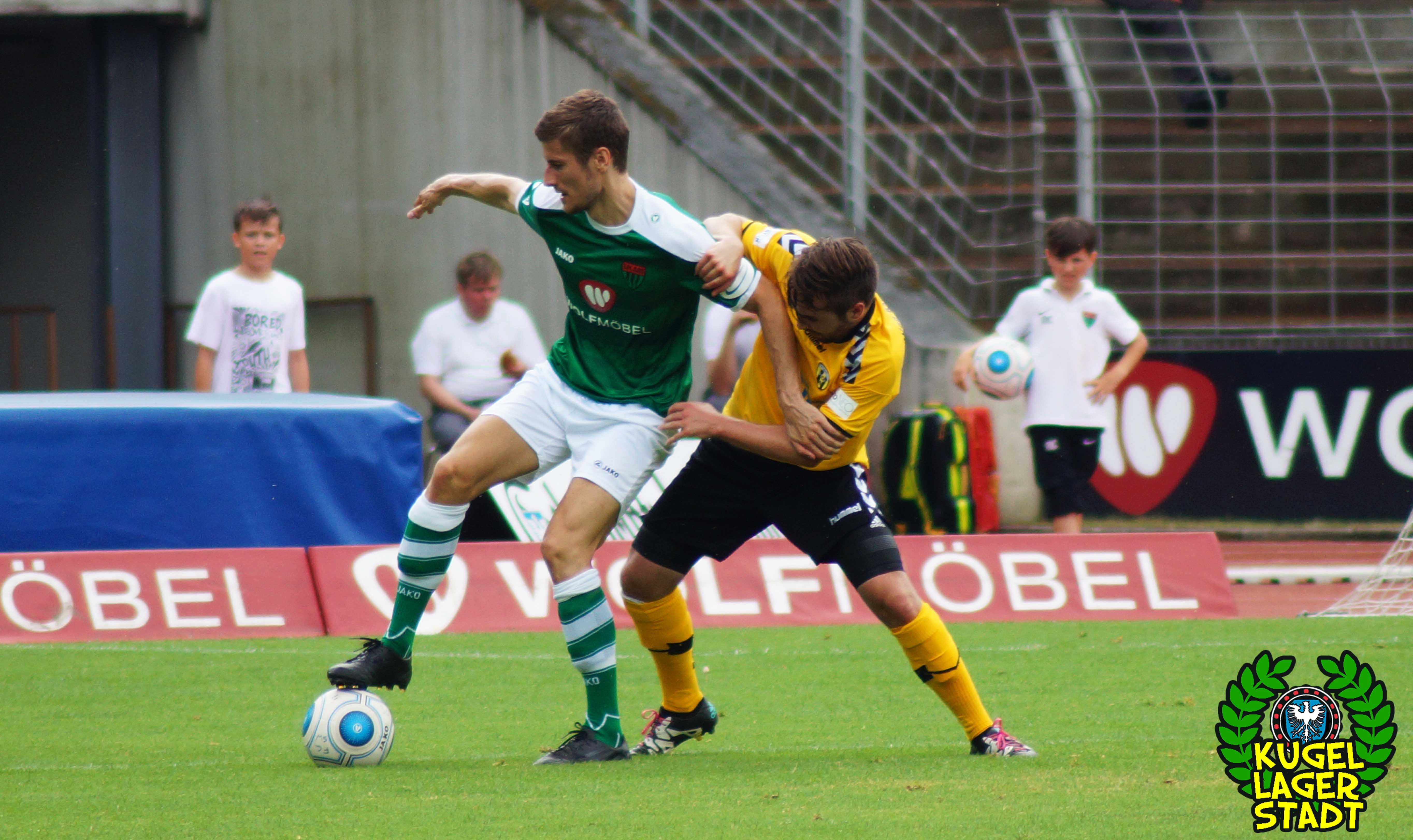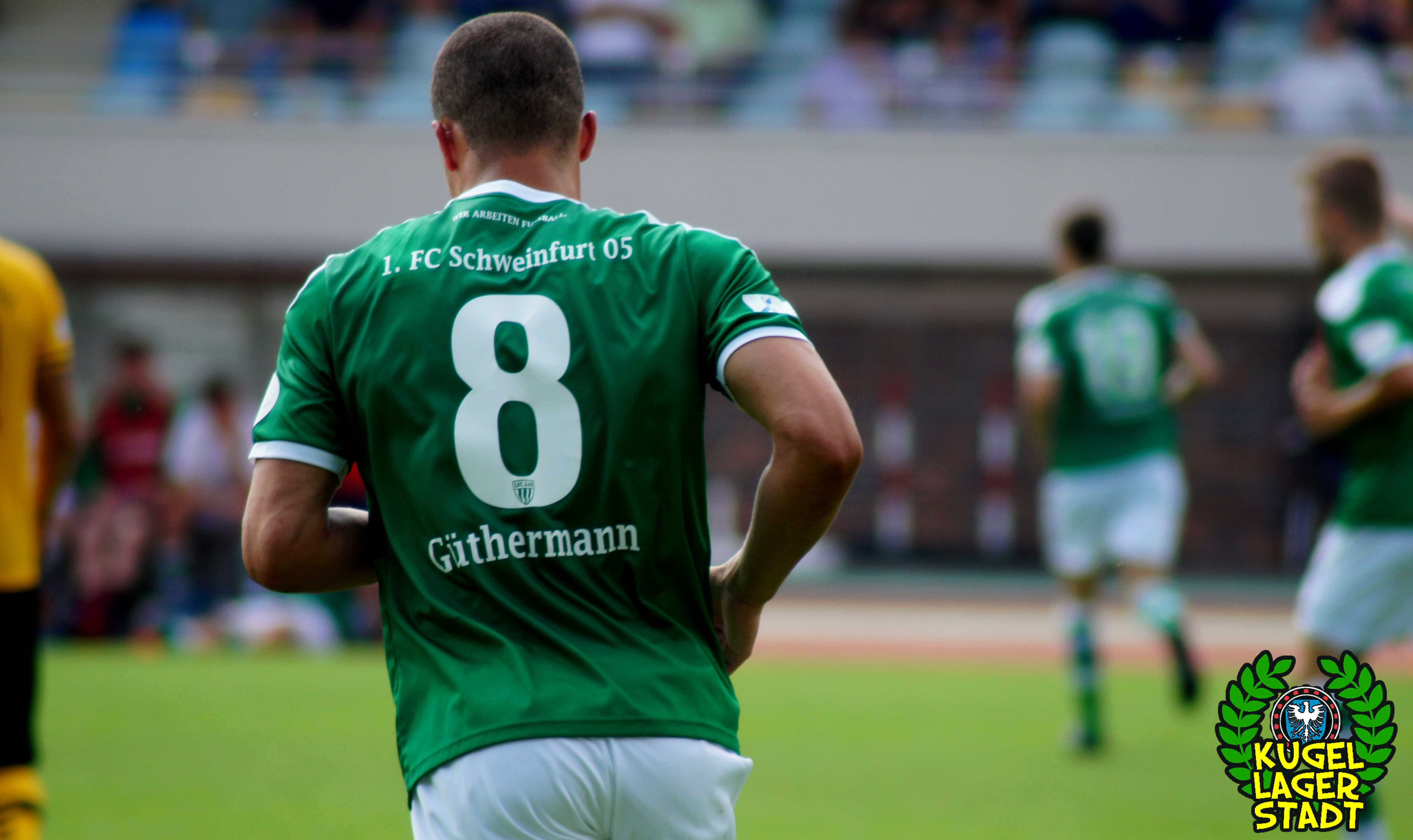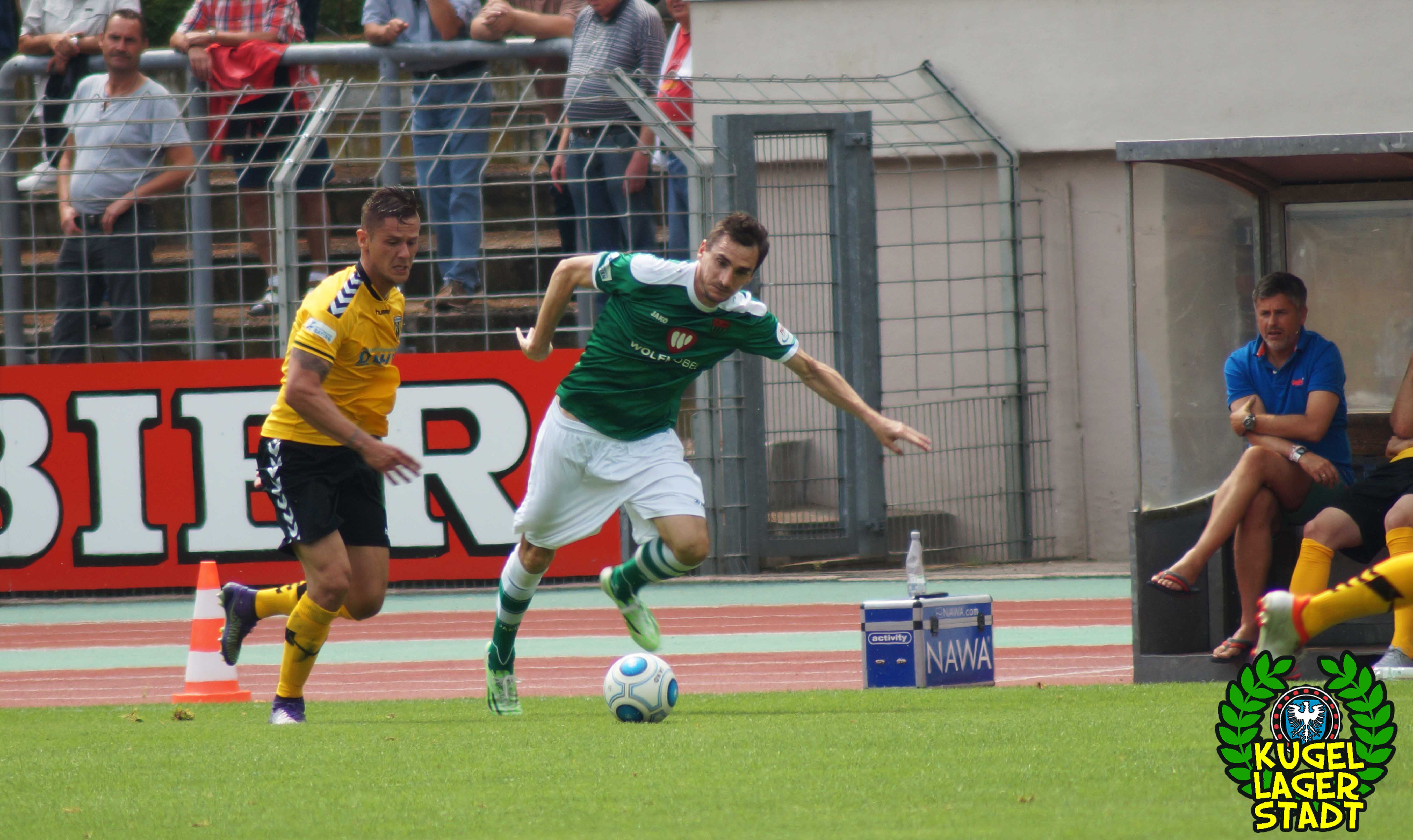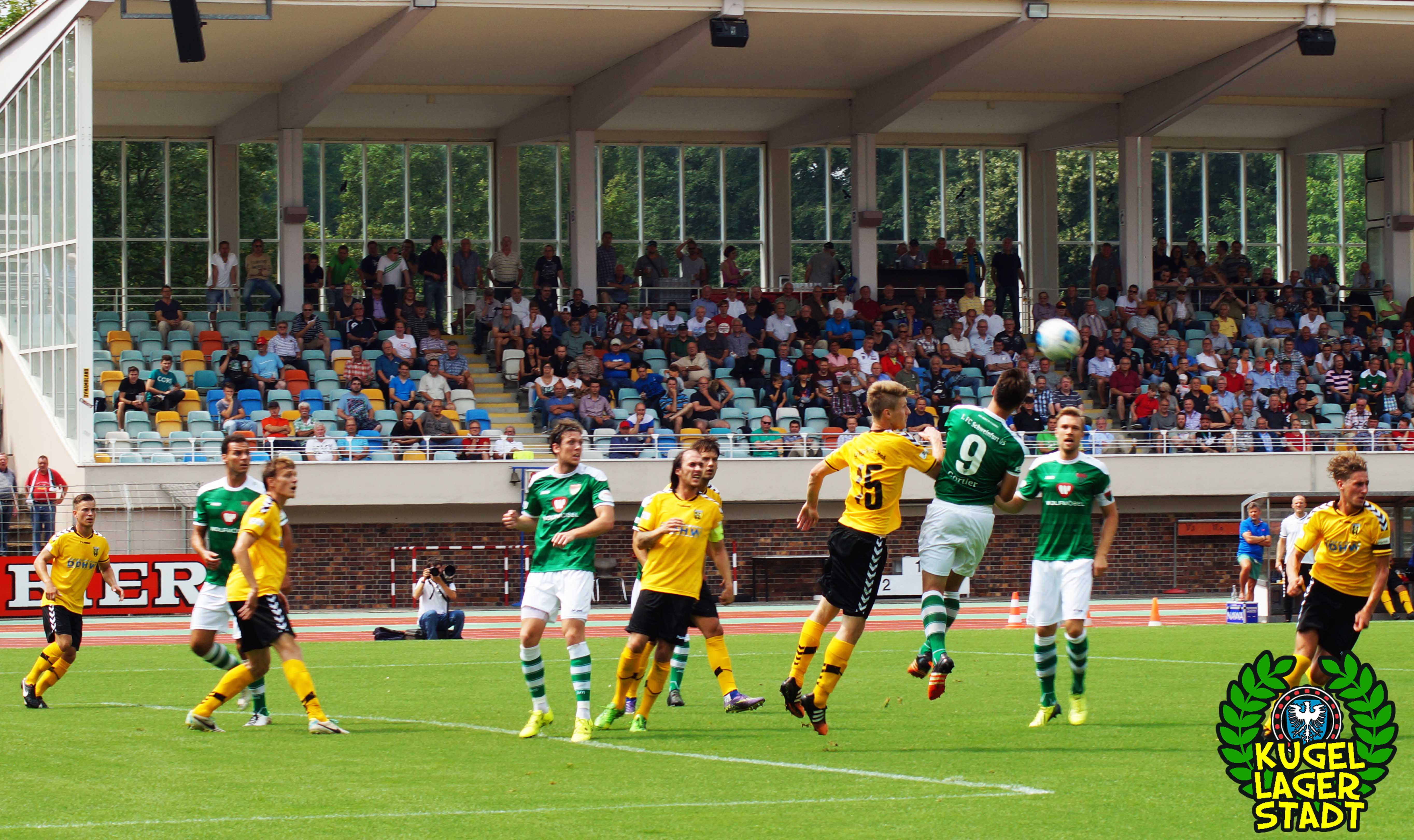 Zum sportlichen Geschehen: Das Spiel endete so, wie die spezielle Geschichte zwischen Schweinfurt und Hof am letzten Spieltag der Saison 2013/2014 – unter Mitwirkung des SV Heimstetten – begann: Mit einem 4:3 für die Kugellagerstadt. In der ersten Halbzeit drückend überlegen, gingen unsere Jungs durch Neuzugang Marius Willsch in der 20. Spielminute in Führung. Nur fünf Minuten später der glückliche Ausgleich der Oberfranken. Kurz vor der Pause traf mit Nicolas Görtler der nächste Neuzugang zum 2:1-Pausenstand. Zu Beginn der zweiten Halbzeit ein ähnliches Bild: Unser FC05, teils furios in der Offensive, stellte durch Phillip Messingschlager schnell auf 3:1. Unser gefährlichster Akteur aus der Vorsaison, Steffen Krautschneider, ließ in der 55. Minute den Treffer zum 4:1 folgen. Nach den Auswechslungen des extrem stark aufgelegten Marius Willsch, der zu seinem Tor auch noch zwei Vorlagen beisteuerte, und Adam Jabiri, war im Schnüdelspiel ein Bruch zu erkennen. Nach einem Elfmetertreffer zum 4:2 in der 67. Minute bekamen die Hofer Bayern Auftrieb und verlagerten das Spielgeschehen zunehmend in die Schweinfurter Hälfte. So traf Schraps gute fünf Minuten vor Schluss noch zum 4:3, nachdem zuvor beste Schweinfurter Chancen auf das fünfte und gar sechste Tor vergeben wurden. Am ersten grün-weißen Heimsieg in dieser noch jungen Saison konnten die Hofer jedoch nicht mehr rütteln. AUS! DREI PUNKTE IM ERSTEN HEIMSPIEL! „Mit einem 4:4 hätte ich mich für einen geklauten Punkt entschuldigen müssen„, gab der Bayern-Trainer Miloslav Janovsky nach Abpfiff gegenüber in-und-um-sw zu. „Wenn´s fünf Minuten länger geht, geben wir den Sieg noch ab. Wir sind spielerisch schon sehr gut, gerade die spät gekommenen Zugänge sind aber noch nicht im notwendigen körperlichen Zustand“, weiß Schnüdel-Coach Gerd Klaus. Das einzig entäuschende an diesem sonst rundum gelungenen ersten Heimspiel der Saison, waren die nur 1707 Zuschauer. Da ist definitiv noch ordentlich Luft nach oben!
