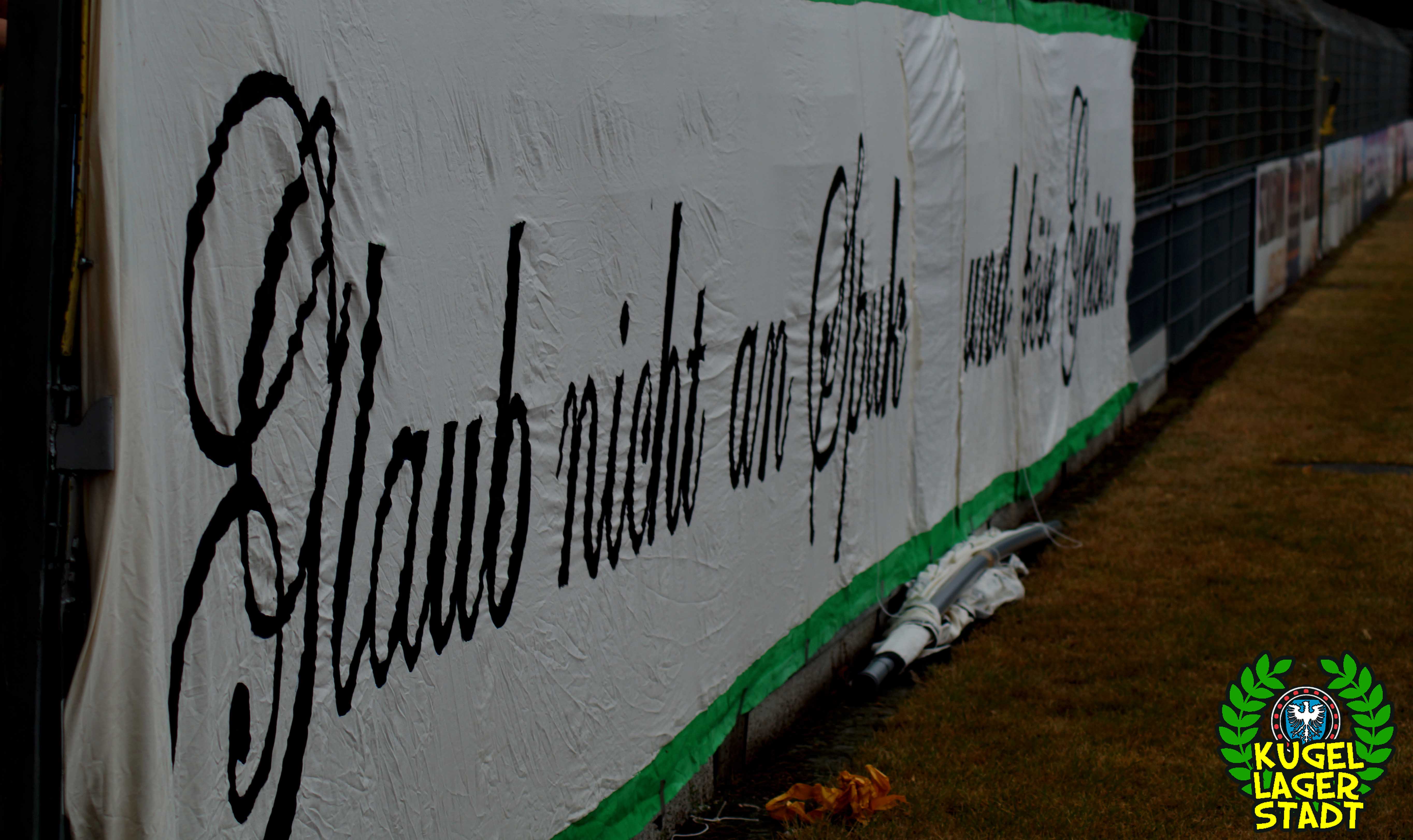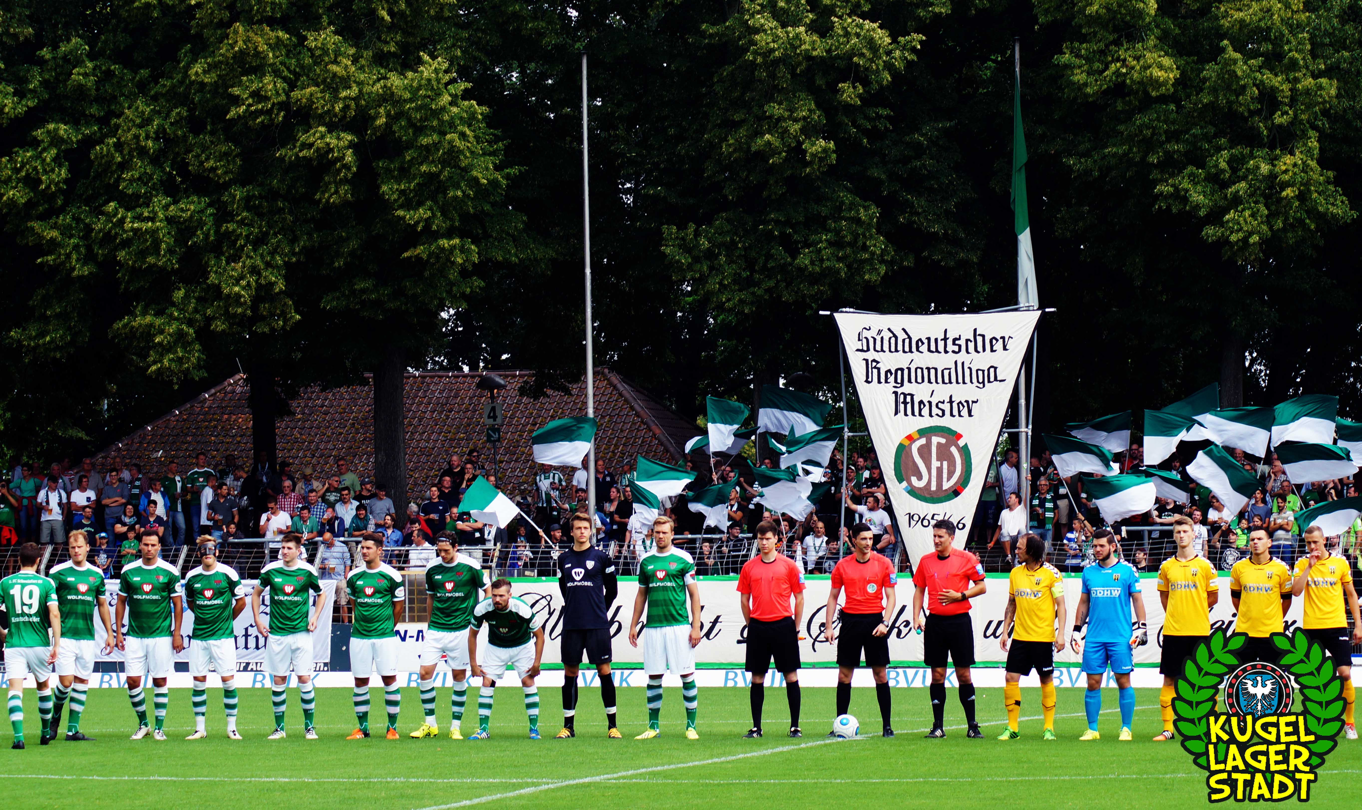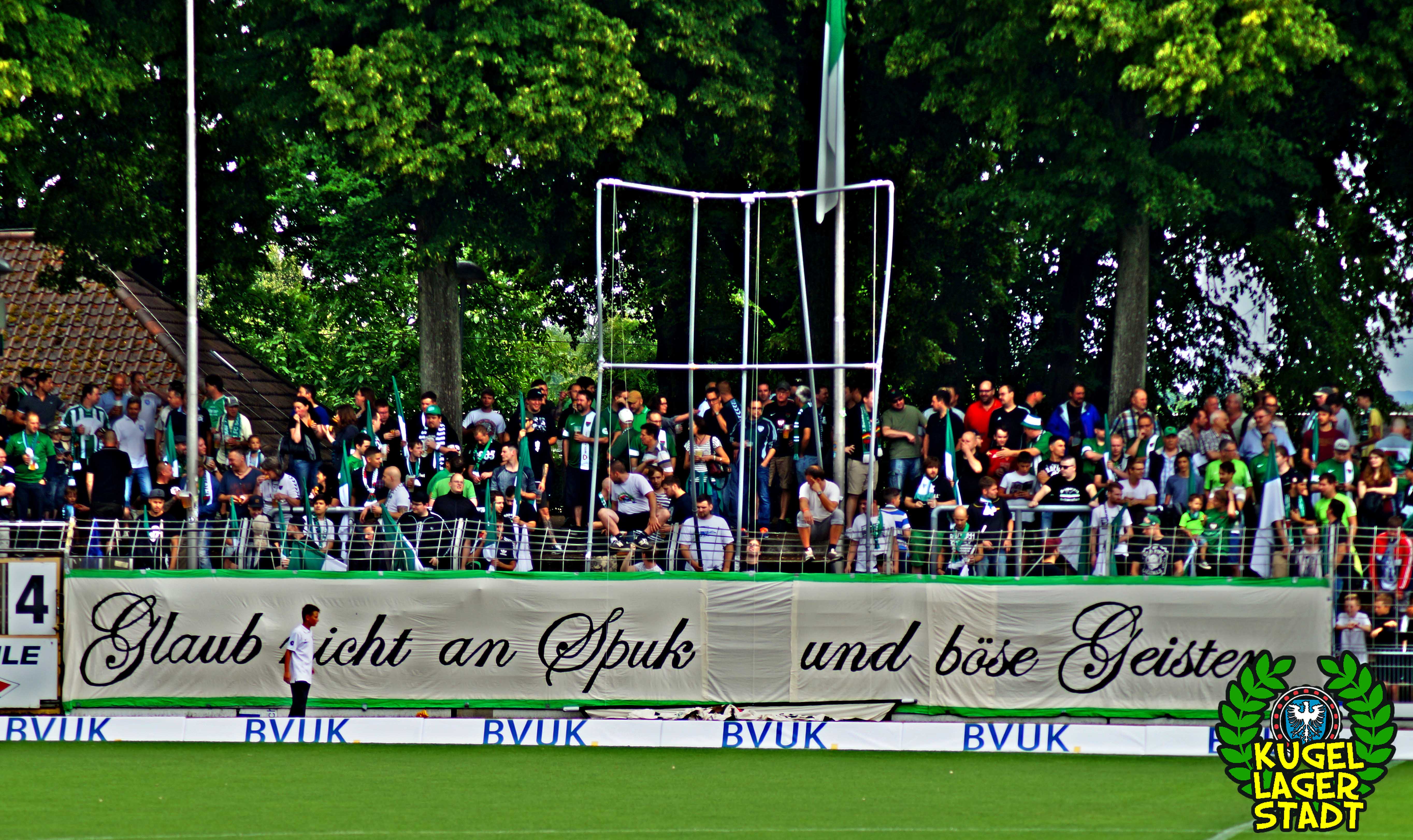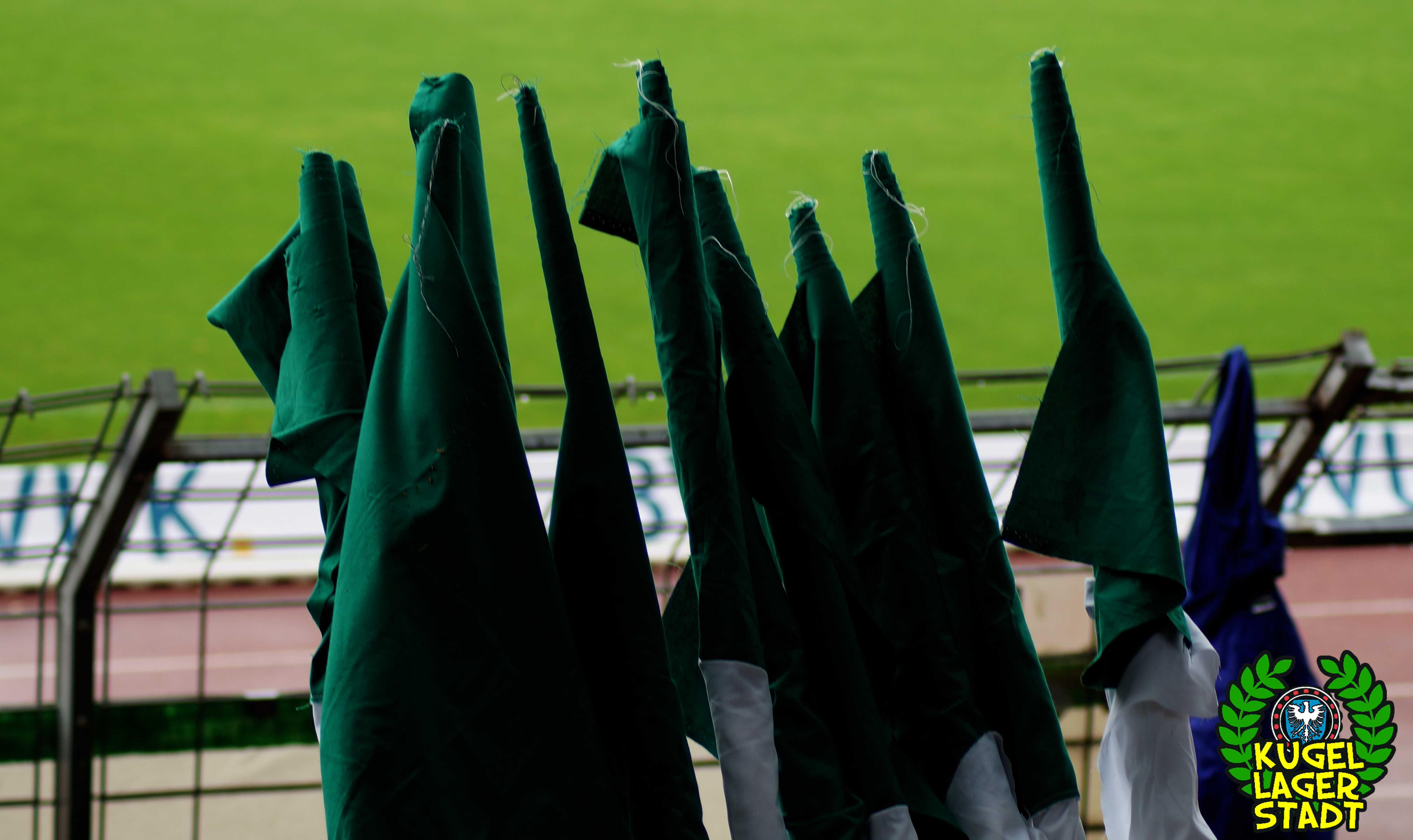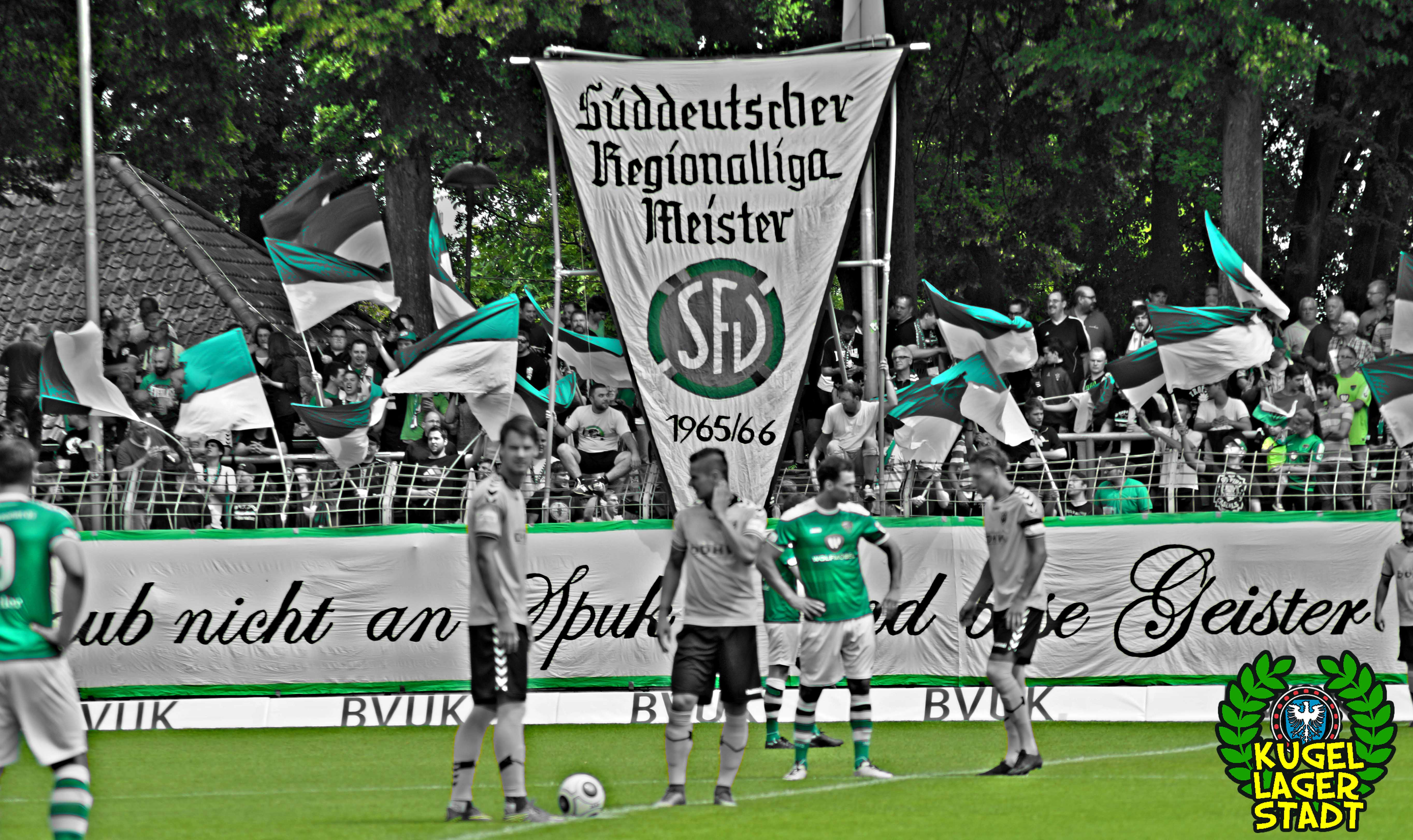 „Glaub nicht an Spuk und böse Geister – Süddeutscher Regionalliga Meister – 1965/66“! Unter diesem Motto stand die sehr gelungene Choreo, welche schon gut zwei Stunden vor Spielbeginn auf der Gegengerade vorbereitet wurde und auch die Tage zuvor zahlreiche Stunden in Anspruch nahm. Hut ab! Was dann pünktlich zum Einlaufen unserer Schnüdel im Block gezeigt wurde, war aller Ehren wert und machte ordentlich was her! Eine Menge an grün-weißen Schwenkfahnen umrahmten wehend den großen Wimpel, der an einer Stangenkonstruktion hochgezogen und vom Spruchband am Zaun abgerundet wurde. Im Block der Hofer – mit immerhin einer einzigen Zaunfahne – wurde von den 46 Gästen ein bisschen Konfetti geworfen, das war es dann. Kurz vor Anpfiff wurde der Egenhäuser Jung „Michel“ Kraus, nach seinem Wechsel nach Euerbach, verabschiedet. Danke Michel, für deinen vorbildlichen Einsatz im Trikot unserer Schnüdel und alles Gute in Euerbach! Während der Partie wurde die große „SV“-Fahne geschwungen und auch eine neue, sehr hübsch anzusehende Fahne mit Vereinswappen war zu sehen.