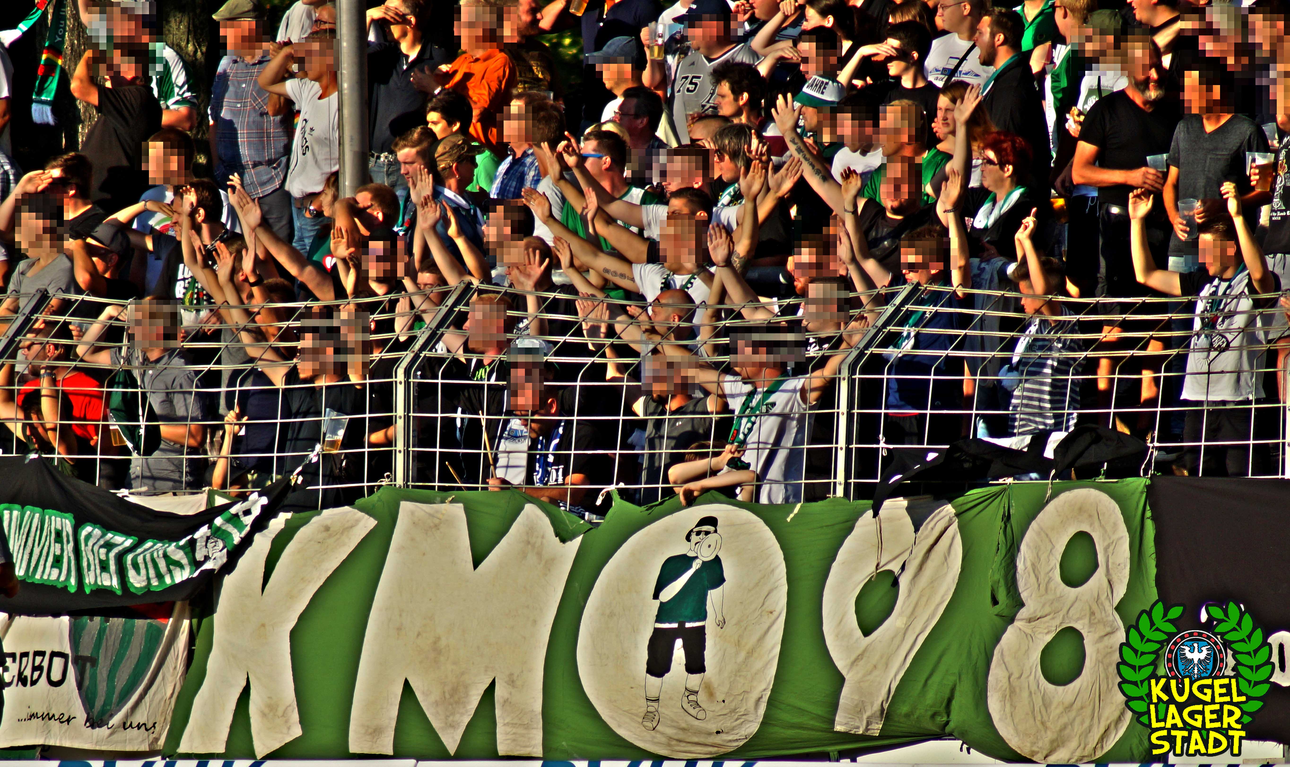 Fantechnisch war im Gästeblock nicht allzu viel los: Eine Zaunfahne aus dem Umland war neben ca. 20 Gästegestalten zu sehen, die zu Spielbeginn von mindestens genauso vielen Beamten beäugt wurden. Akustisch reagierte man im Gästeblock meist auf Gesänge der Gegengerade – Stichwort: „Nürnberger/Schweinfurter Arschlöcher“. Die Gegengerade war vereinzelt lautstark zu vernehmen, und gab insbesondere nach dem 1:2-Anschlusstreffer noch einmal alles und ein ordentliches Bild ab. Ab und an waren, neben der üblichen Zaunbeflaggung, auch grün-weiße Schwenker zu sehen.