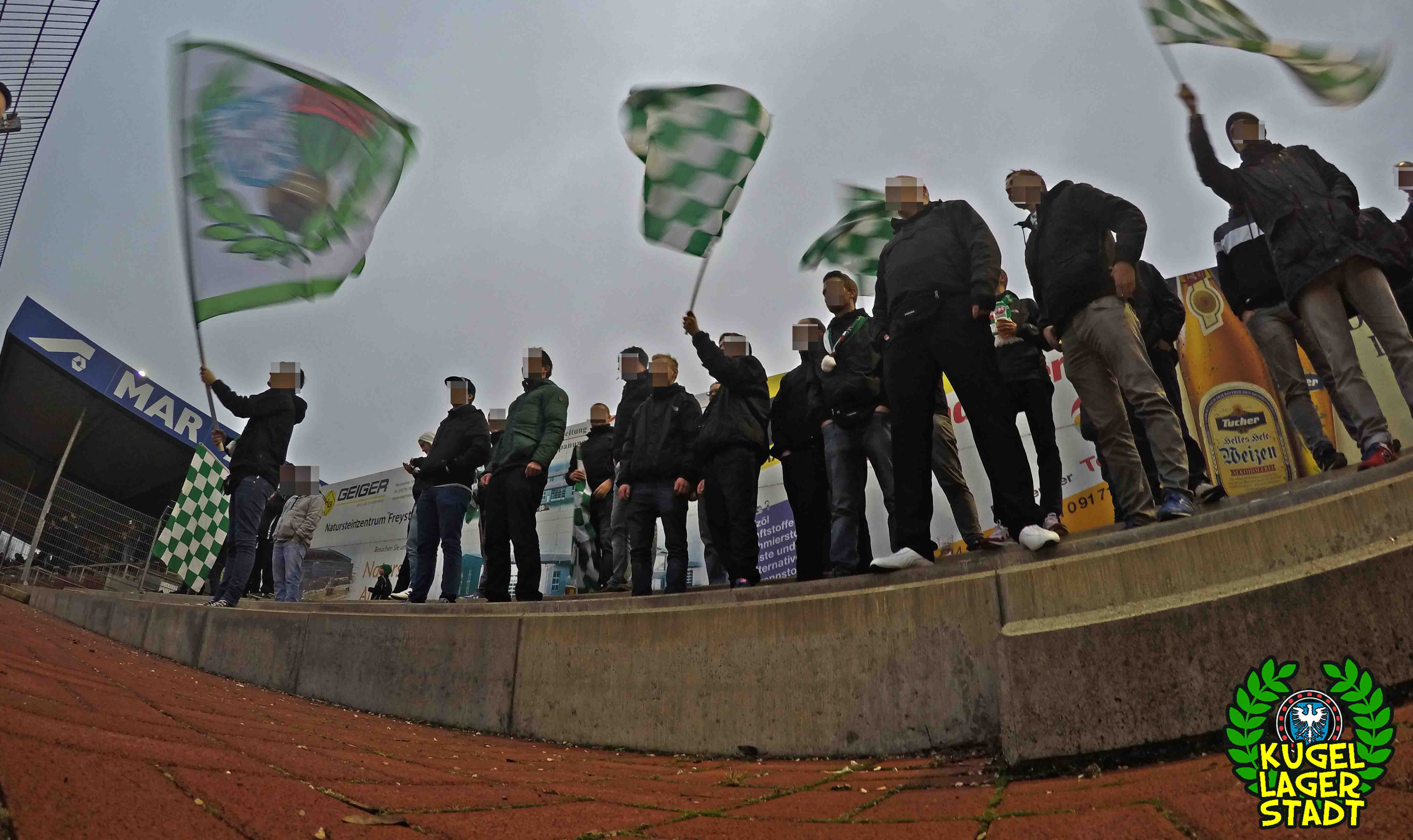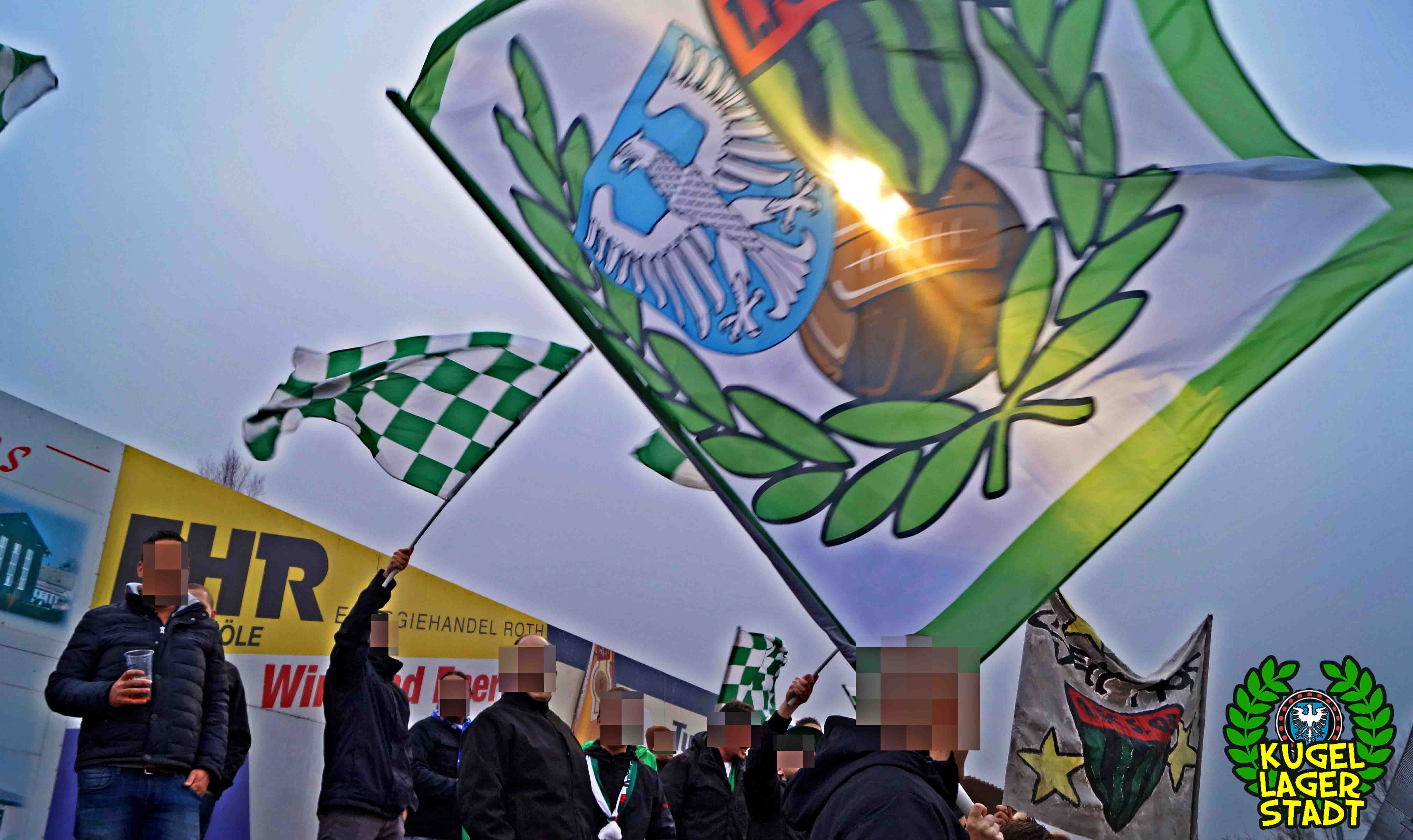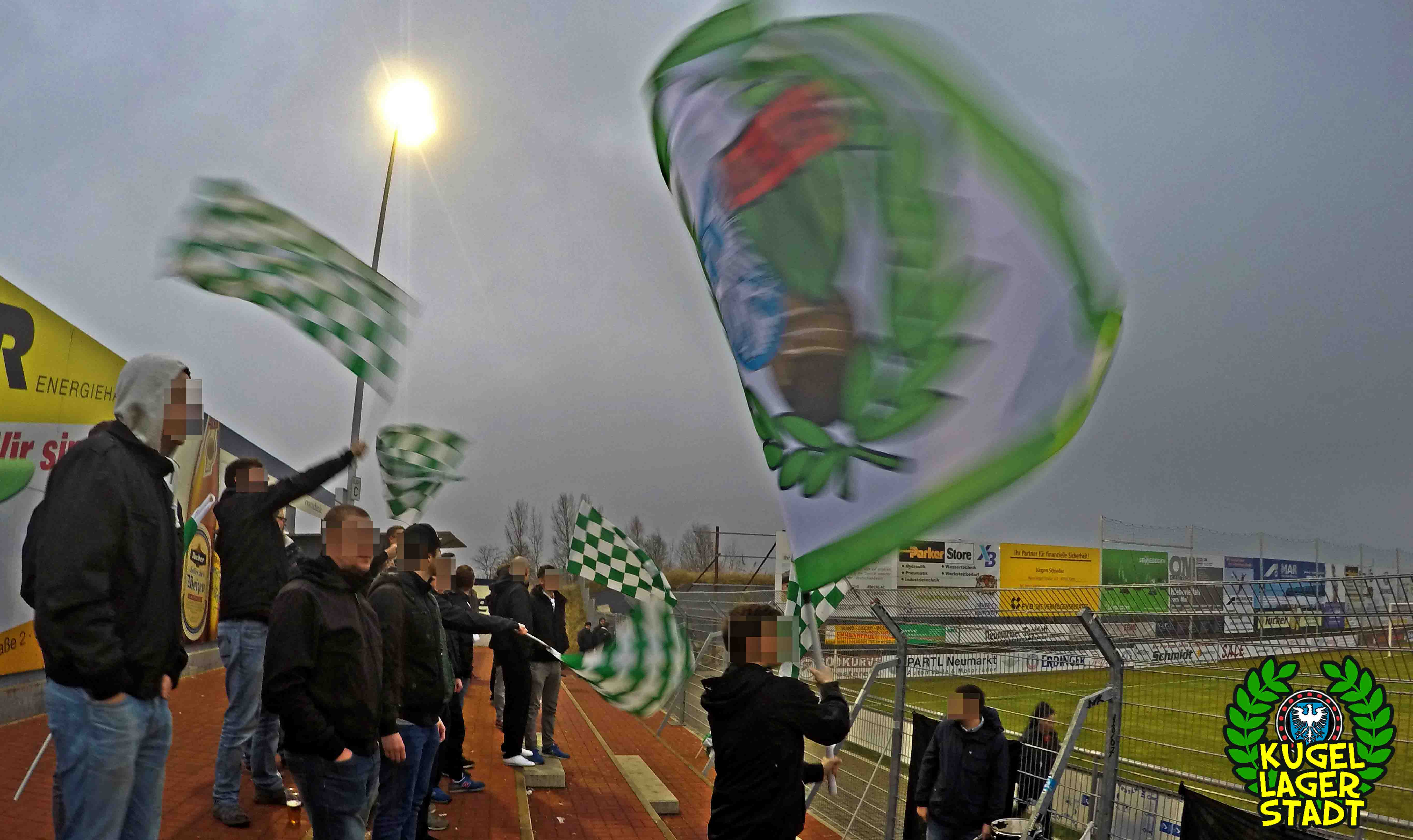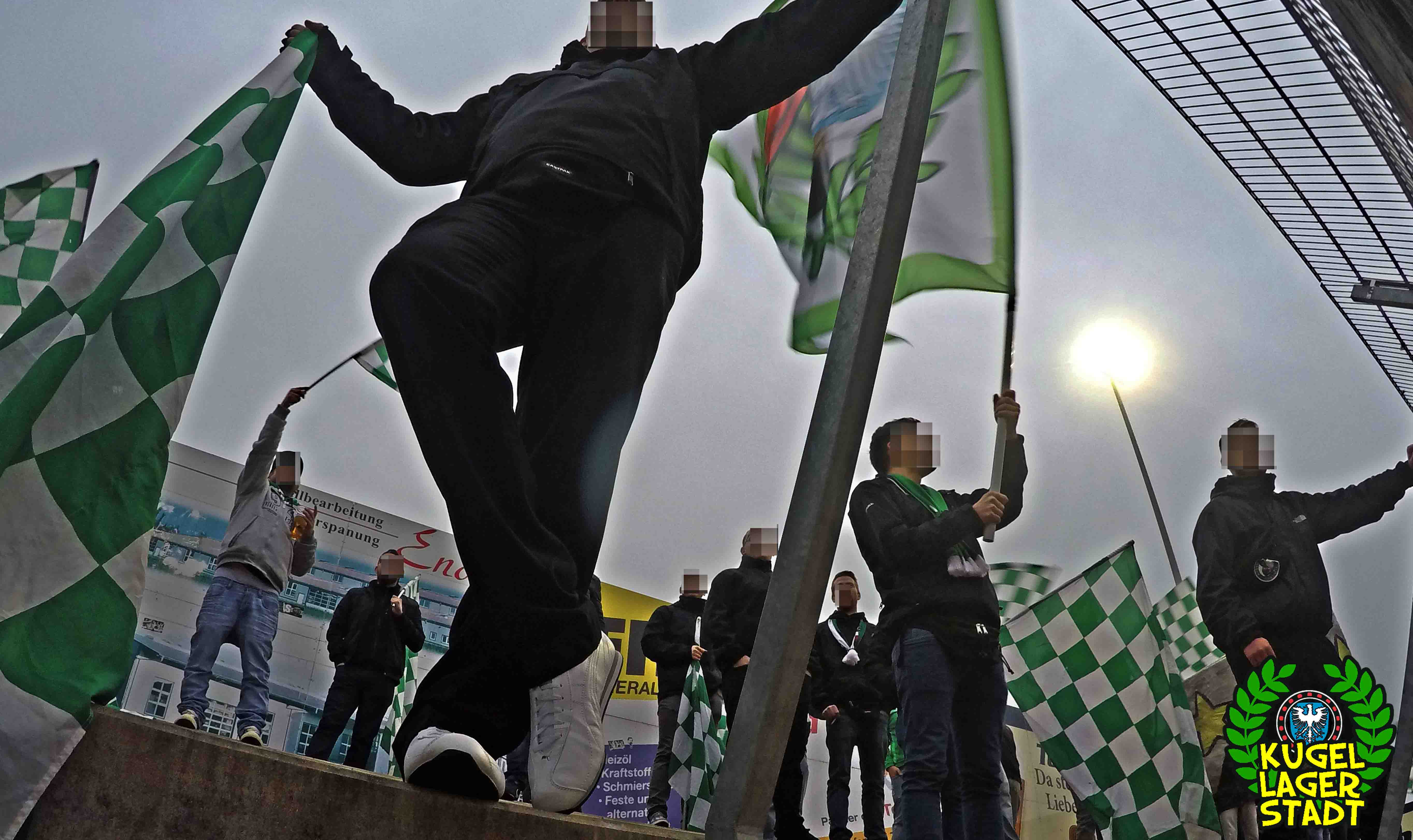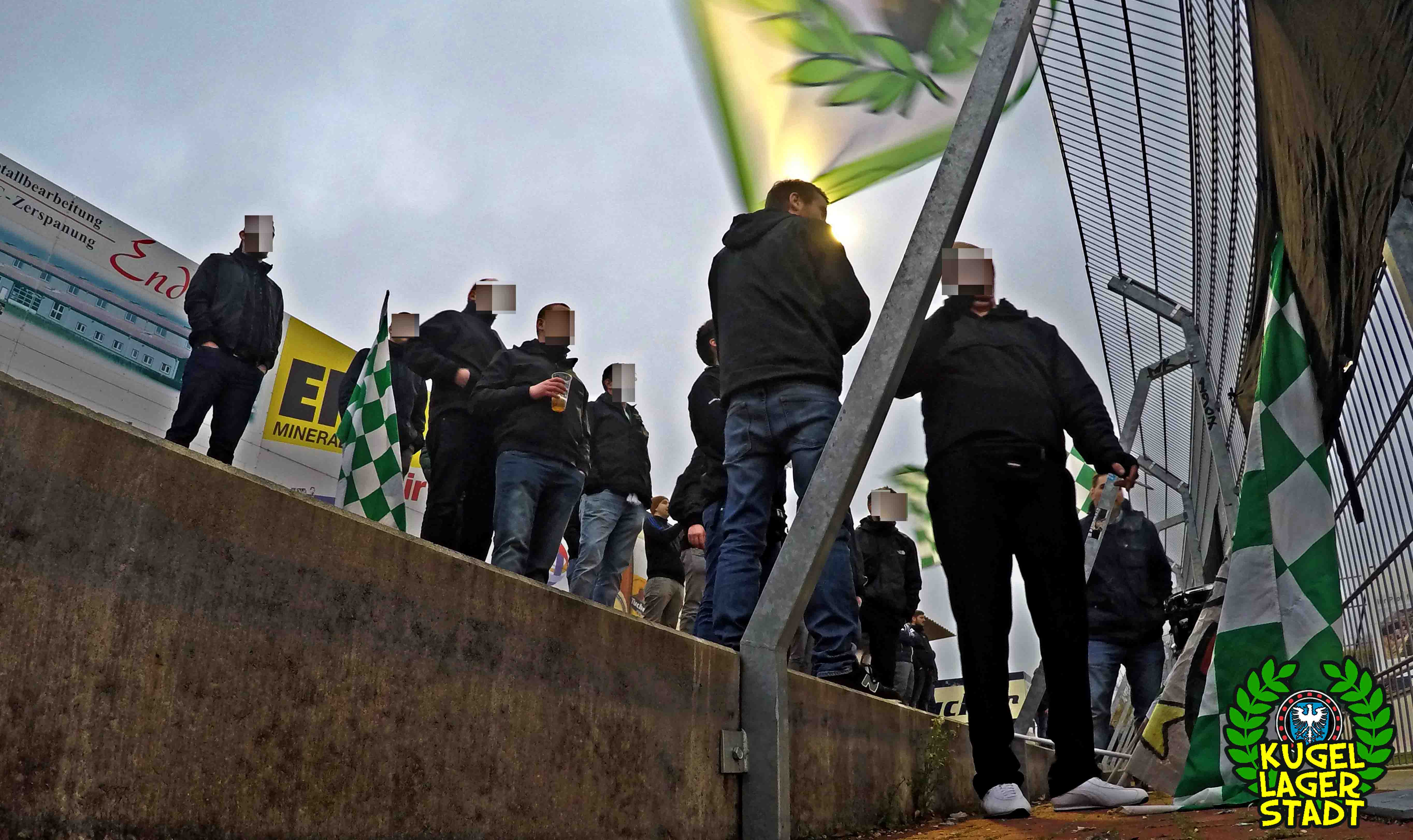 Die Stadtgrenze in Form der Hahnenhügelbrücke war gerade so passiert, als auch schon die Toilettentür streikte. Einfach so, ohne jegliche Fremdeinwirkung, so munkelt man. Nach zwei kurzen Zwischenstops, welche zur Aufnahme weiterer Mitreisender führten und unseren sogenannten Busfahrer zu vogelwilden Rangiermanövern an der ARAL-Tankstelle zwangen (O-Ton: „Ach du Schei**, was fährt der denn zusammen? Hat mal jemand kontrolliert, ob der gute Mann nüchtern ist?!“) kam letztendlich ein gutgelaunter Schnüdelbus am Zielort (nicht München!) an. Für die angehenden Geographen unter uns: Seligenporten ist ein Ortsteil des Marktes Pyrbaum im oberpfälzischen Landkreis Neumarkt in der Oberpfalz und liegt ca. 20 Kilometer südöstlich von Nürnberg. Laut Wikipedia beherbergt Seligenporten zum 25. Mai 1987 (!) genau 1001 Einwohner, wenn man der Lügenpresse an dieser Stelle glauben schenken darf. Aktuellere Zahlen waren ohne harte Rechereche nicht aufzutreiben. Schade eigentlich. Über einen Feldweg ging es einmal rund um die MAR-Arena, bis der Bus schließlich punktgenau vor einem Misthaufen (!) zum Stehen kam. Handgezählte 4 Polizeibusse und 3 Polizei-PKW samt schwarz gekleideter Besatzung (ca. 20) nahmen uns vor diesem Misthaufen (angenehm zurückhaltend) in Empfang. Ein Beitrag bezüglich Steuerverschwendung in Mario Barths investigativer Show „Mario Barth deckt auf“ dürfte uns bzw. dem bayerischen Staat damit eigentlich sicher sein. Bevor es für ermäßigte sieben Euro in die Südkurve den Gästeblock ging, wurden noch die drei Dixis mit Schweinfurter Aufklebern bekannt gemacht, sorry, leider geil. Nachdem noch schnell einigen bekannten Schweinfurter Gesichtern auf der benachbarten Tribüne „Servusla“ gesagt wurde und die neuerworbene GoPro zielsicher in Stellung gebracht wurde, pfiff der Schiedsrichter die Partie an.