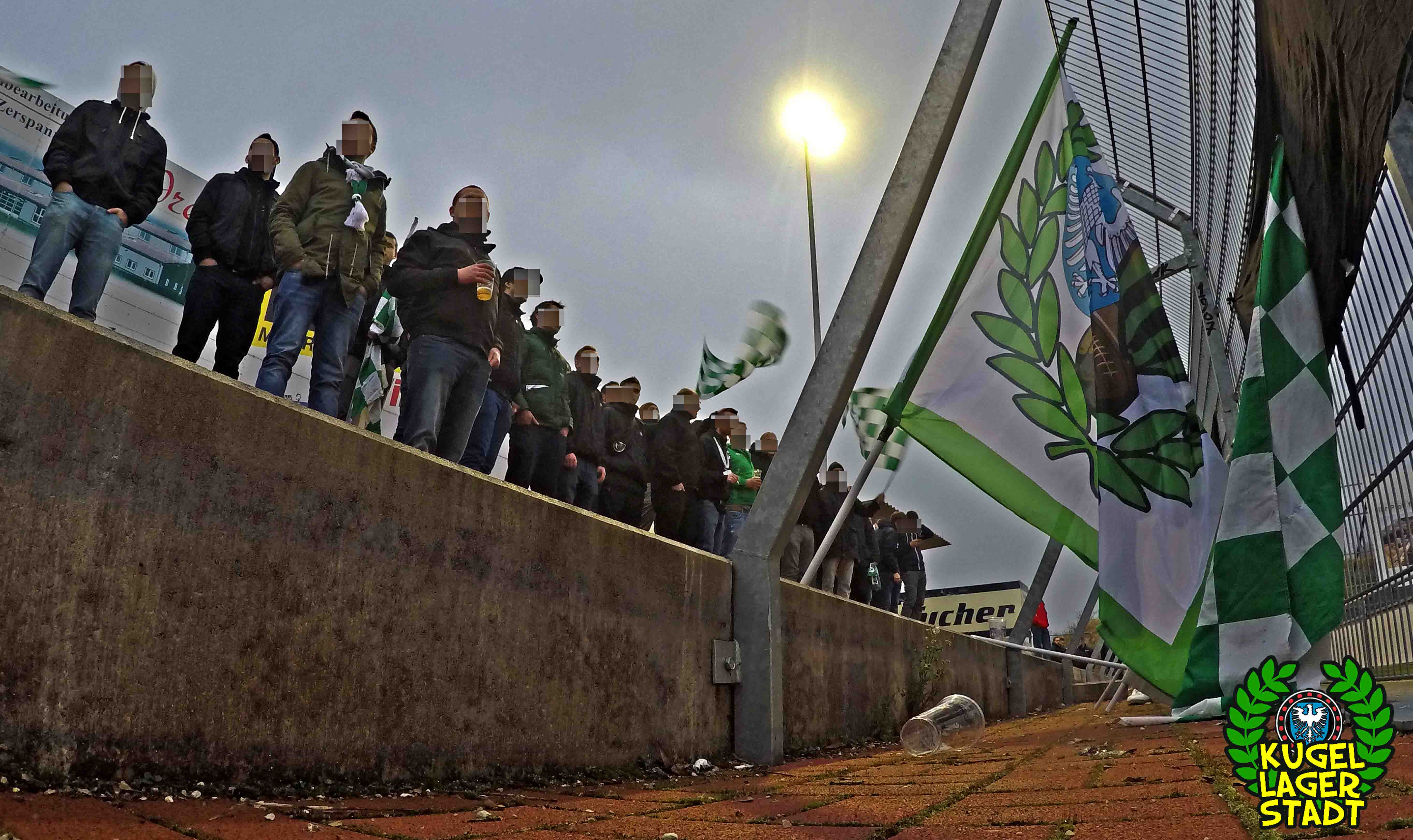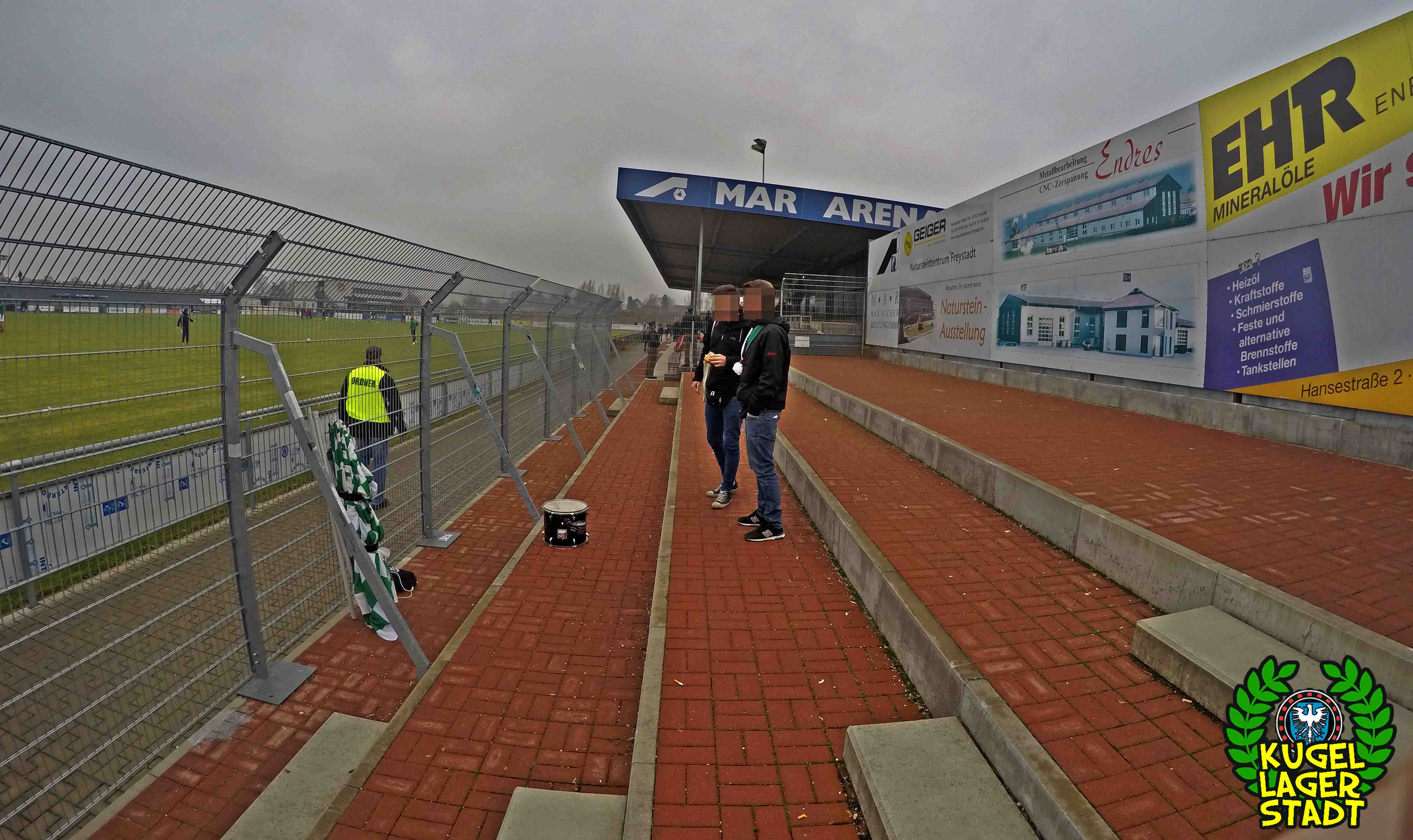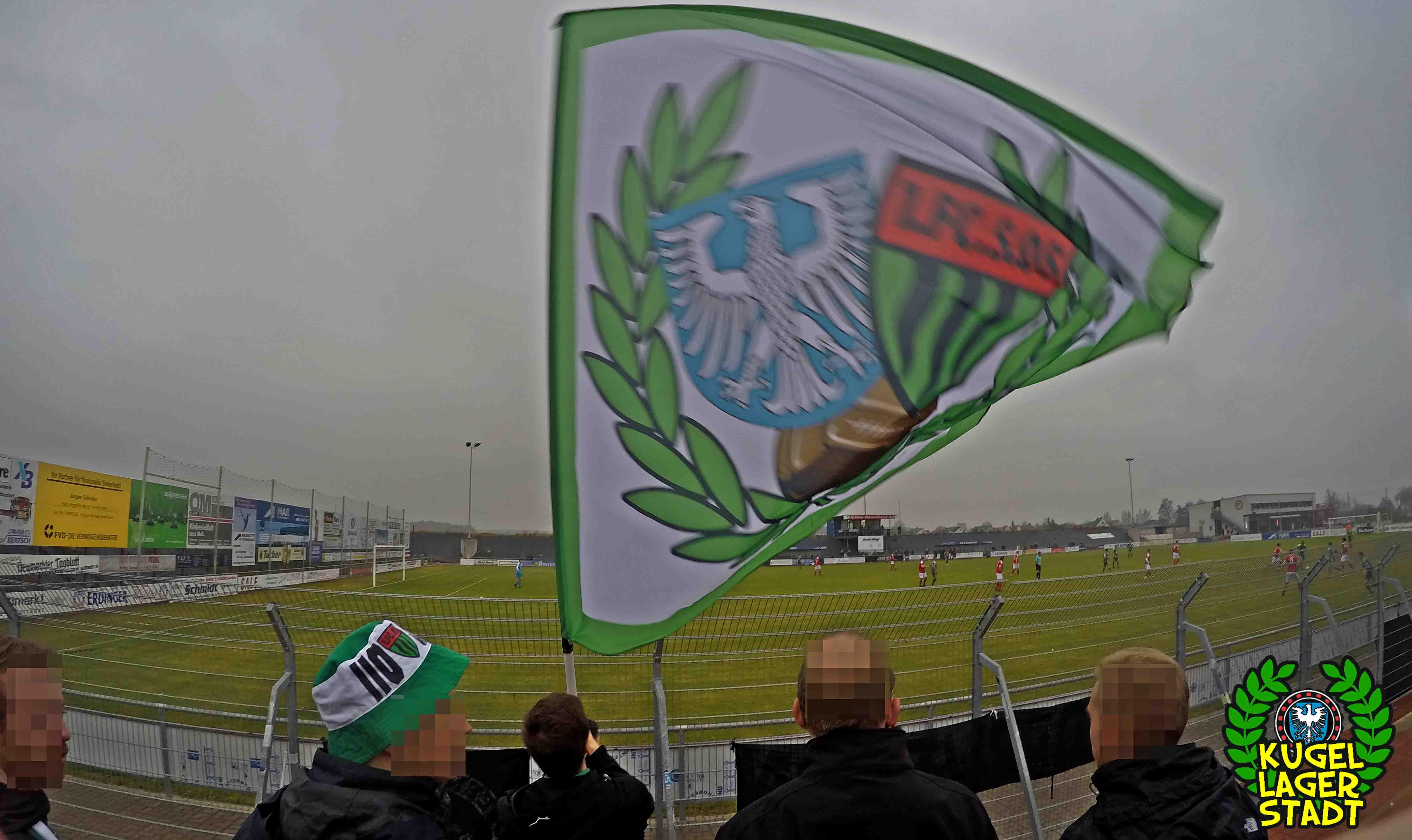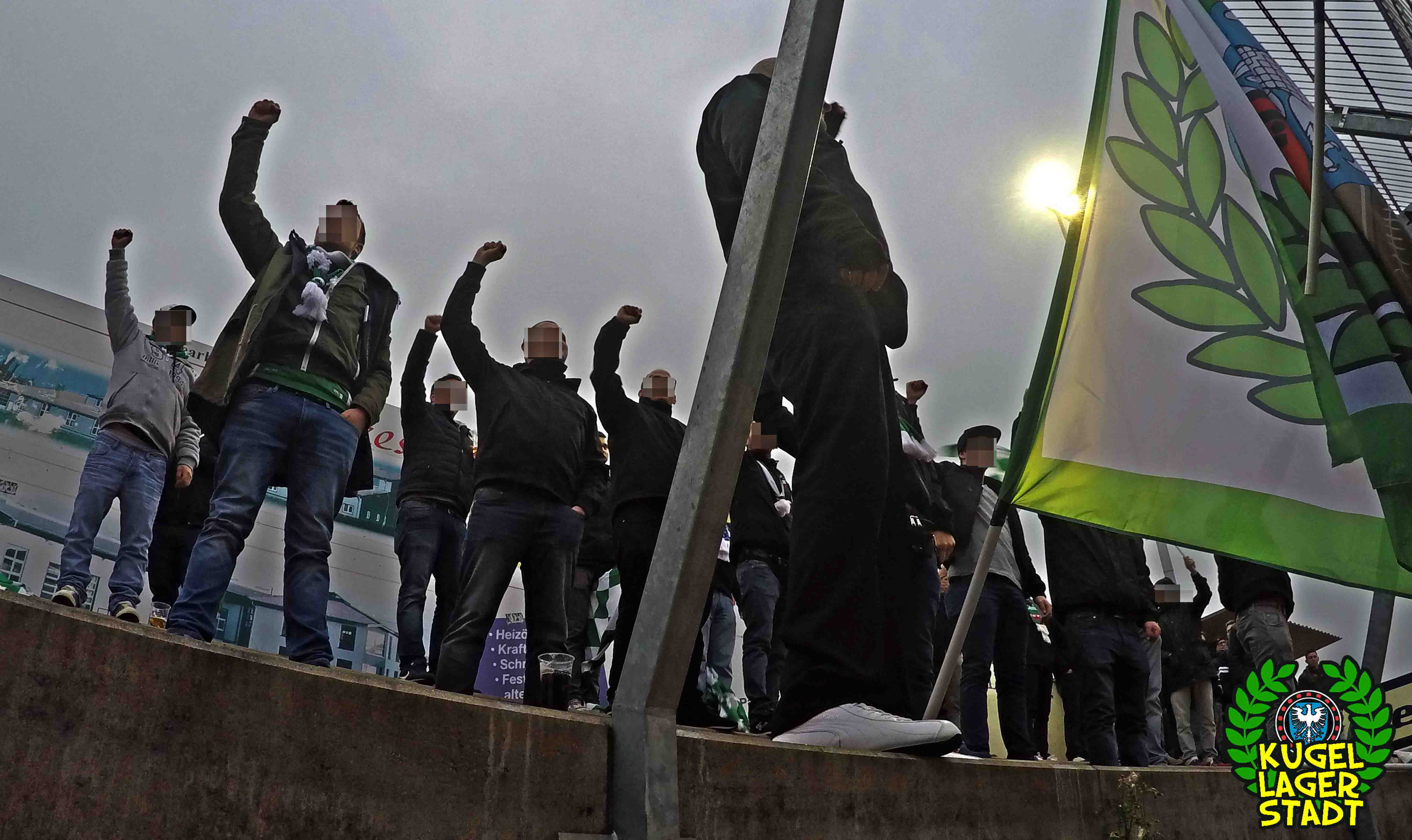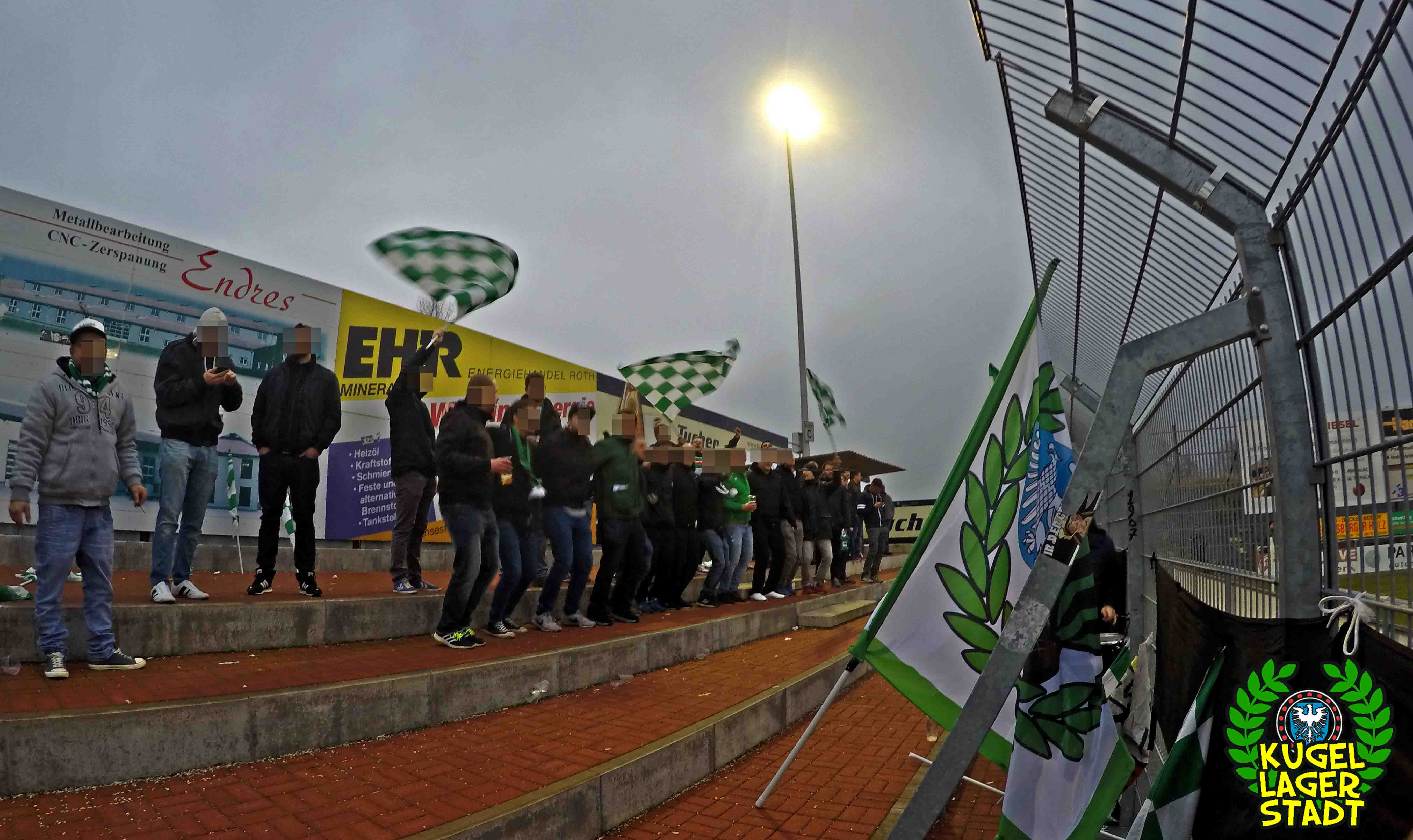 Die Stadtgrenze in Form der Hahnenhügelbrücke war gerade so passiert, als auch schon die Toilettentür streikte. Einfach so, ohne jegliche Fremdeinwirkung, so munkelt man. Nach zwei kurzen Zwischenstops, welche zur Aufnahme weiterer Mitreisender führten und unseren sogenannten Busfahrer zu vogelwilden Rangiermanövern an der ARAL-Tankstelle zwangen (O-Ton: „Ach du Schei**, was fährt der denn zusammen? Hat mal jemand kontrolliert, ob der gute Mann nüchtern ist?!“) kam letztendlich ein gutgelaunter Schnüdelbus am Zielort (nicht München!) an. Für die angehenden Geographen unter uns: Seligenporten ist ein Ortsteil des Marktes Pyrbaum im oberpfälzischen Landkreis Neumarkt in der Oberpfalz und liegt ca. 20 Kilometer südöstlich von Nürnberg. Laut Wikipedia beherbergt Seligenporten zum 25. Mai 1987 (!) genau 1001 Einwohner, wenn man der Lügenpresse an dieser Stelle glauben schenken darf. Aktuellere Zahlen waren ohne harte Rechereche nicht aufzutreiben. Schade eigentlich. Über einen Feldweg ging es einmal rund um die MAR-Arena, bis der Bus schließlich punktgenau vor einem Misthaufen (!) zum Stehen kam. Handgezählte 4 Polizeibusse und 3 Polizei-PKW samt schwarz gekleideter Besatzung (ca. 20) nahmen uns vor diesem Misthaufen (angenehm zurückhaltend) in Empfang. Ein Beitrag bezüglich Steuerverschwendung in Mario Barths investigativer Show „Mario Barth deckt auf“ dürfte uns bzw. dem bayerischen Staat damit eigentlich sicher sein. Bevor es für ermäßigte sieben Euro in die Südkurve den Gästeblock ging, wurden noch die drei Dixis mit Schweinfurter Aufklebern bekannt gemacht, sorry, leider geil. Nachdem noch schnell einigen bekannten Schweinfurter Gesichtern auf der benachbarten Tribüne „Servusla“ gesagt wurde und die neuerworbene GoPro zielsicher in Stellung gebracht wurde, pfiff der Schiedsrichter die Partie an.