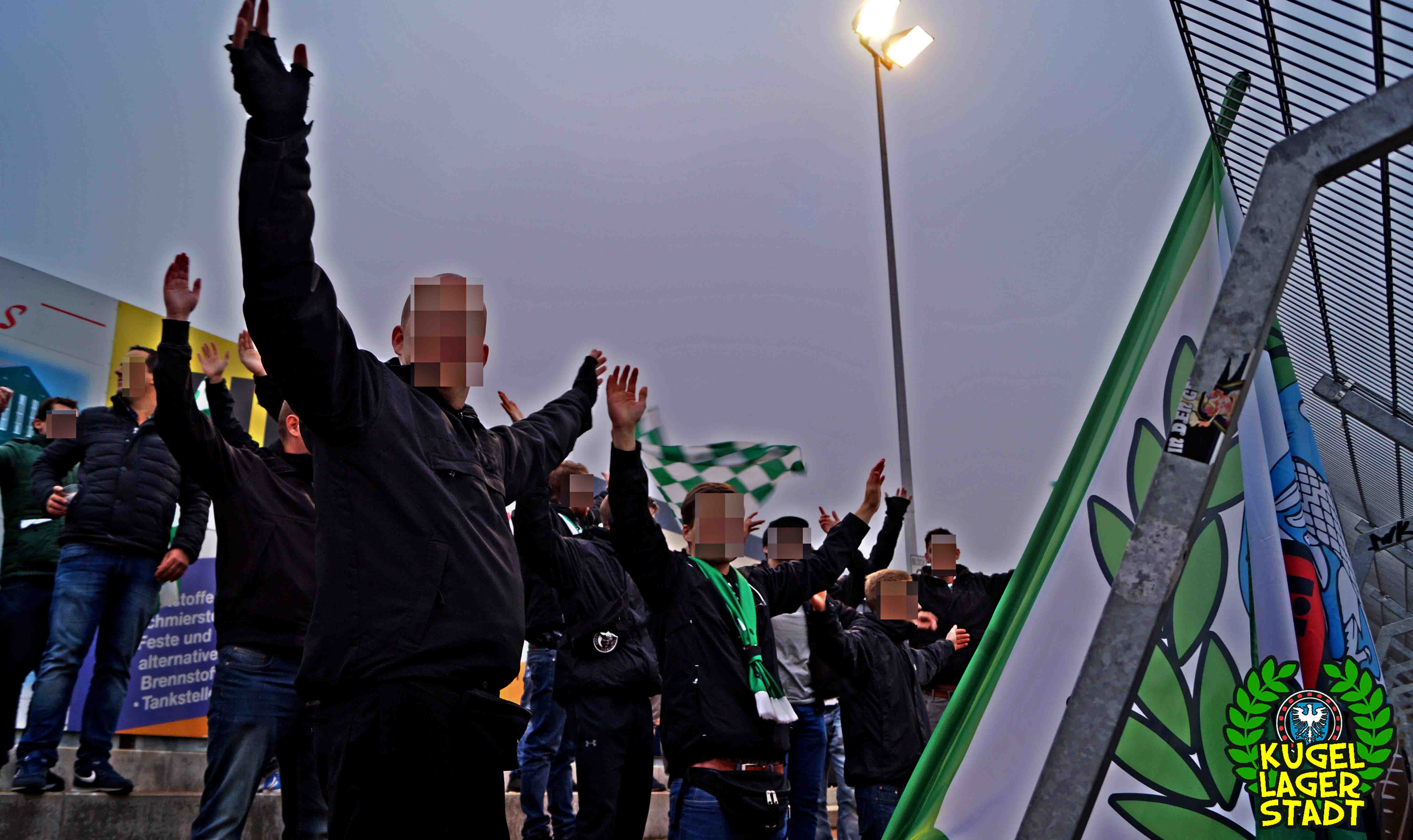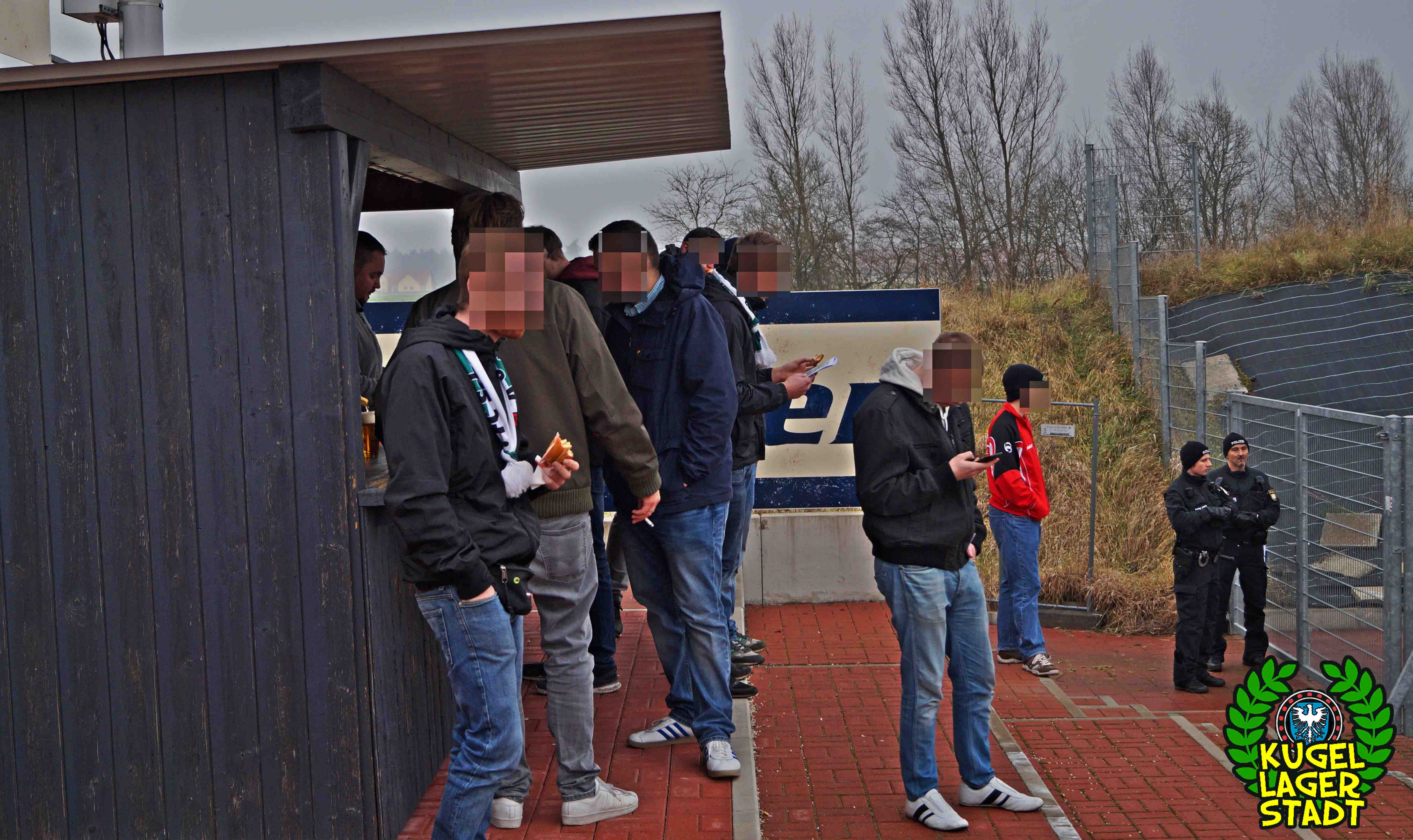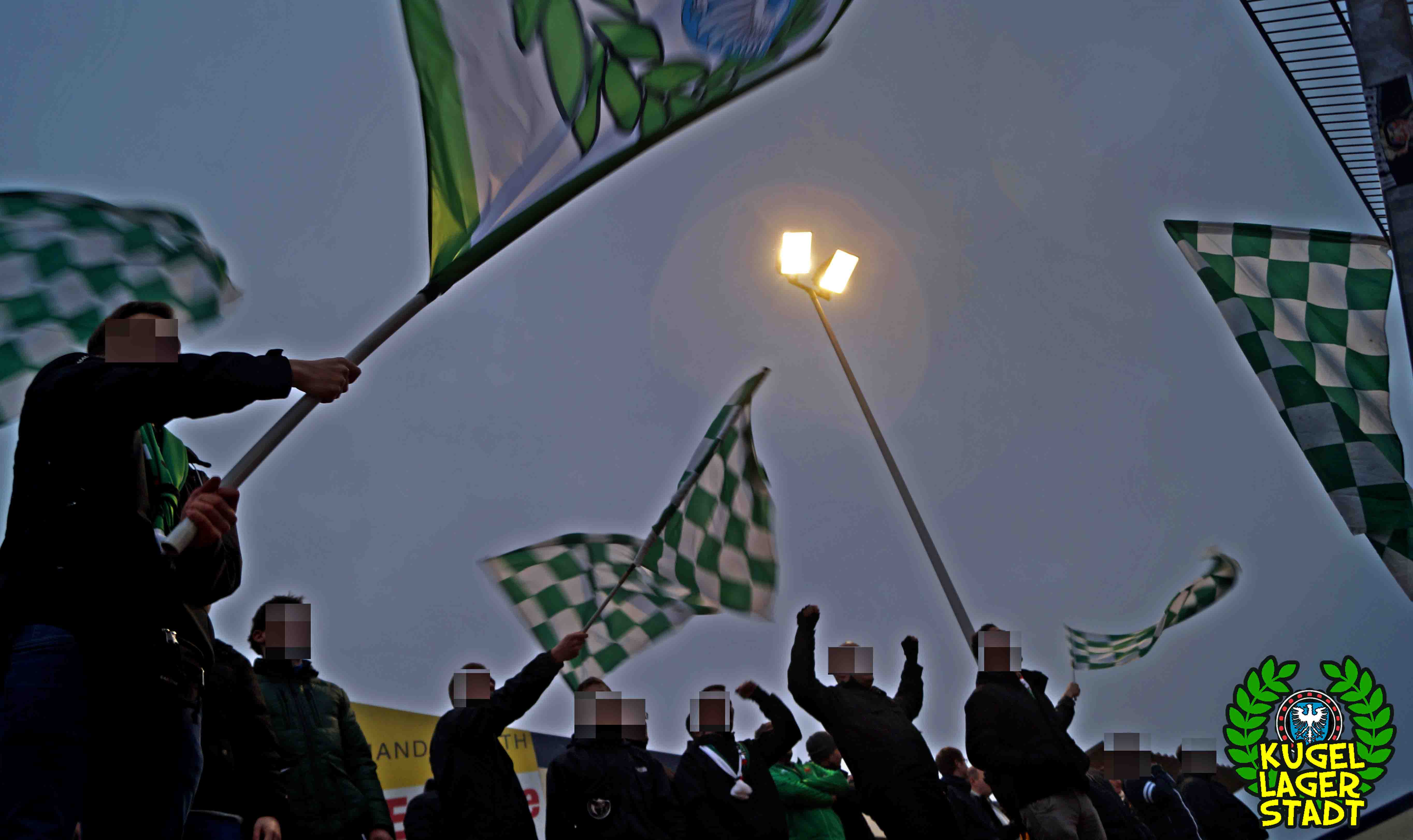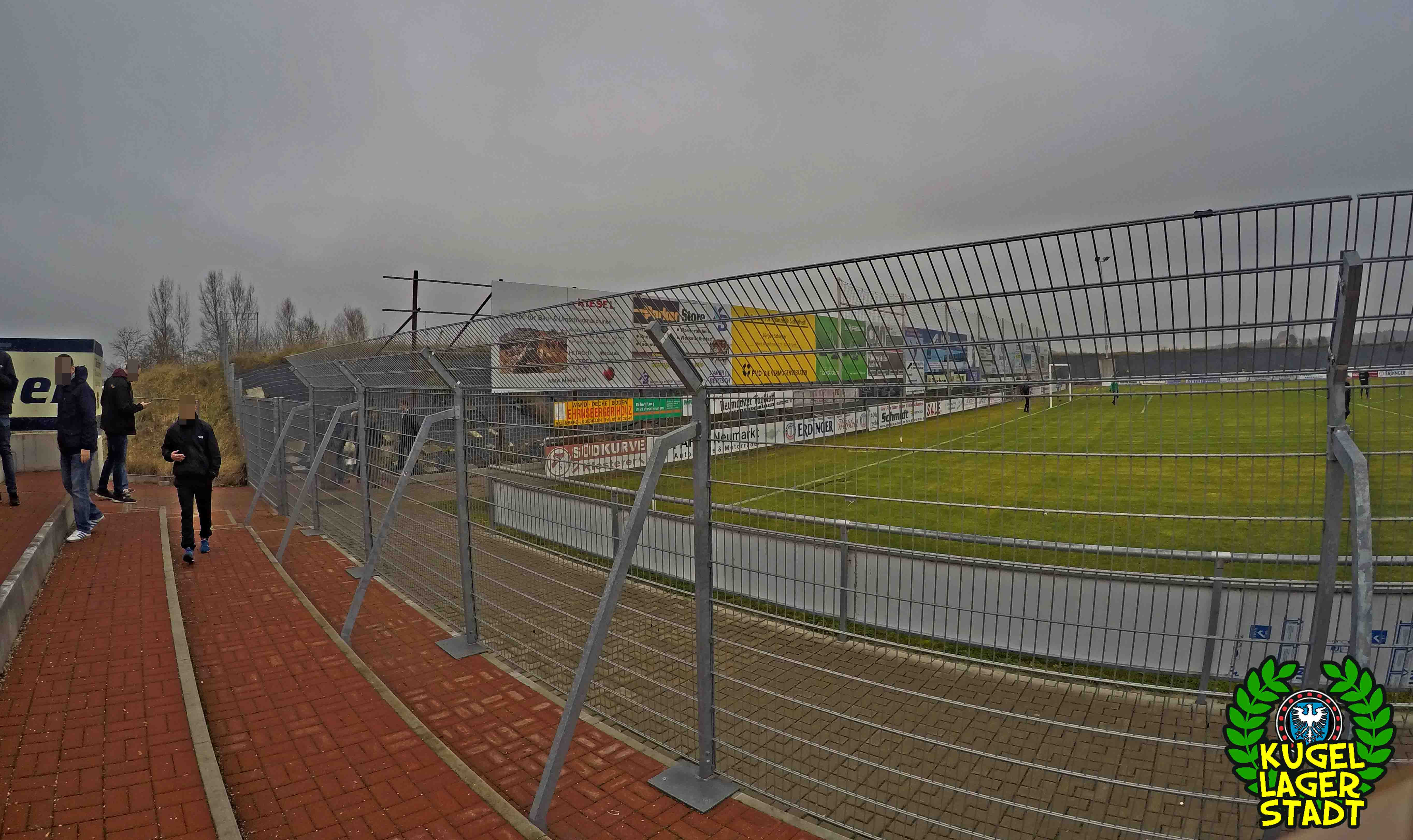 Die Stadtgrenze in Form der Hahnenhügelbrücke war gerade so passiert, als auch schon die Toilettentür streikte. Einfach so, ohne jegliche Fremdeinwirkung, so munkelt man. Nach zwei kurzen Zwischenstops, welche zur Aufnahme weiterer Mitreisender führten und unseren sogenannten Busfahrer zu vogelwilden Rangiermanövern an der ARAL-Tankstelle zwangen (O-Ton: „Ach du Schei**, was fährt der denn zusammen? Hat mal jemand kontrolliert, ob der gute Mann nüchtern ist?!“) kam letztendlich ein gutgelaunter Schnüdelbus am Zielort (nicht München!) an. Für die angehenden Geographen unter uns: Seligenporten ist ein Ortsteil des Marktes Pyrbaum im oberpfälzischen Landkreis Neumarkt in der Oberpfalz und liegt ca. 20 Kilometer südöstlich von Nürnberg. Laut Wikipedia beherbergt Seligenporten zum 25. Mai 1987 (!) genau 1001 Einwohner, wenn man der Lügenpresse an dieser Stelle glauben schenken darf. Aktuellere Zahlen waren ohne harte Rechereche nicht aufzutreiben. Schade eigentlich. Über einen Feldweg ging es einmal rund um die MAR-Arena, bis der Bus schließlich punktgenau vor einem Misthaufen (!) zum Stehen kam. Handgezählte 4 Polizeibusse und 3 Polizei-PKW samt schwarz gekleideter Besatzung (ca. 20) nahmen uns vor diesem Misthaufen (angenehm zurückhaltend) in Empfang. Ein Beitrag bezüglich Steuerverschwendung in Mario Barths investigativer Show „Mario Barth deckt auf“ dürfte uns bzw. dem bayerischen Staat damit eigentlich sicher sein. Bevor es für ermäßigte sieben Euro in die Südkurve den Gästeblock ging, wurden noch die drei Dixis mit Schweinfurter Aufklebern bekannt gemacht, sorry, leider geil. Nachdem noch schnell einigen bekannten Schweinfurter Gesichtern auf der benachbarten Tribüne „Servusla“ gesagt wurde und die neuerworbene GoPro zielsicher in Stellung gebracht wurde, pfiff der Schiedsrichter die Partie an.