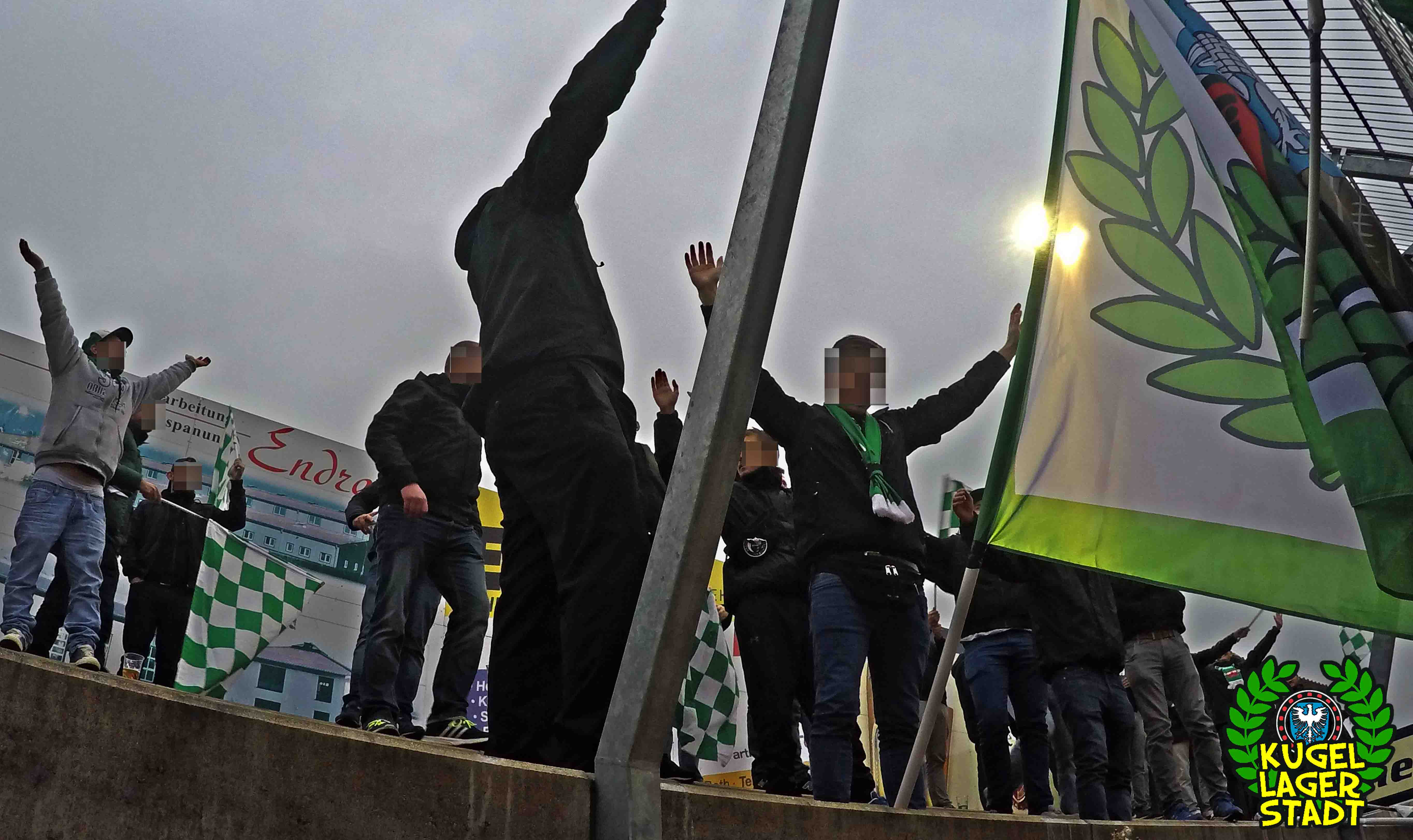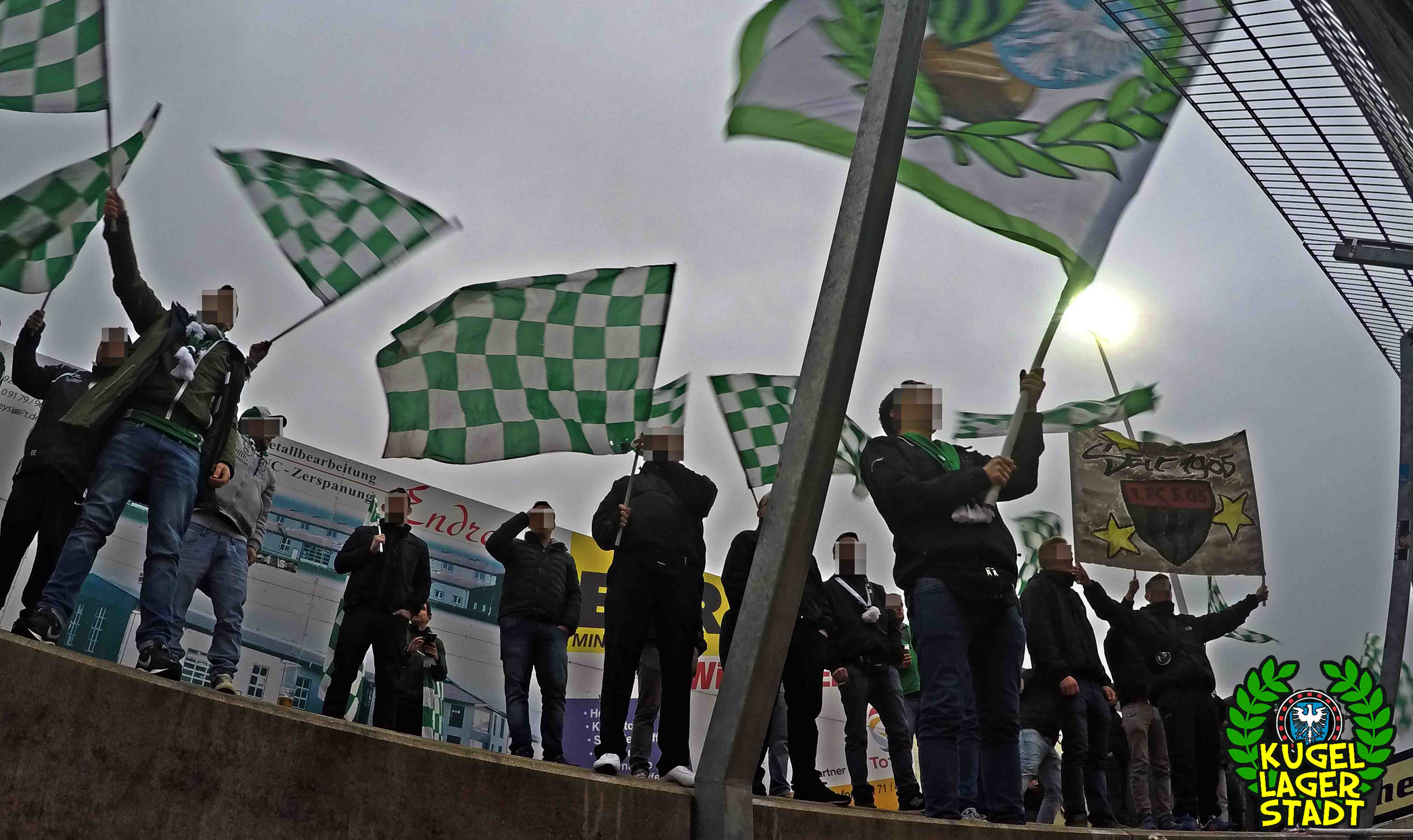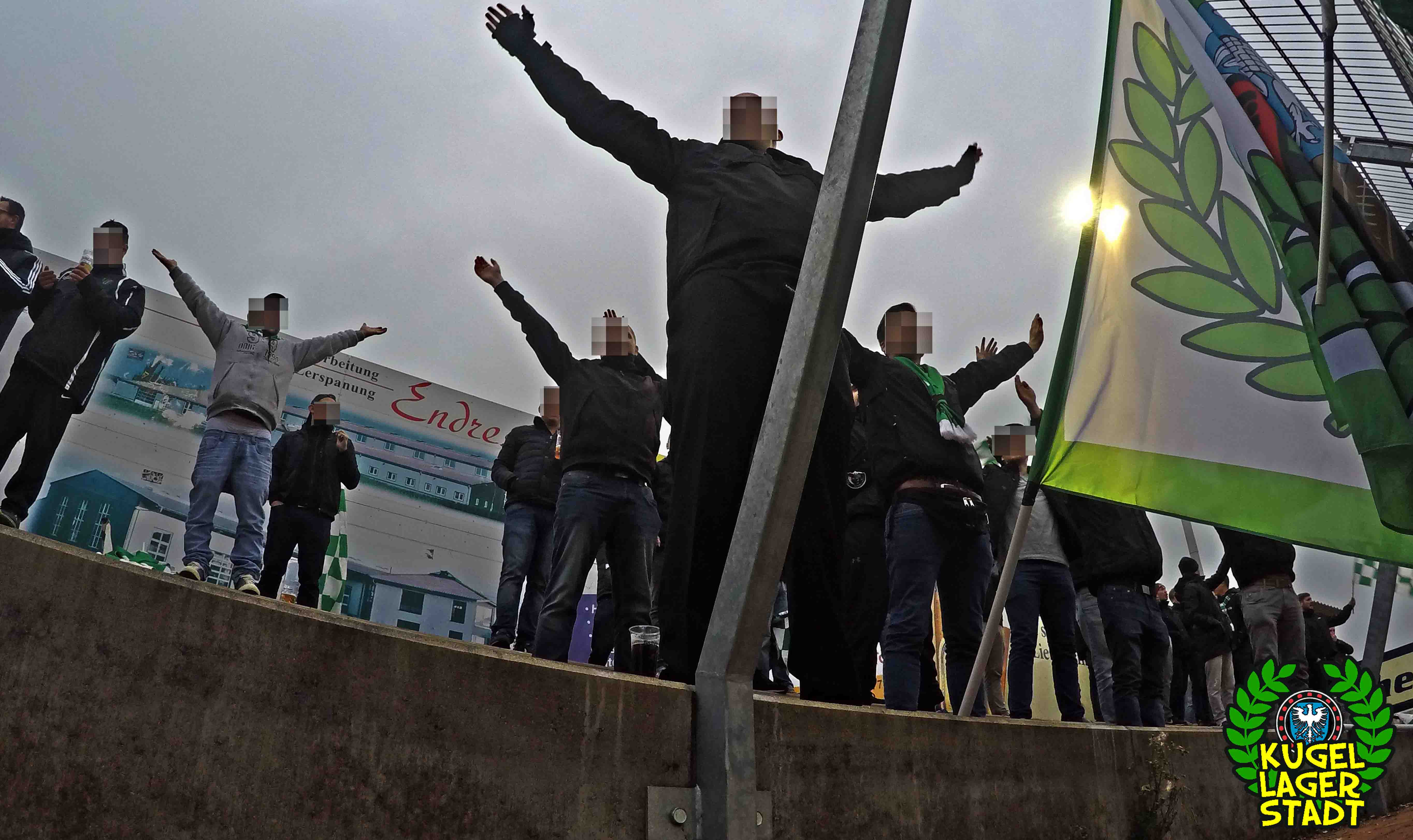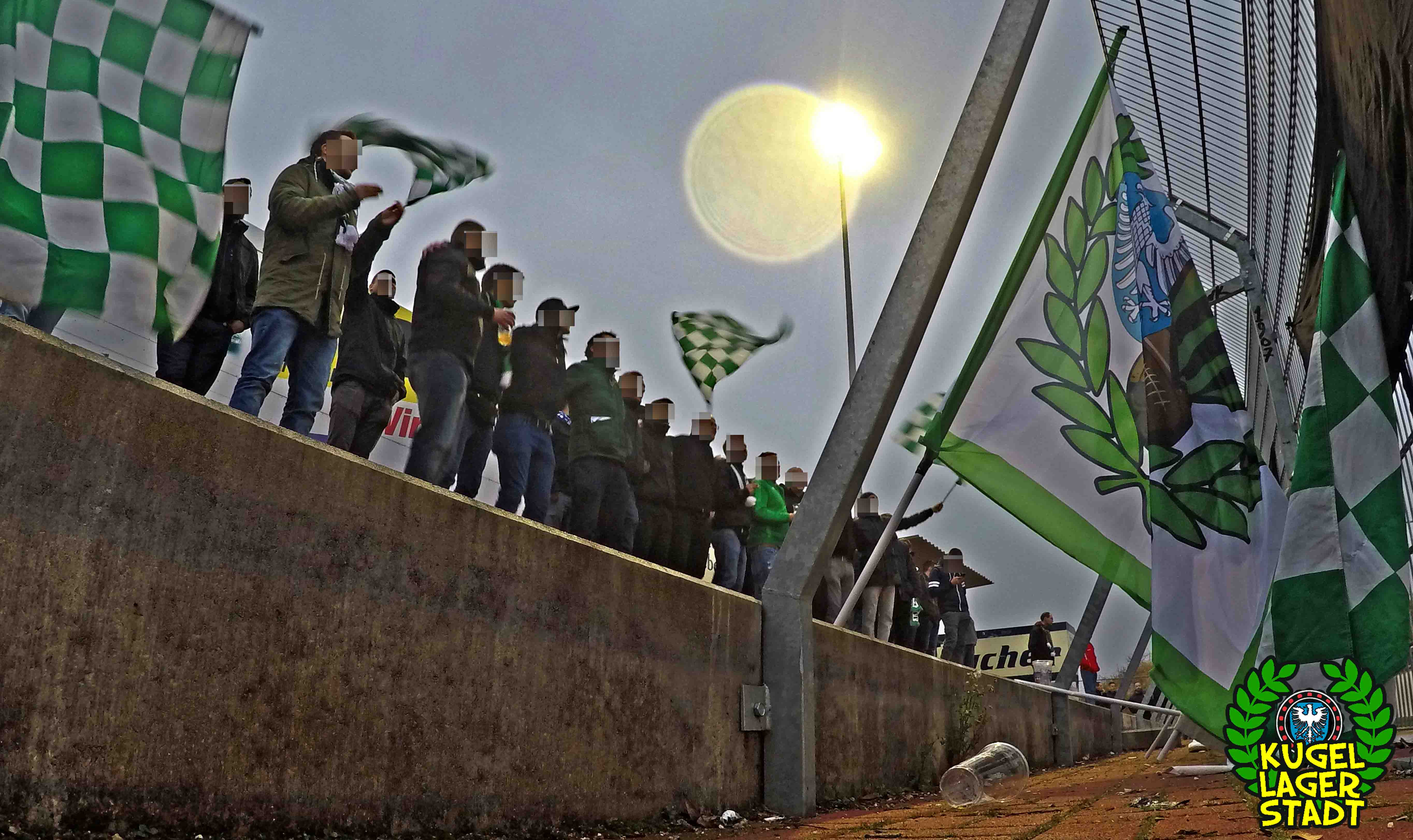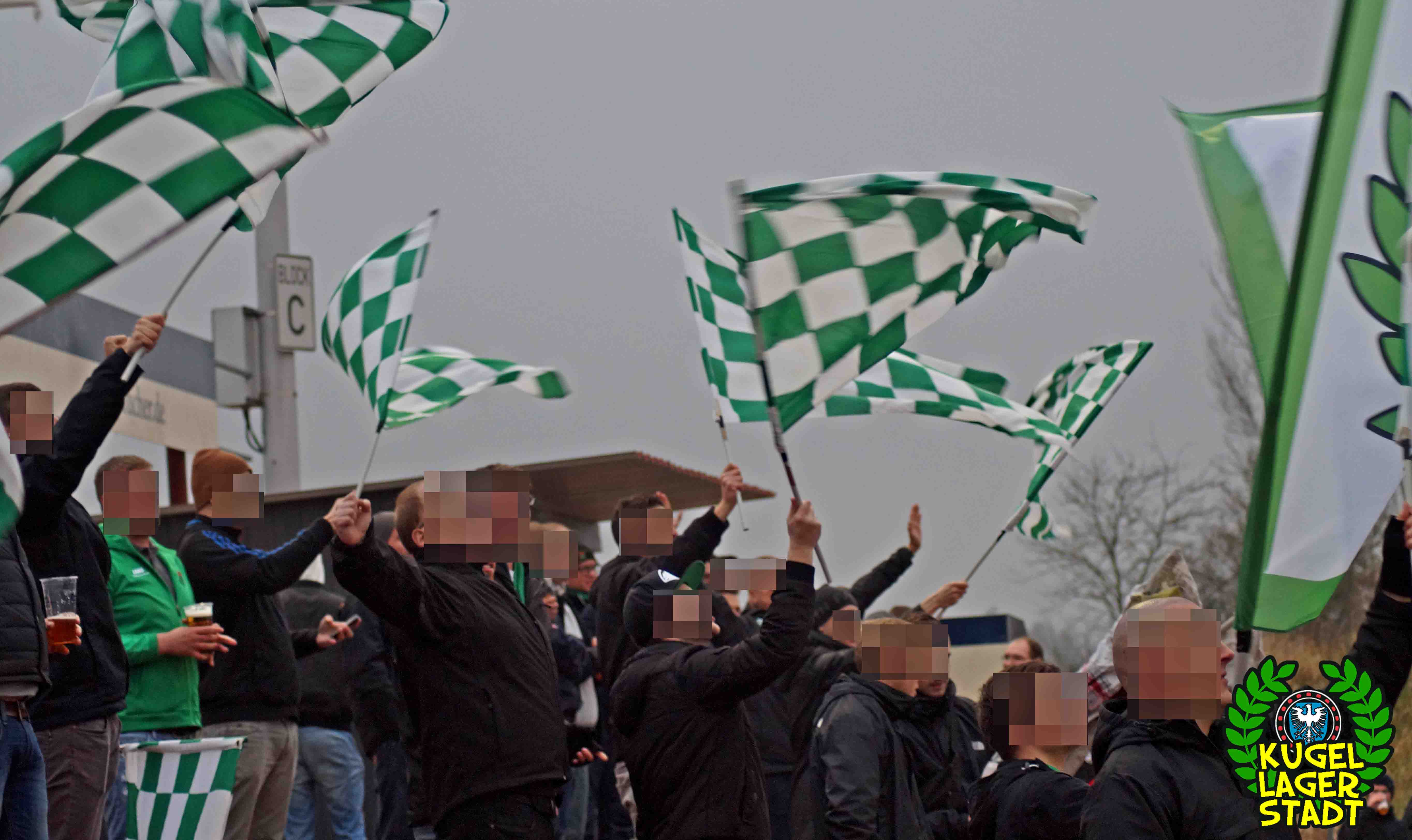 Die Stadtgrenze in Form der Hahnenhügelbrücke war gerade so passiert, als auch schon die Toilettentür streikte. Einfach so, ohne jegliche Fremdeinwirkung, so munkelt man. Nach zwei kurzen Zwischenstops, welche zur Aufnahme weiterer Mitreisender führten und unseren sogenannten Busfahrer zu vogelwilden Rangiermanövern an der ARAL-Tankstelle zwangen (O-Ton: „Ach du Schei**, was fährt der denn zusammen? Hat mal jemand kontrolliert, ob der gute Mann nüchtern ist?!“) kam letztendlich ein gutgelaunter Schnüdelbus am Zielort (nicht München!) an. Für die angehenden Geographen unter uns: Seligenporten ist ein Ortsteil des Marktes Pyrbaum im oberpfälzischen Landkreis Neumarkt in der Oberpfalz und liegt ca. 20 Kilometer südöstlich von Nürnberg. Laut Wikipedia beherbergt Seligenporten zum 25. Mai 1987 (!) genau 1001 Einwohner, wenn man der Lügenpresse an dieser Stelle glauben schenken darf. Aktuellere Zahlen waren ohne harte Rechereche nicht aufzutreiben. Schade eigentlich. Über einen Feldweg ging es einmal rund um die MAR-Arena, bis der Bus schließlich punktgenau vor einem Misthaufen (!) zum Stehen kam. Handgezählte 4 Polizeibusse und 3 Polizei-PKW samt schwarz gekleideter Besatzung (ca. 20) nahmen uns vor diesem Misthaufen (angenehm zurückhaltend) in Empfang. Ein Beitrag bezüglich Steuerverschwendung in Mario Barths investigativer Show „Mario Barth deckt auf“ dürfte uns bzw. dem bayerischen Staat damit eigentlich sicher sein. Bevor es für ermäßigte sieben Euro in die Südkurve den Gästeblock ging, wurden noch die drei Dixis mit Schweinfurter Aufklebern bekannt gemacht, sorry, leider geil. Nachdem noch schnell einigen bekannten Schweinfurter Gesichtern auf der benachbarten Tribüne „Servusla“ gesagt wurde und die neuerworbene GoPro zielsicher in Stellung gebracht wurde, pfiff der Schiedsrichter die Partie an.