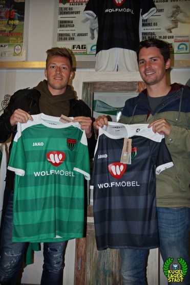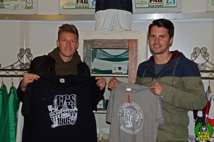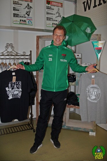 Berlin, Berlin – wir fahren nach Berlin. Also zuerst nach Burghausen, aber dann ganz sicher nach Berlin. Muss ja! Um für den kommenden Saisonendspurt auch klamottentechnisch gut gerüstet zu sein, lohnt sich beim morgigen Heimspiel ein Blick in den neuen Fanshop! Die brandneuen Shirts – hier vorgeführt von Marius „Willi“ Willsch, Nicolas Görtler und Joe Bechmann – sind in allen Größen von S bis XXL vorrätig und möchten in die weite Welt hinausgetragen werden. Produziert wurden die Shirts, die es zum Preis von 25 Euro zu erwerben gibt, vor der Haustüre, bei Com-Print in Niederwerrn. Und: Wer zum richtigen Zeitpunkt (ca. 30 Minuten vor Anpfiff) im Fanshop vorbeischaut, kann dort unseren Joe Bechmann (Motto: „Ein gutes Spiel dauert nur 60 Minuten“) antreffen. Aber Vorsicht: Joe grätscht scharf! Also auf, Ihr Haubentaucher aus der Niederwerrner Straße, ab in den Fanshop!