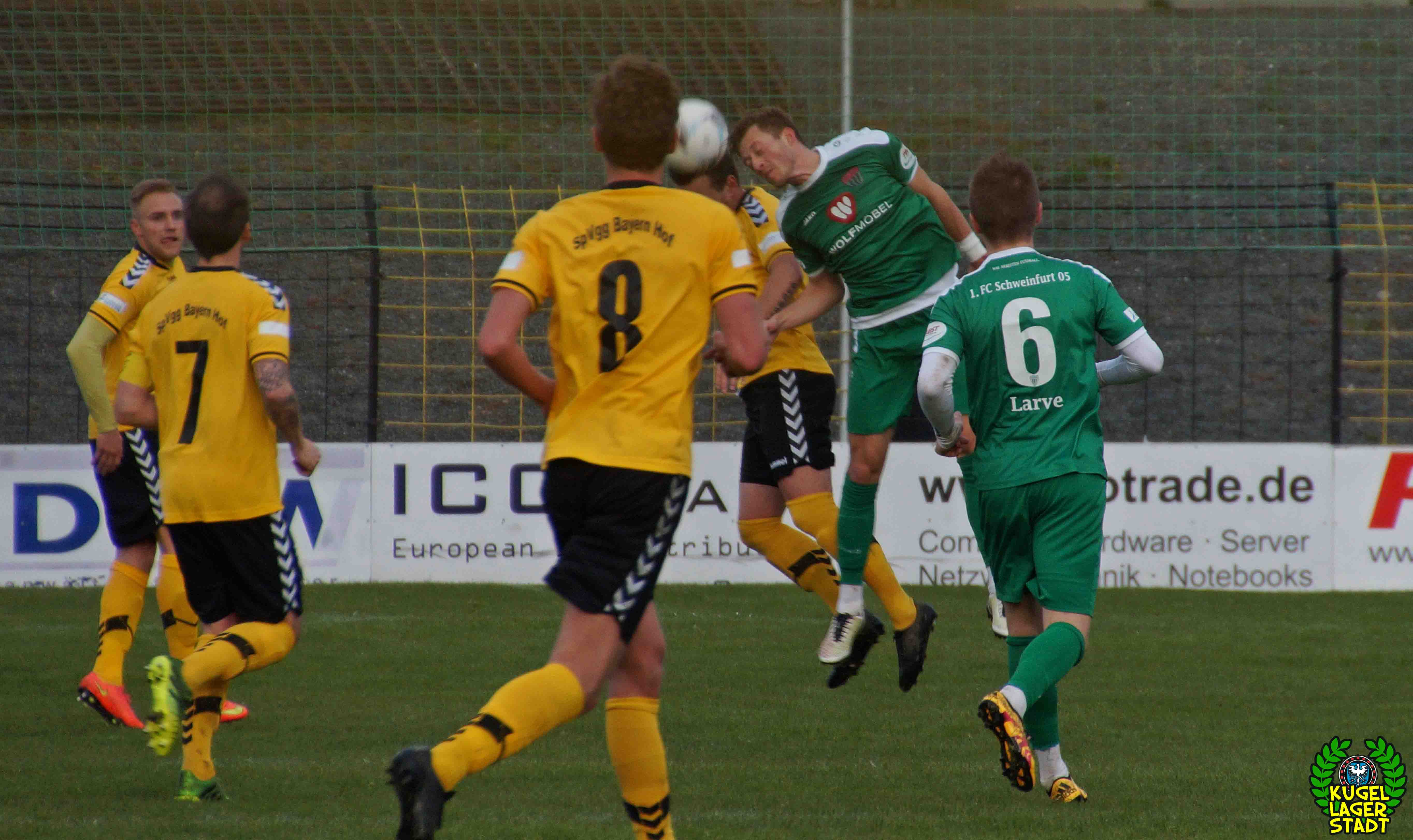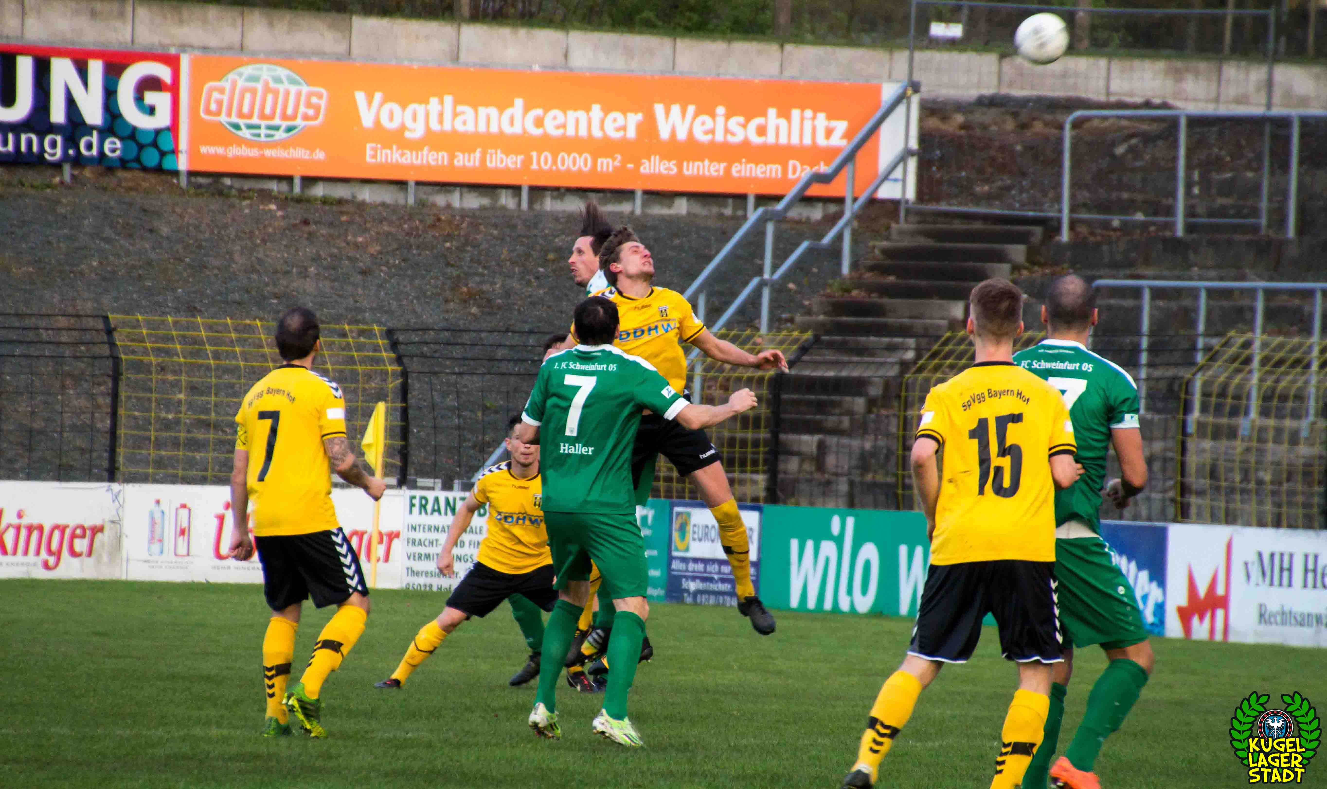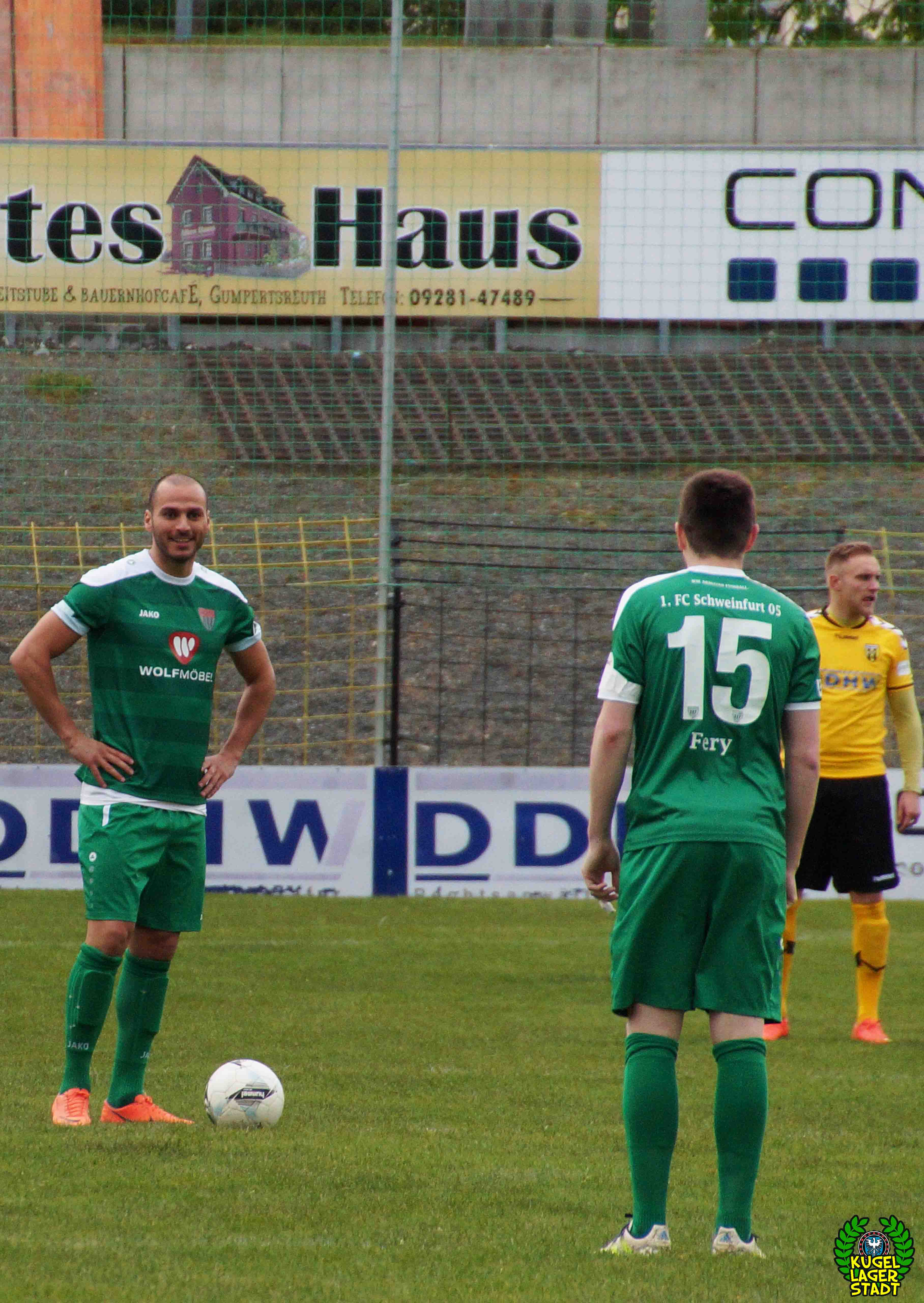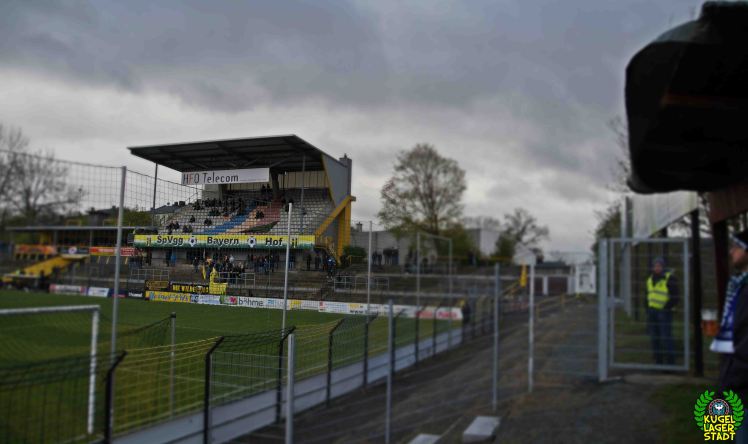 Die knapp zweistellige Anzahl an aktiven Hausherren am Wellenbrecher unterhalb der Tribüne schwenkte ausdauernd zwei Fahnen und versuchte sich am Support, was teilweise für die überschaubare Personenzahl ganz gut ankam. Beflaggt wurde neben einer Sektion-Stadionverbot-Zaunfahne auch mit den bekannten Britannia- und Die Wilde 13-Fahnen. Besser als nichts. Auf der gegenüberliegenden kleinen Tribüne waren die Mecker-Rentner zuhause, die natürlich in keinem anständigen Stadion fehlen dürfen. So mancher 05er auf dem Rasen durfte sich vermutlich so einiges anhören, manches Mal nicht ganz zu Unrecht. Der Support aus dem Gästeblock beschränkte sich gestern aus Gründen auf ein paar wenige „Schweinfurt“- und „FCS“-Rufe. Interessanter waren da schon die Interaktionen mit dem Hofer Publikum, hier nur soviel: Es hat Spaß gemacht! („Was seid Ihr?!“) Gegen Ende der Partie wurden besonders Adam Jabiri und Marino Müller („Tja, des hat er eben in Berch gelernt!„) für Ihre in der zweiten Hälfte mehr als engagierte Leistung gefeiert. Kritik an dieser Stelle: Da mit dem 4:3 auch rechnerisch der Klassenerhalt unter Dach und Fach war, hätte sich unsere Halbprofi-Truppe durchaus noch die 20 zusätzlichen Meter in Richtung Gästeblock bewegen können, da bricht sich keiner einen Zacken aus der Krone. Außer Doppelpacker Marino Müller und Goalie David Paulus („Paulus auf den Zaun!“) erschien niemand am Zaun. Ganz schwache Nummer! Setzen, sechs! Danke für Nichts!