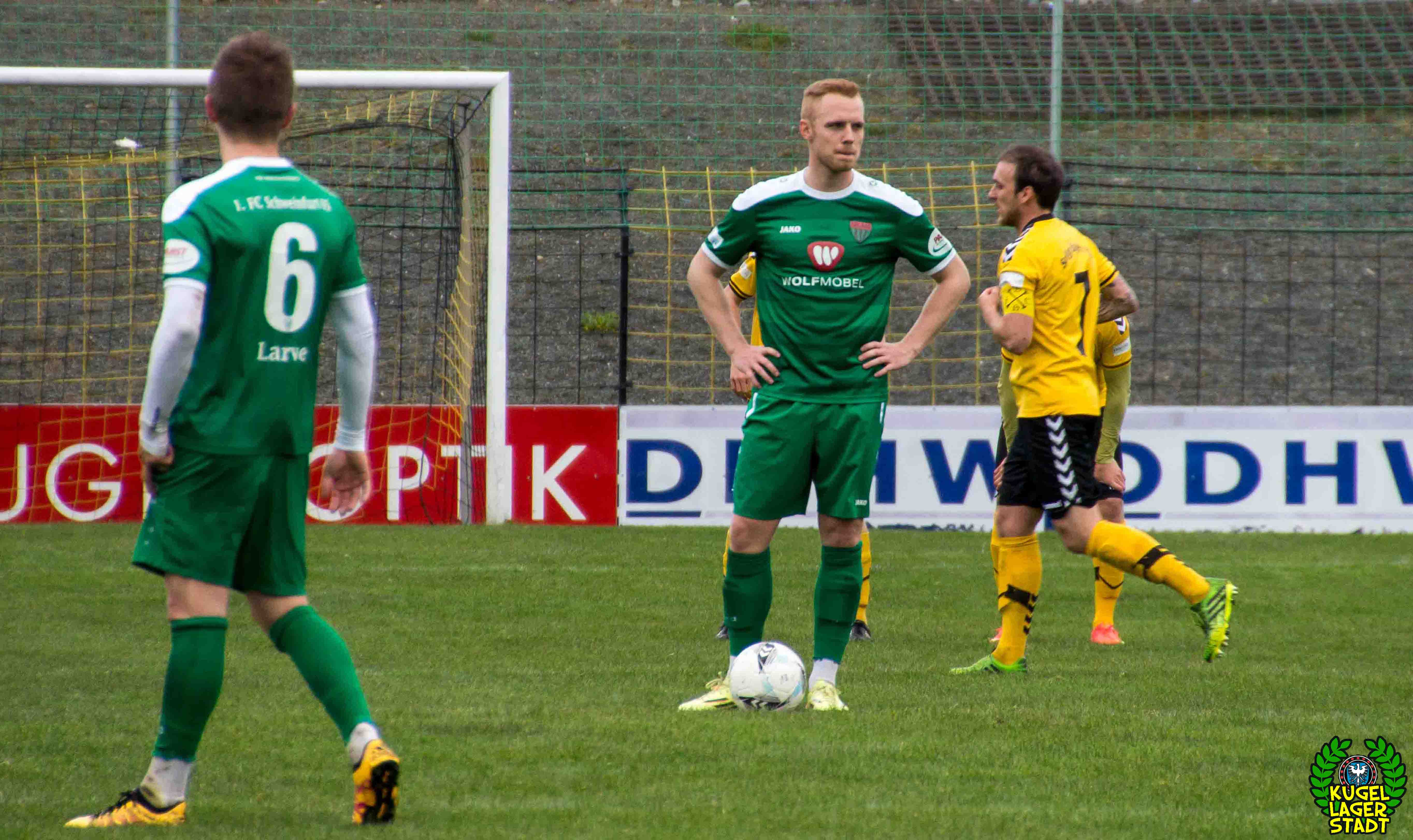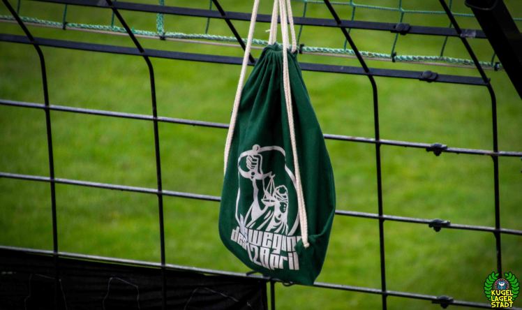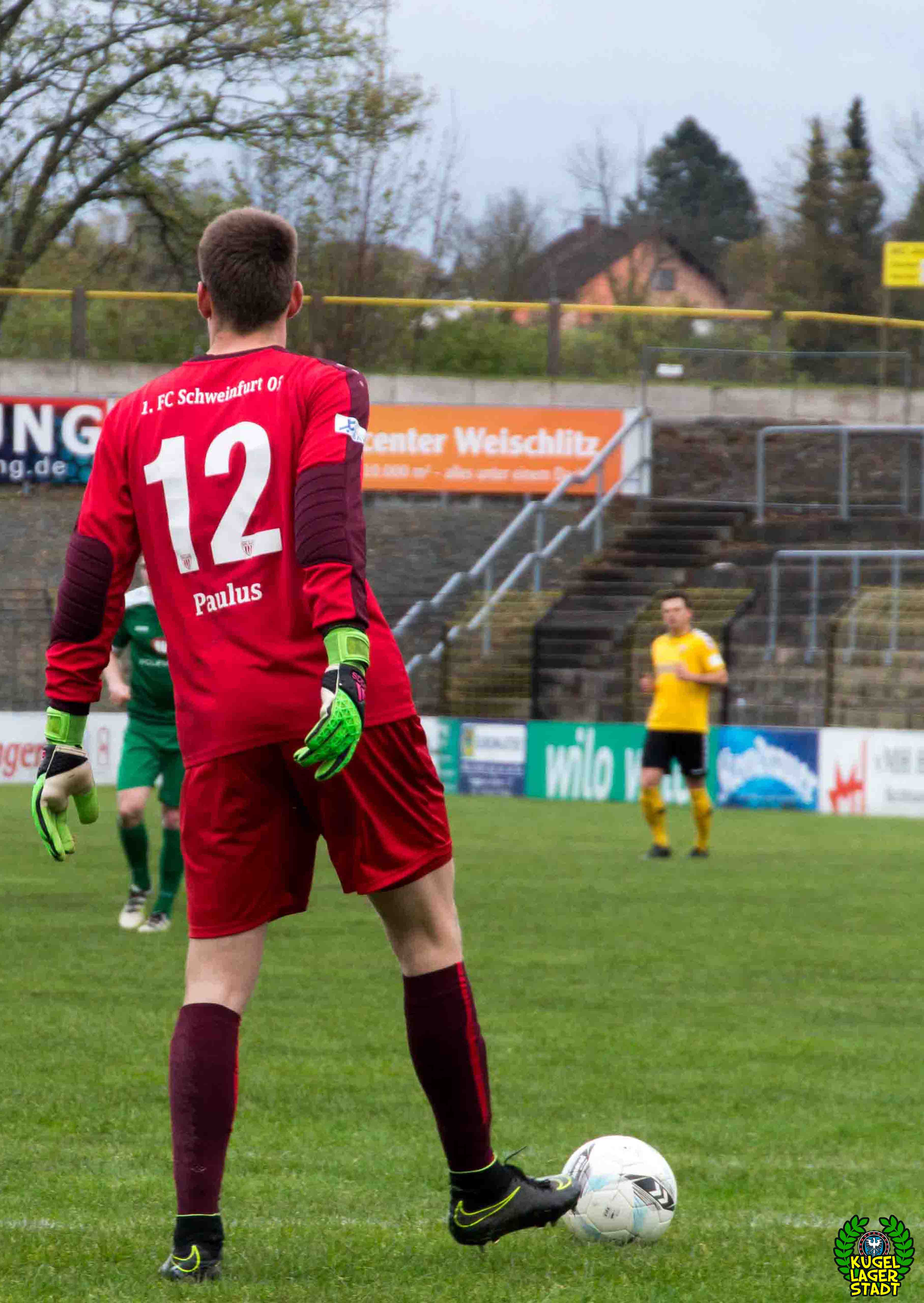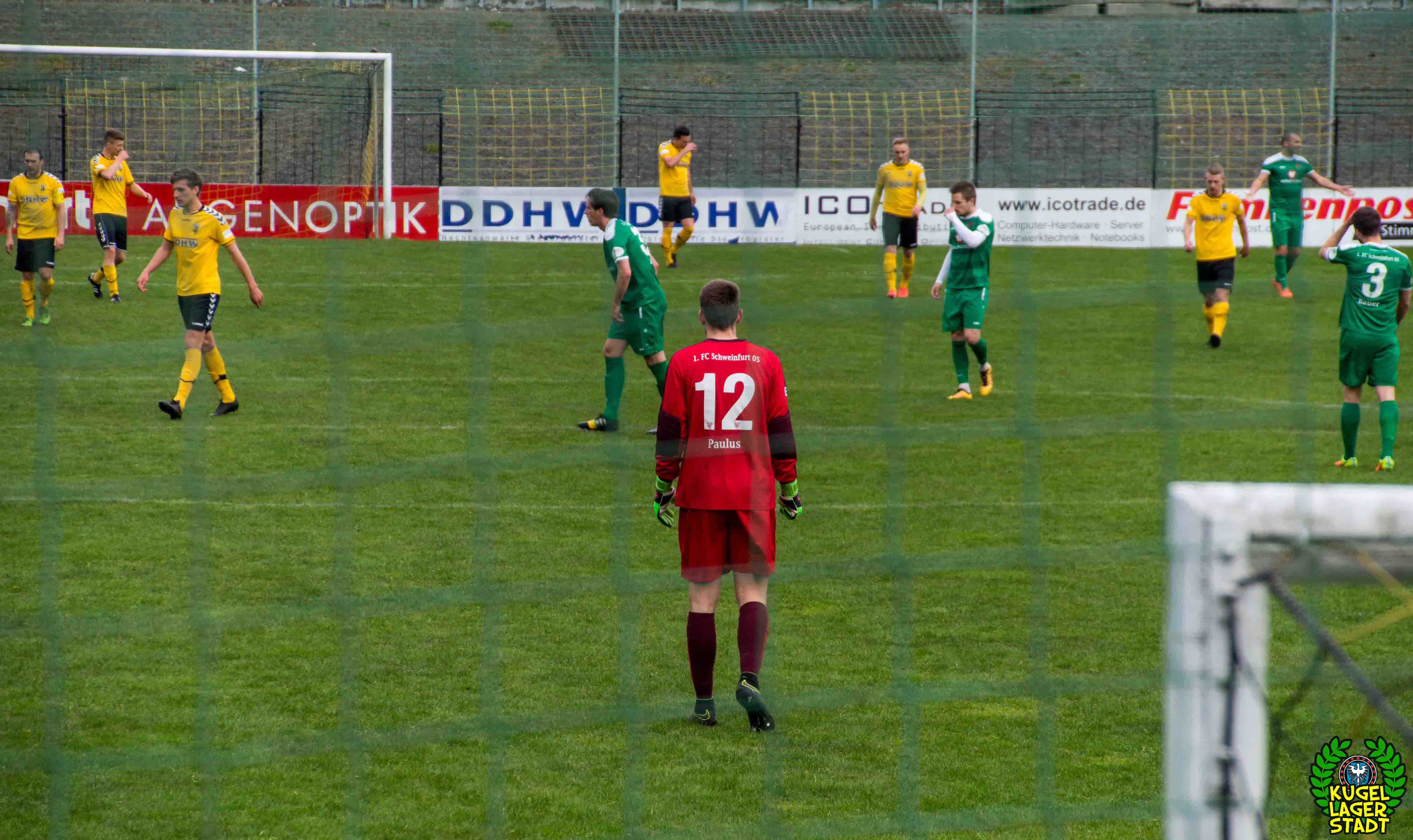 Die knapp zweistellige Anzahl an aktiven Hausherren am Wellenbrecher unterhalb der Tribüne schwenkte ausdauernd zwei Fahnen und versuchte sich am Support, was teilweise für die überschaubare Personenzahl ganz gut ankam. Beflaggt wurde neben einer Sektion-Stadionverbot-Zaunfahne auch mit den bekannten Britannia- und Die Wilde 13-Fahnen. Besser als nichts. Auf der gegenüberliegenden kleinen Tribüne waren die Mecker-Rentner zuhause, die natürlich in keinem anständigen Stadion fehlen dürfen. So mancher 05er auf dem Rasen durfte sich vermutlich so einiges anhören, manches Mal nicht ganz zu Unrecht. Der Support aus dem Gästeblock beschränkte sich gestern aus Gründen auf ein paar wenige „Schweinfurt“- und „FCS“-Rufe. Interessanter waren da schon die Interaktionen mit dem Hofer Publikum, hier nur soviel: Es hat Spaß gemacht! („Was seid Ihr?!“) Gegen Ende der Partie wurden besonders Adam Jabiri und Marino Müller („Tja, des hat er eben in Berch gelernt!„) für Ihre in der zweiten Hälfte mehr als engagierte Leistung gefeiert. Kritik an dieser Stelle: Da mit dem 4:3 auch rechnerisch der Klassenerhalt unter Dach und Fach war, hätte sich unsere Halbprofi-Truppe durchaus noch die 20 zusätzlichen Meter in Richtung Gästeblock bewegen können, da bricht sich keiner einen Zacken aus der Krone. Außer Doppelpacker Marino Müller und Goalie David Paulus („Paulus auf den Zaun!“) erschien niemand am Zaun. Ganz schwache Nummer! Setzen, sechs! Danke für Nichts!