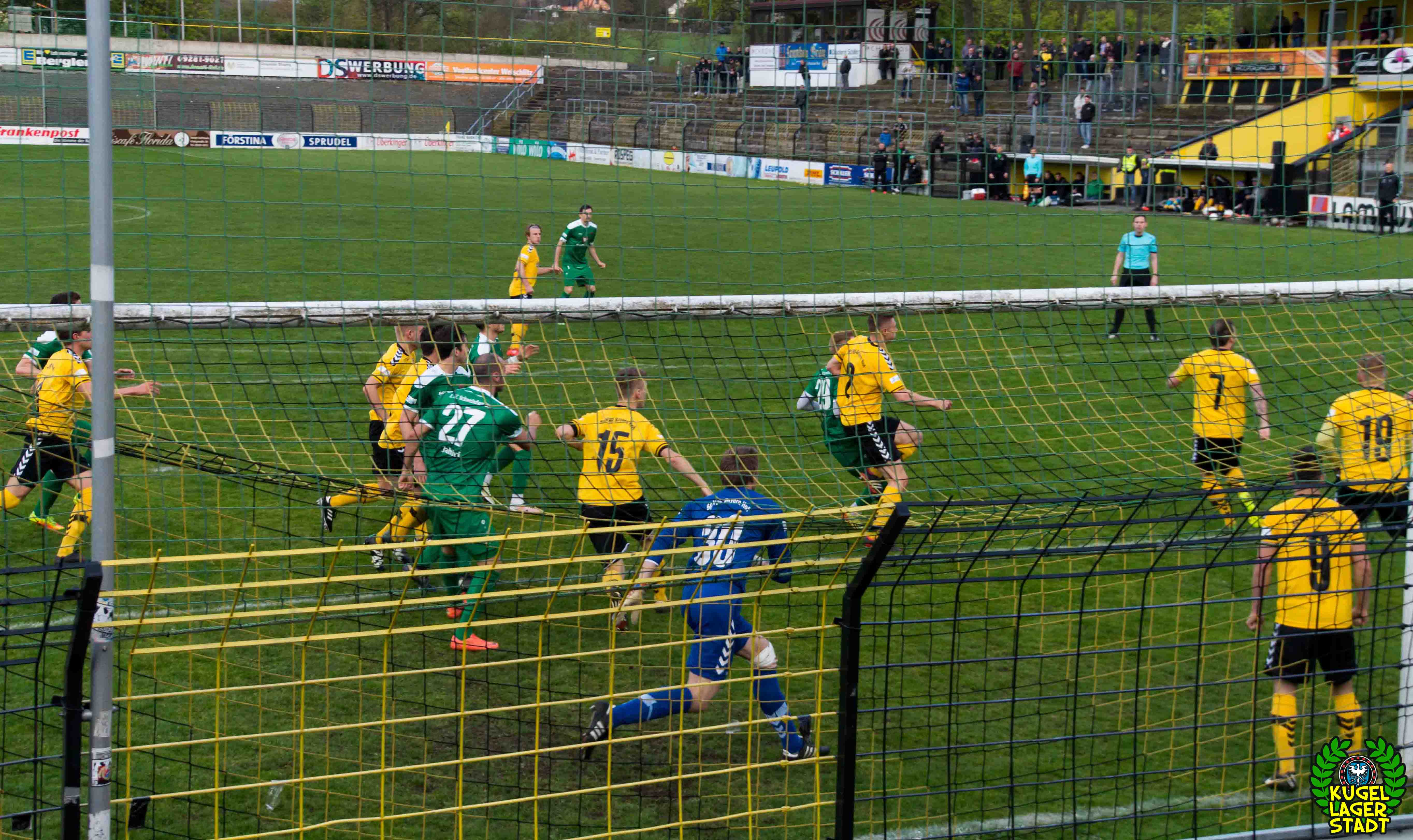 „Auswärts sind wir stärker als in der Fremde“ – Carsten Fuss. Und weil dem eben so ist, fanden sich gestern ganz starke neun (!) Schnüdel im Gästeblock der Grünen Au ein. Viel ist anders. Und trotzdem machte der Abend im Block irgendwie verdammt viel Spaß. Ein an manchen Stellen tatsächlich blauer (!) Himmel, das hatte es in Hof zuletzt am 22. Mai 1968 gegen Rot-Weiss Essen gegeben. Nette und redefreudige Ordner, ein improvisierter Bierausschank, an dem so mancher Schnüdel sein Bier selbst öffnen durfte, VIP-Stehplätze im Ausschank inklusive und herrliches, gehaltvolles Gepöbel. So ganz nebenbei boten die Akteure auf dem Rasen Slapstick-Einlagen vom Allerfeinsten, was am Ende zu deutlich mehr als den sieben gefallenen Treffern hätte führen können, ja sogar hätte führen müssen. Pech für die ca. 30 Beamten der BePo-Nürnberg, die kurz nach Anpfiff Feierabend hatten und so beim ersten Hofer Treffer vermutlich schon auf der A9 in Richtung Heimat fuhren. Über die sportliche Leistung unserer grün-weißen Akteure in der ersten Hälfte sei an dieser Stelle der Mantel der Schande des Schweigens gehüllt, gute Laune und so. Hof agierte über weite Strecken definitiv nicht wie ein abgeschlagener Tabellenletzter und setzte unsere Mannschaft mit schnellem Umschalten so häufig gehörig unter Druck.