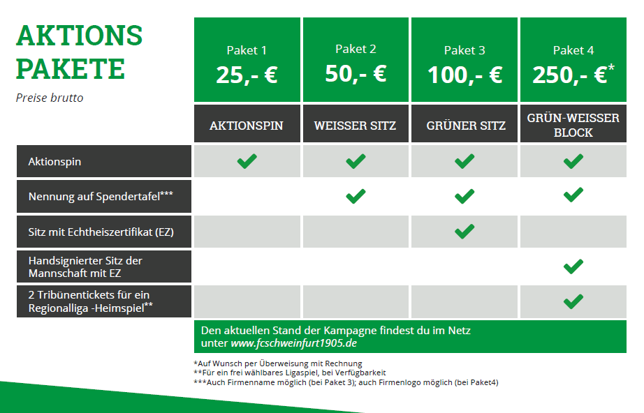 Das Grün und Weiß unserer Schnüdel spiegelt sich im weiten Rund höchstens in den Bäumen, im Rasen und den Trikots der Spieler wieder. Aber eine echte Identifikation mit dem Heimverein lässt die Tribüne doch schmerzlich vermissen. Gemeinsam wollen wir die Tribüne des Willy-Sachs-Stadions in unseren grün-weißen Farben erstrahlen lassen. Bereits ab einem Betrag von 25 Euro können sowohl Privatpersonen als auch Unternehmen Teil der Aktion „Grün-Weiße Tribüne“ werden. Als Dankeschön winken dem Spender in unseren vier Aktionspaketen einzigartige Sammlerstücke, wie der limitierte Aktionspin, einer der alten Sitze mit Echtheitszertifikat als Andenken, Eintrittskarten und natürlich eine Nennung auf unserer Spendertafel.