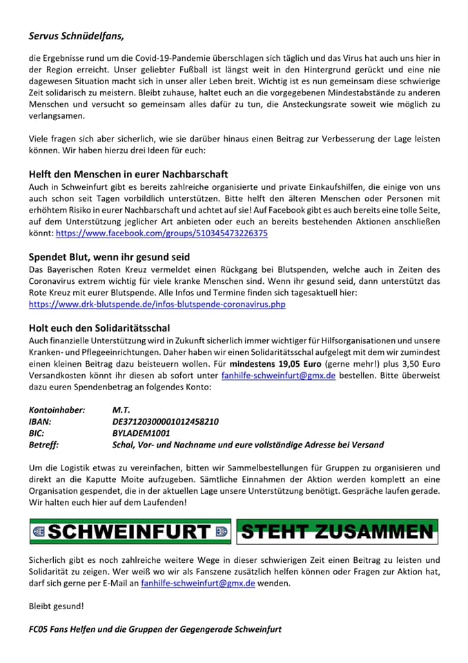 Wir appellieren mit diesem Schreiben an alle: Vereinsführung, Spieler, Ehrenamtliche, Mitglieder und jeden Stadiongänger und jeden, der unsere Schnüdel ebenso wie wir im Herzen trägt: Bitte bleibt in der momentanen Lage besonnen! Handelt reflektiert und vernünftig! Meidet die Öffentlichkeit (Abstand halten, keine Menschenansammlungen, keine Gruppen), haltet euch an Hygienevorschriften, tätigt keine Hamsterkäufe und kümmert euch um eure Liebsten, wie Eltern und Großeltern! Wer in dieser Zeit unter Ängsten und psychischen Problemen leidet, ihr seid nicht alleine! Wendet euch an Familie und Freunde oder an die bekannten Stellen: