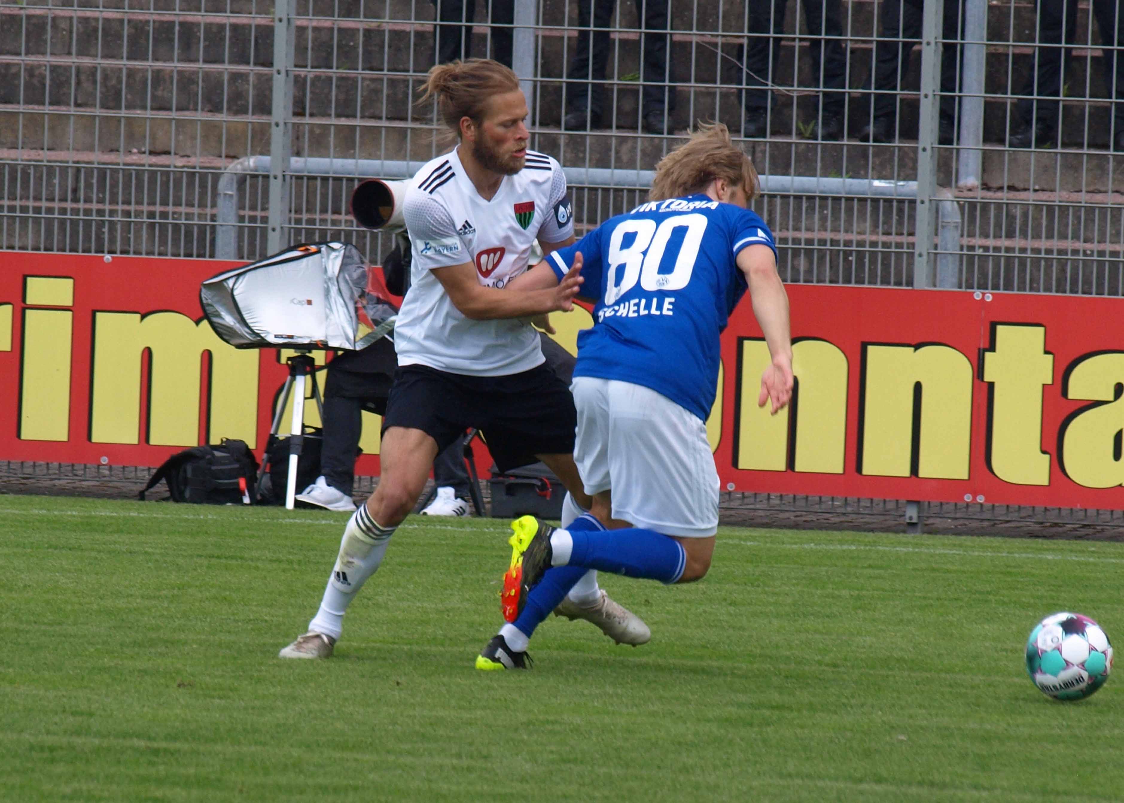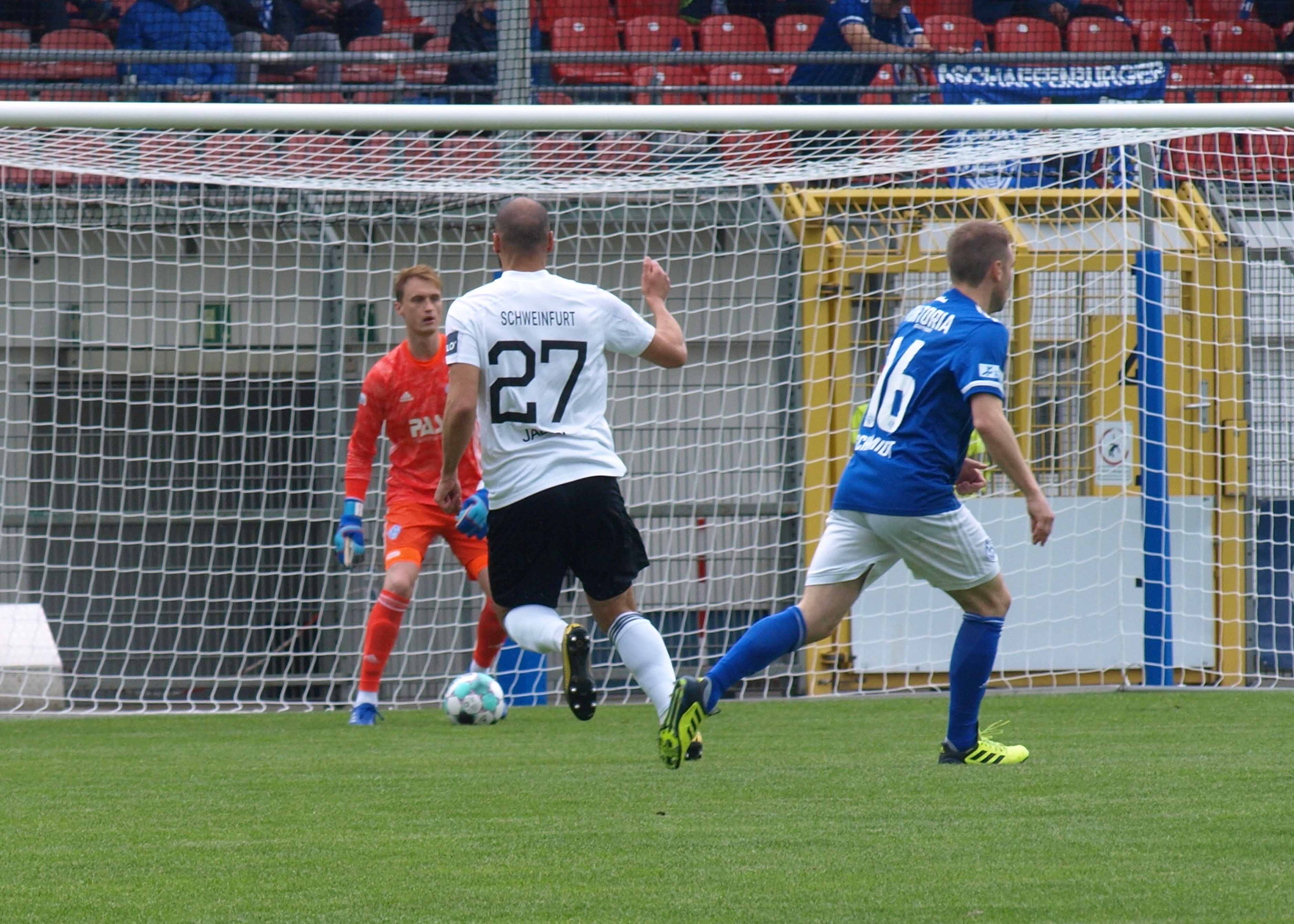 Im ersten Spielabschnitt entwickelte sich von Anfang an ein intensives und zweikampfbetontes Spiel. Den besseren Start erwischte die Viktoria, die in Person von Marcel Schelle erstmals gefährlich wurde, doch sein cleverer 40-Meter-Heber war etwas zu hoch angesetzt. Nach gut einer Viertelstunde kamen die Schweinfurter besser ins Spiel und übernahmen die Kontrolle über das Geschehen – ohne jedoch wirklich gefährlich vor das Tor von Heim-Keeper Birk zu kommen. Bis Minute 30 konnte lediglich ein Flachschuss von Martin Thomann als Torchance verzeichnet werden. Doch mit der nächsten Aktion machte es der linke Flügelspieler besser! Nach herrlicher Kombination über Jabiri und Haas, musste Thomann nur noch einschieben (30.). Knapp eine Zeigerumdrehung später dann die Doppelchance durch Amar Suljic, den Vorsprung auszubauen. Doch die Schweinfurter Nummer 11 scheitert zunächst an der Ungenauigkeit im eigenen Abschluss, und im Anschluss im Eins gegen Eins an Keeper Birk. Es kamen leichte Erinnerungen an das Spiel gegen Bayreuth auf – insbesondere nach der Drangphase der Viktoria kurz vor der Halbzeitpause. Bei Schelles Kopfball nach einem weiten Abwurf, musste die Hintermannschaft um Keeper Luis Zwick schon kräftig durchatmen.